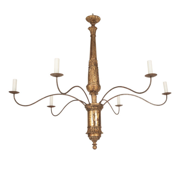 Six-arm walnut Italian chandelier, hand-carved and turned from walnut, Graceful...