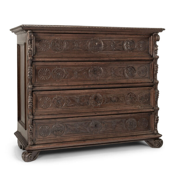 17th century French walnut chest of drawers (circa 1675-1700) hand-carved in a provincial Louis XIII style (Mannerist with Italian influence). Measures H 52 in x W 61.5 in x D 25.5 in. (Ref. M517.0226)