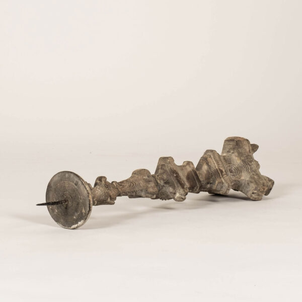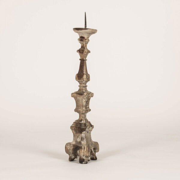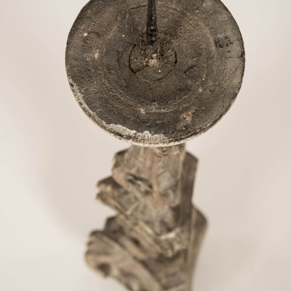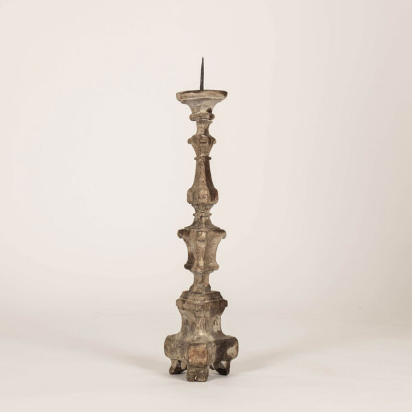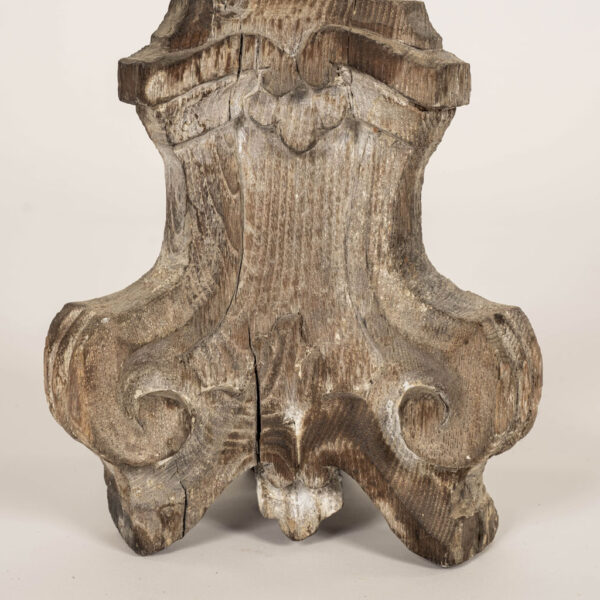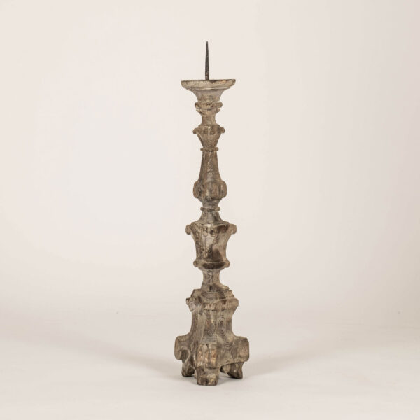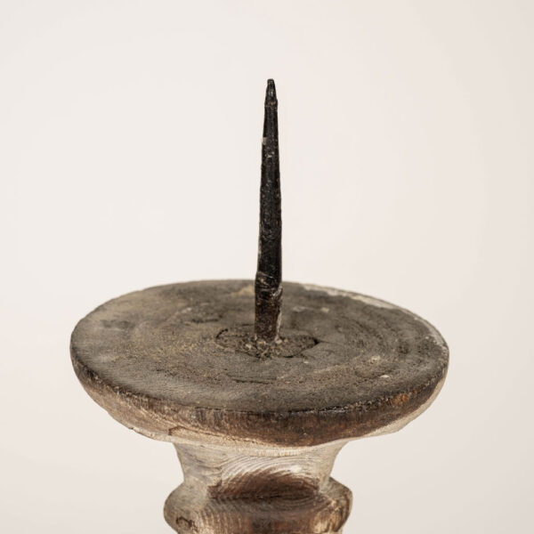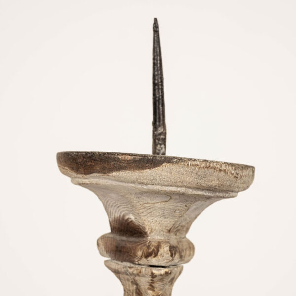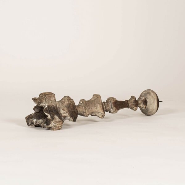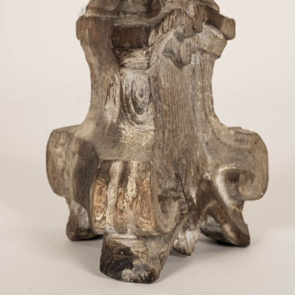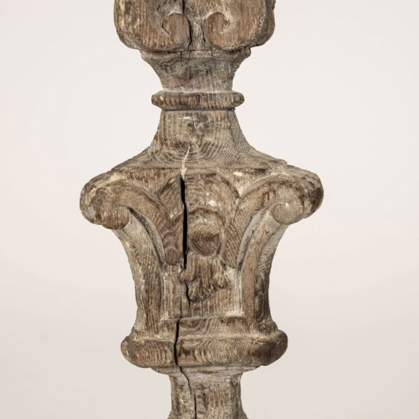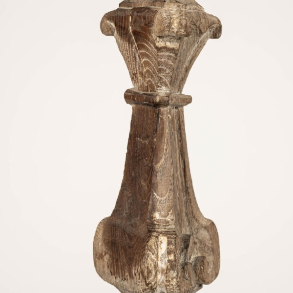 18th century altarstick with remnants of gesso clinging to woodgrain and the crevises of its carved surface.