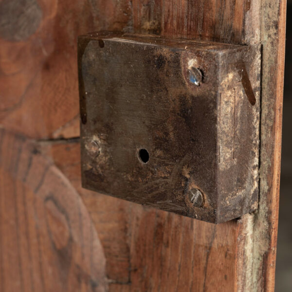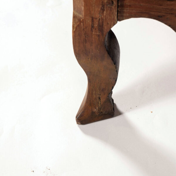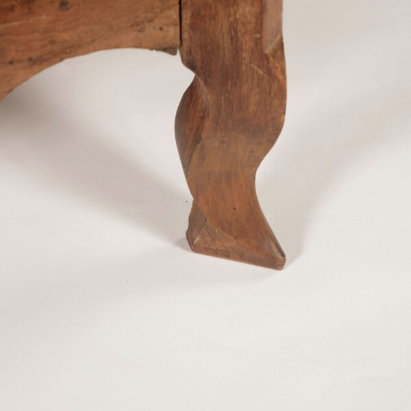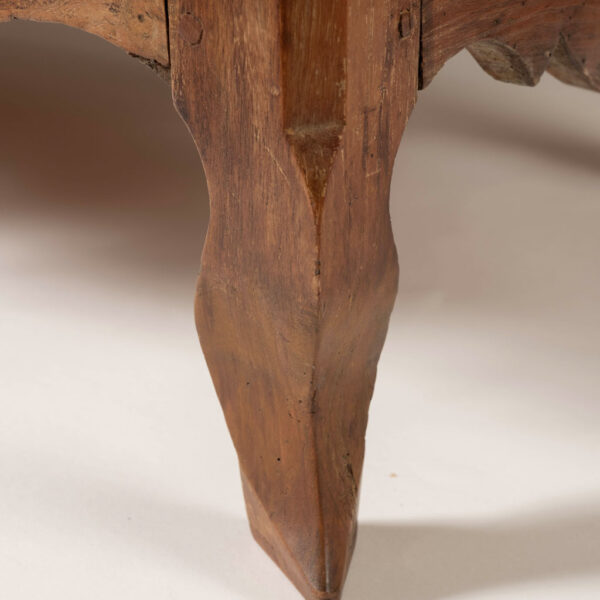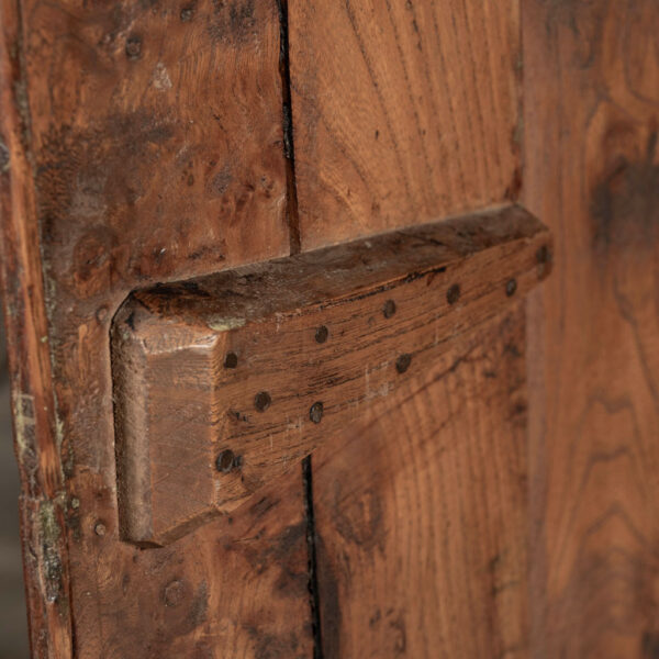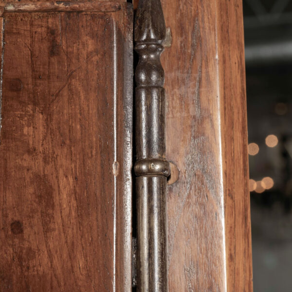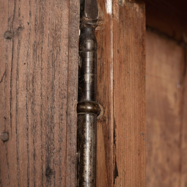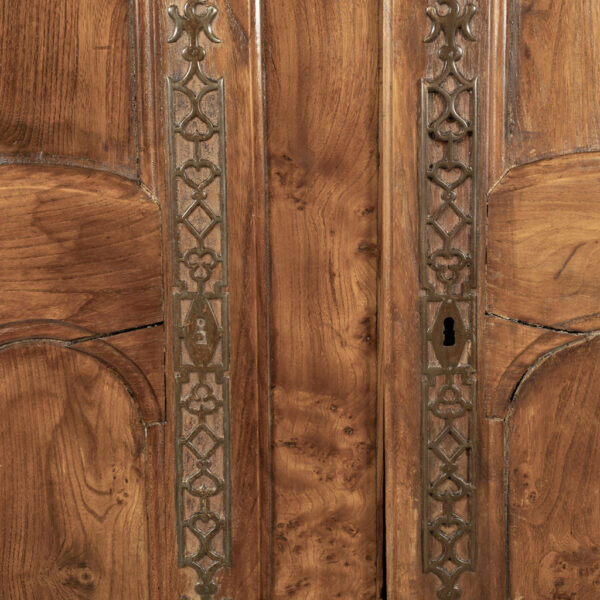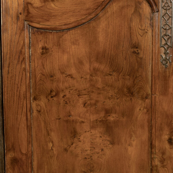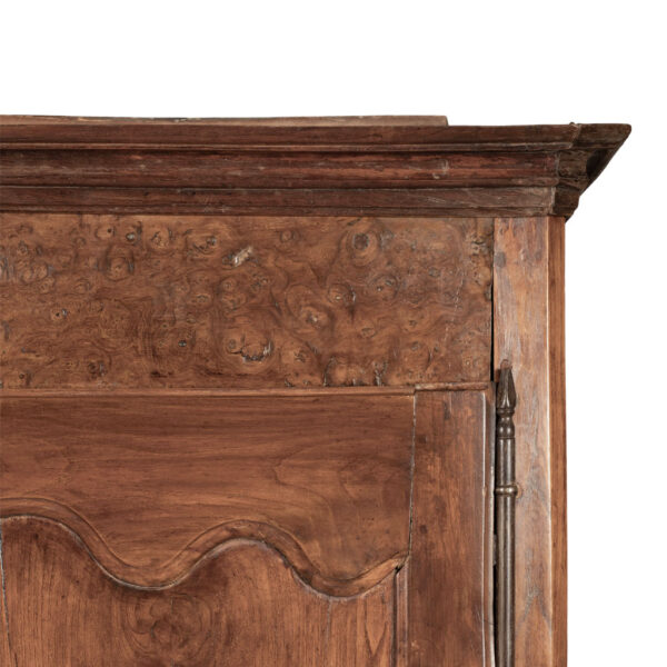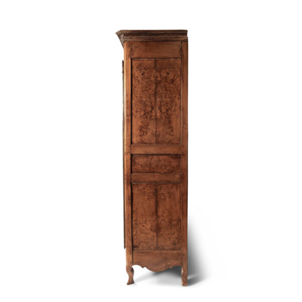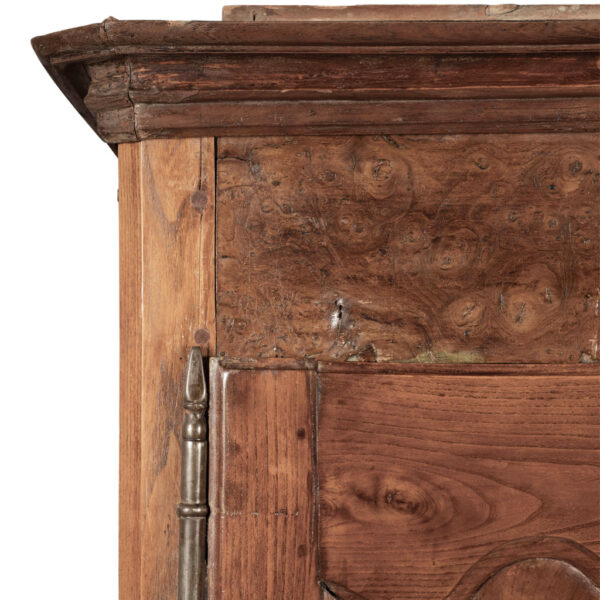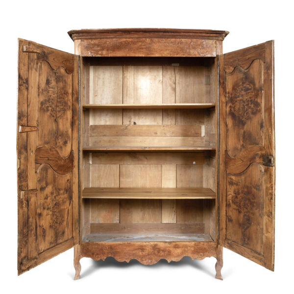 18th century armoire in olive wood and ash. Circa 1740 armoire in joined construction. Gorgeous burl olive wood apron, door panels and upper frieze. Ash as secondary wood. Three interior shelves. Wonderful simple carving. Unusually shaped hoof feet. Sturdy, stable. all original with exception of shelves.