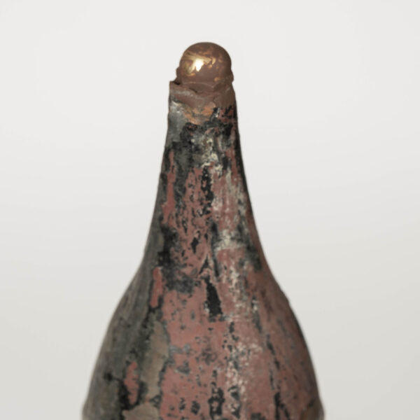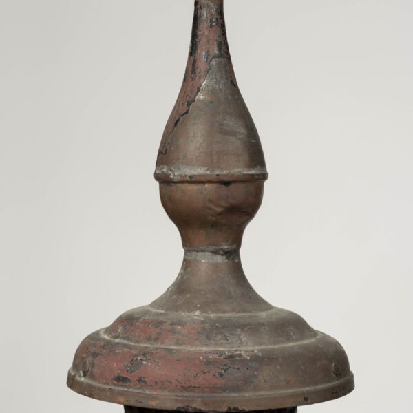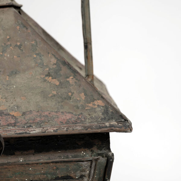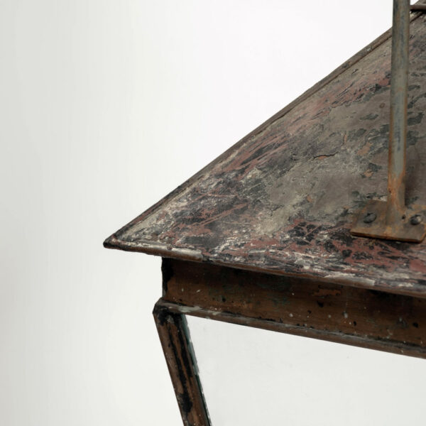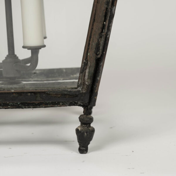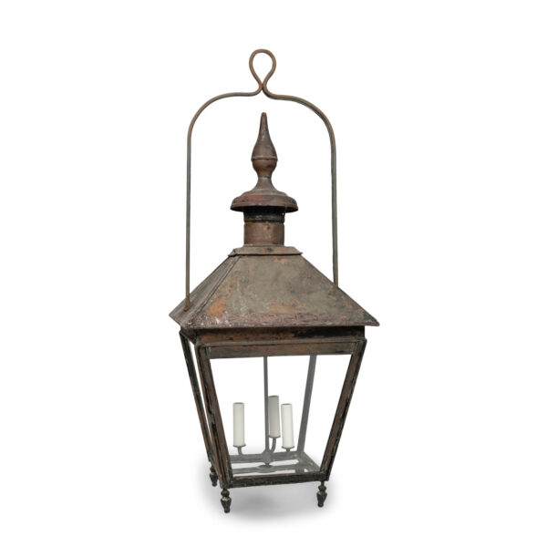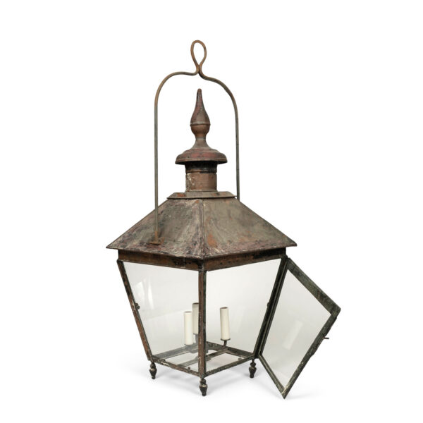 19th century French copper and glass paneled lantern circa 1850-1889. Remnants of dark green and oxblood red paint over natural verdigris green and mottled gray patina and nice, large scale. Originally served as a gas-lit street lantern – now newly wired with a drop-cluster of three candelabra lights. Includes chain and a canopy.