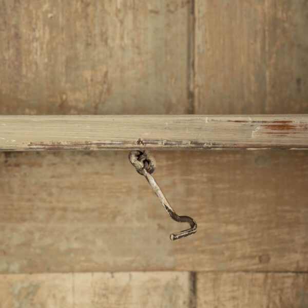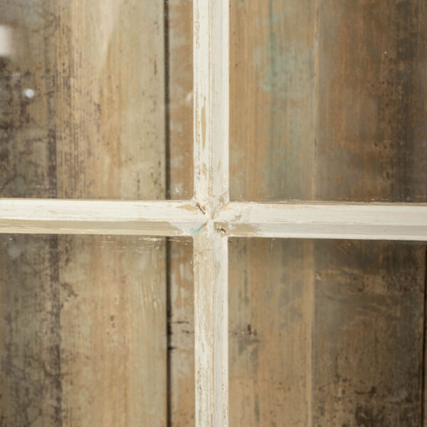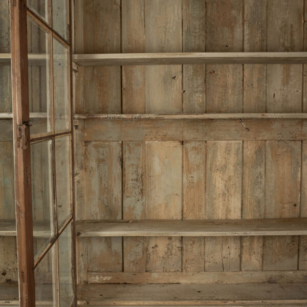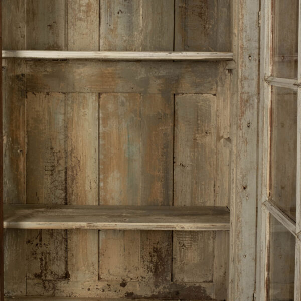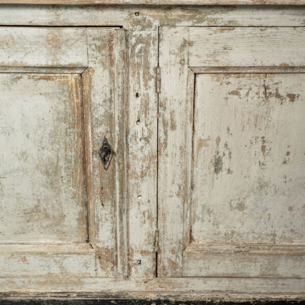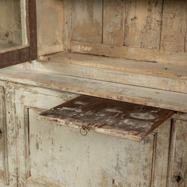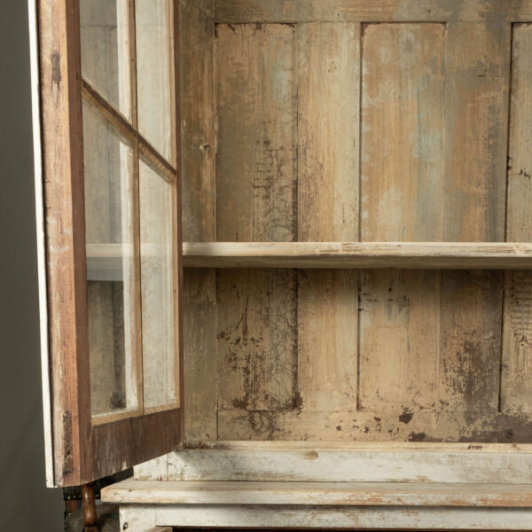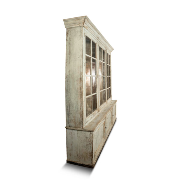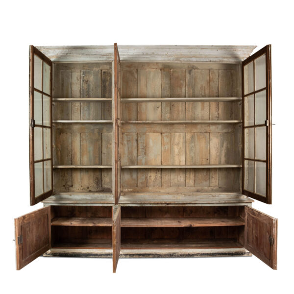 19th century painted bibliotheque from France. Hand-carved and painted bibliotheque with three upper glass paneled doors that open to reveal two storage spaces with three removable shelves each (shelves lined up behind window mullions). Lower cabinet with three doors. Working locks and keys.