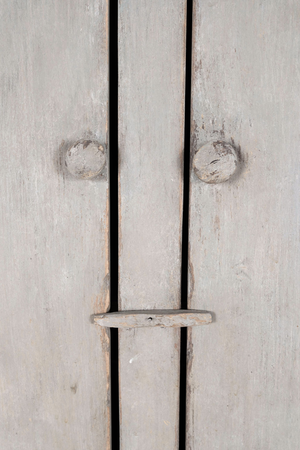 19th century painted primitive corner cupboard, or cabinet, constructed circa 1840-1859 in walnut with mortise and tenon joints. Painted finish is a greenish-white or greenish-light gray color.