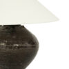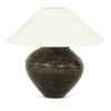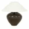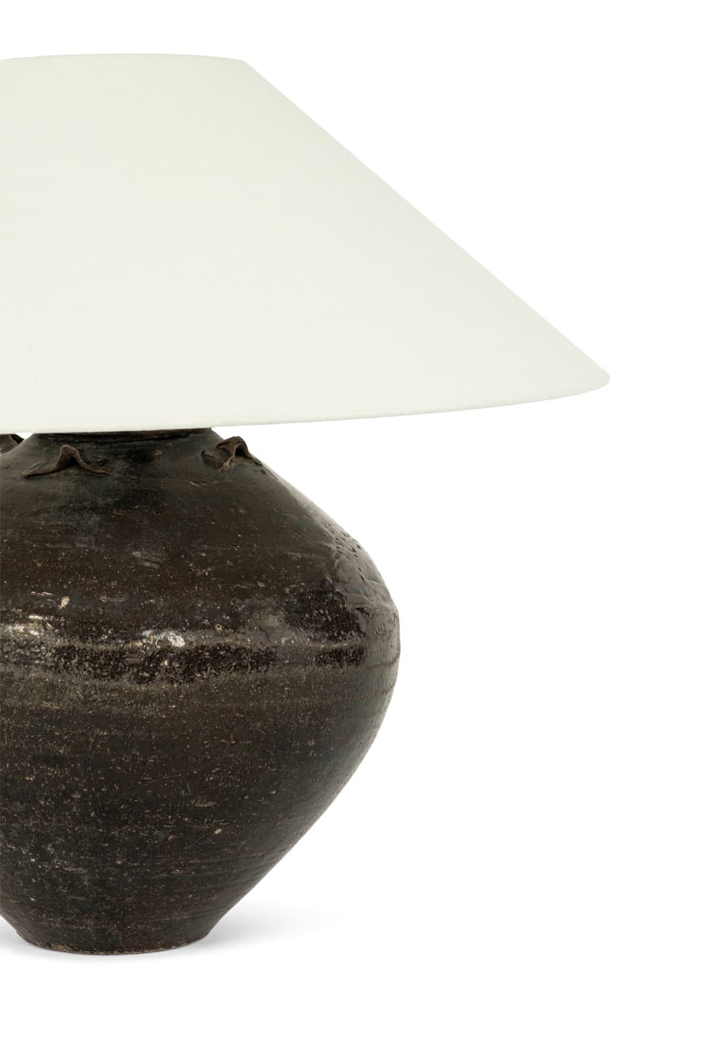 Antique Chinese vase lamp, in dark brown-olive green glaze with complimentary off-white linen Empire shade (listed measurements include shade). Newly wired, with line switch, for use within the USA.