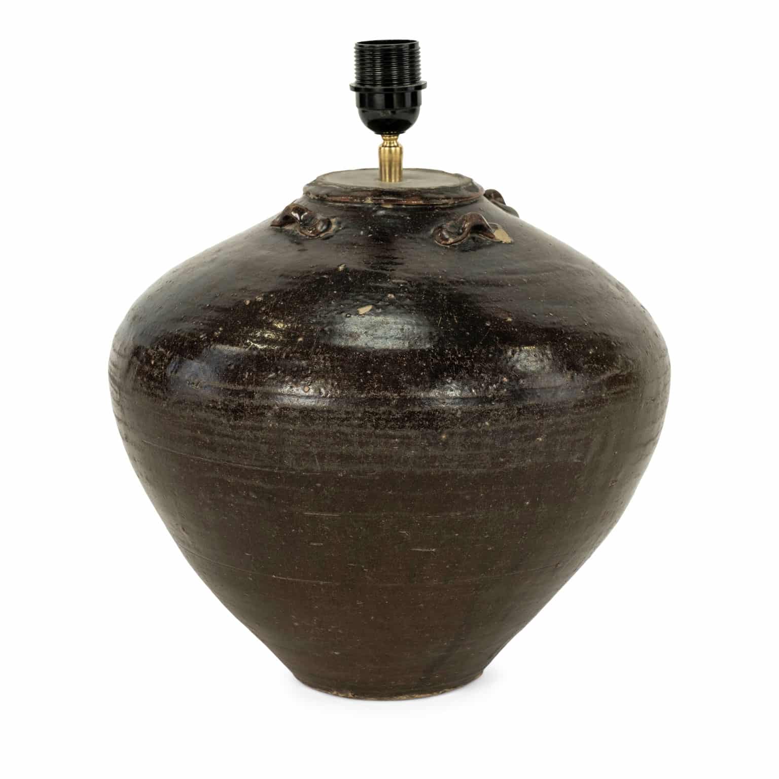 Condition details: Wear consistent with age and use. Faded finish and imperfections in glaze. Newly created lamp from antique jar.