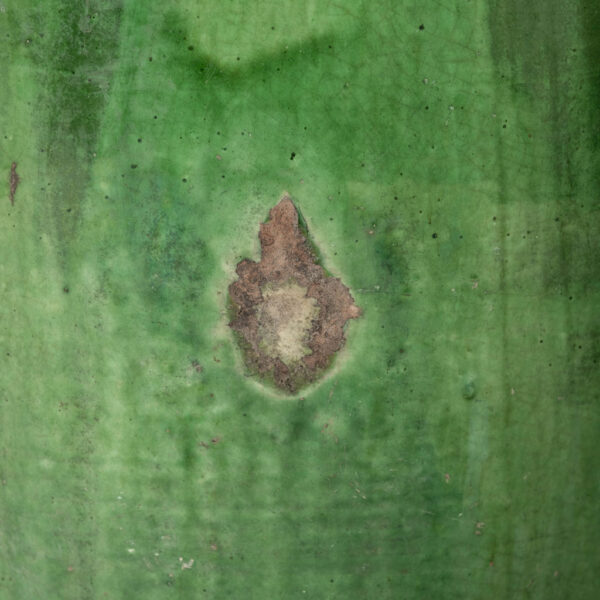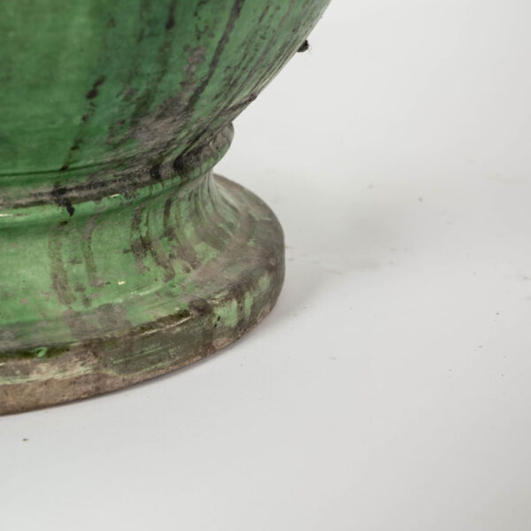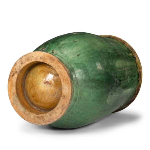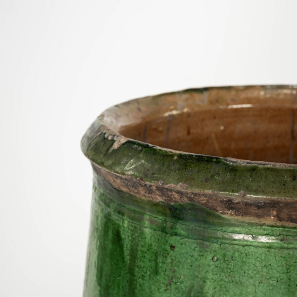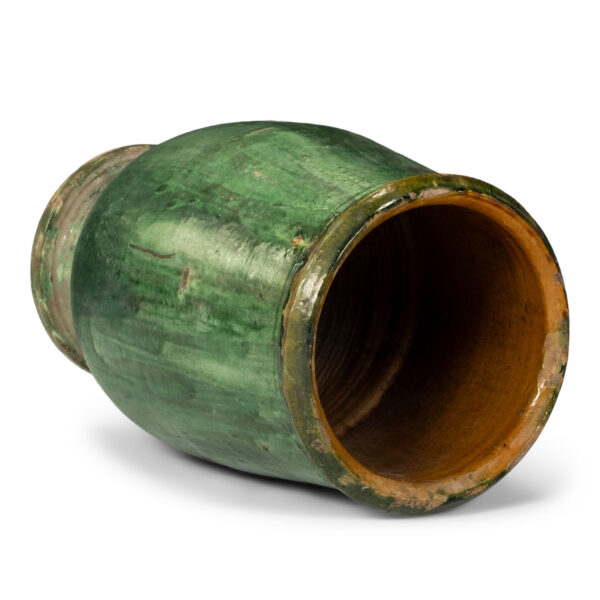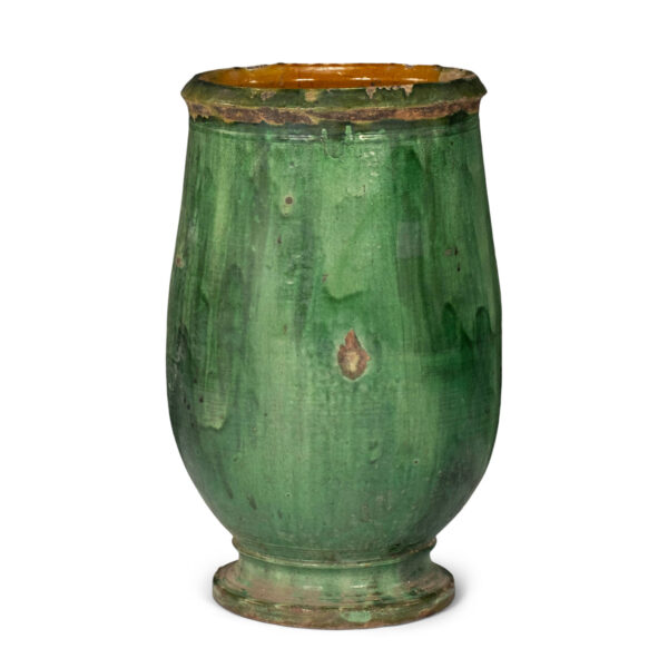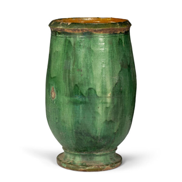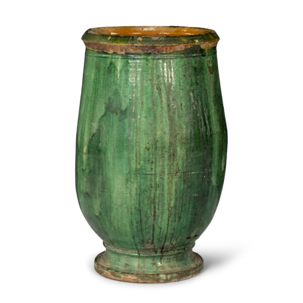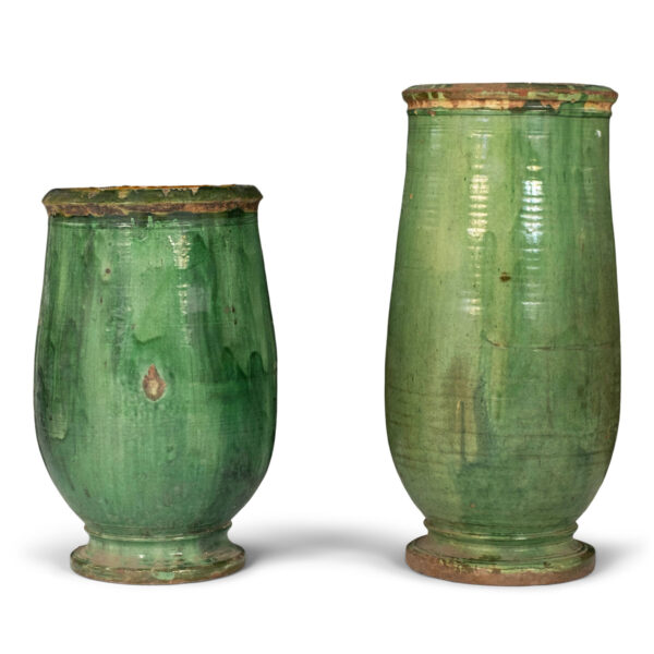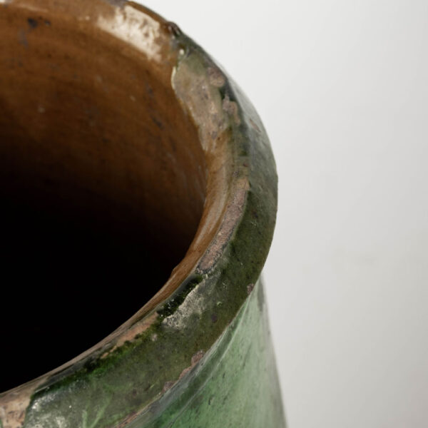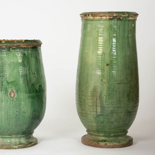 Antique French green glazed terracotta olivette jar dating to the 19th century. “Jarres dit Olivette de Tornac” are distinctive for their tall narrow shape. Two jars available and sold individually (see last two pictures).