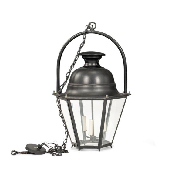 Black-painted hexagonal street lantern from the South of France. Newly wired for use within the USA using UL listed parts. Includes chain and canopy (listed height does not include chain).