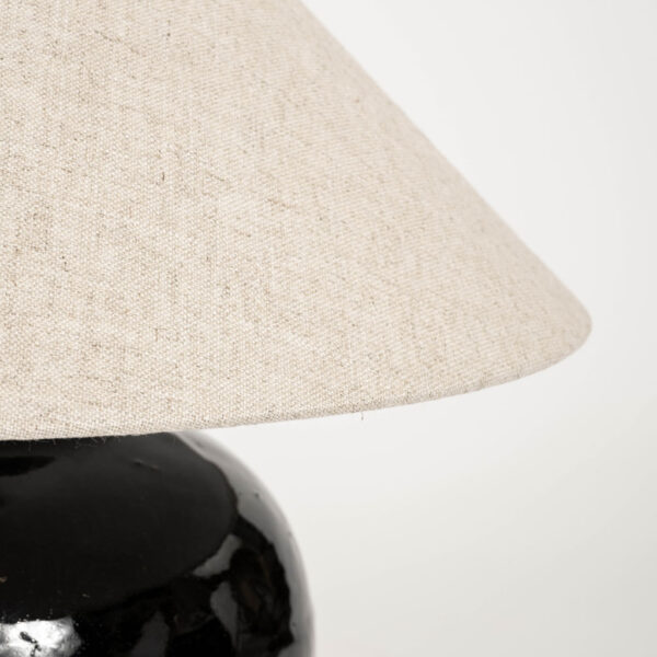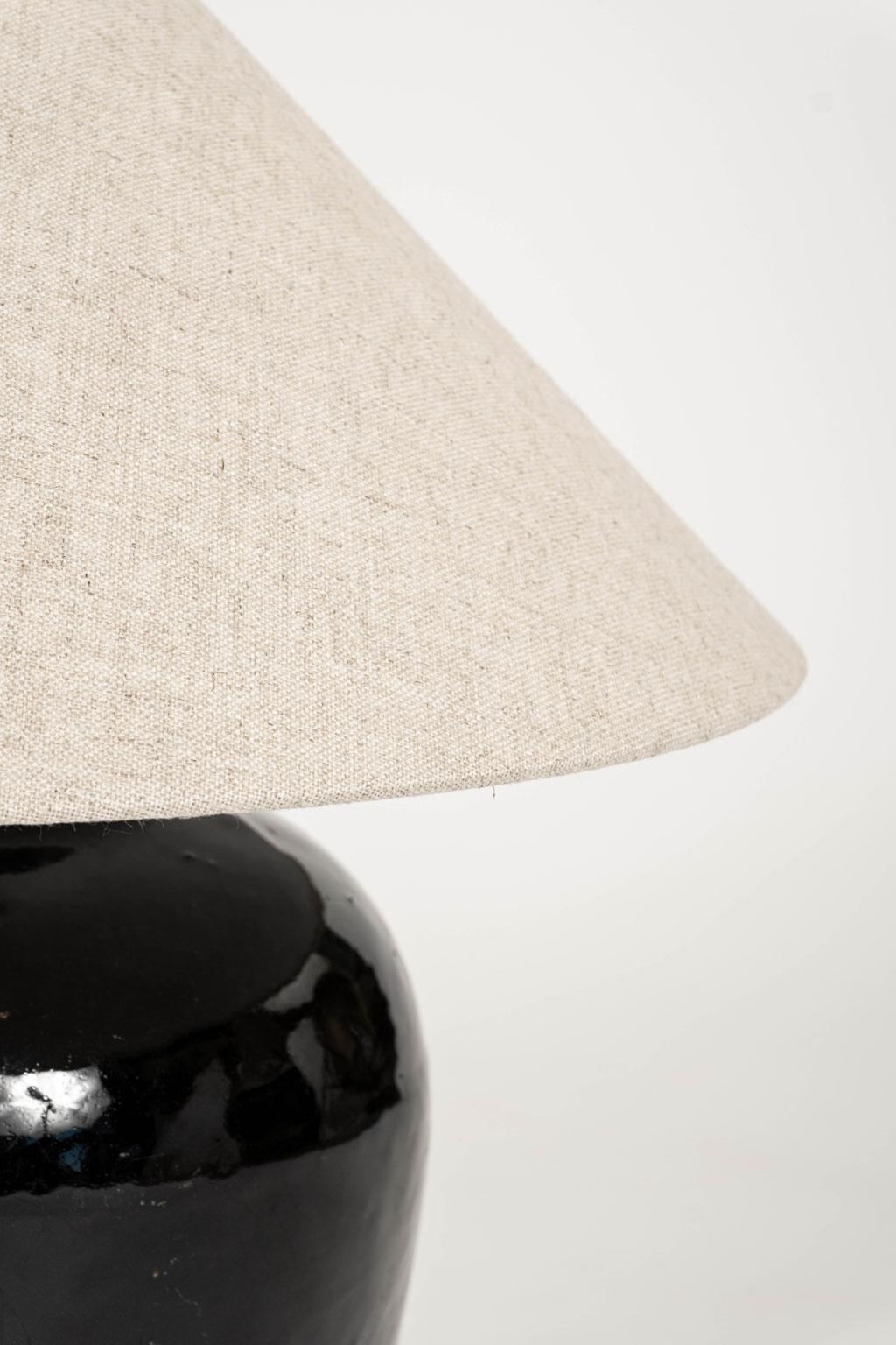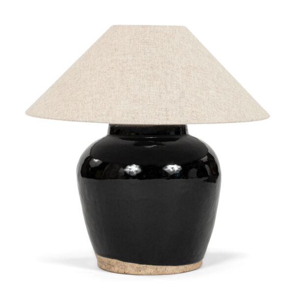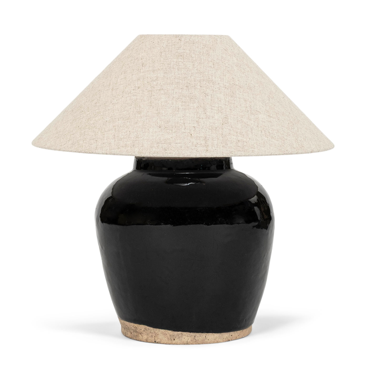 Chinese black glazed water pot lamp with Belgian linen shade. Newly wired for use within the USA with line switch. Natural color linen coolie shade with rolled edge.