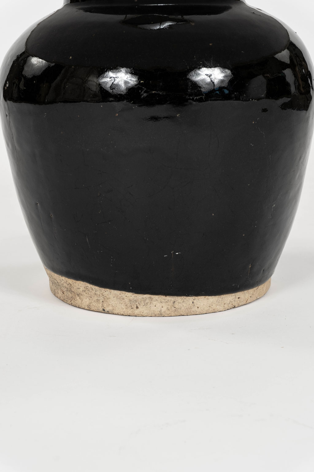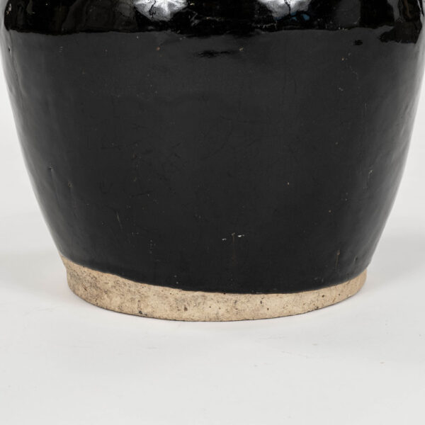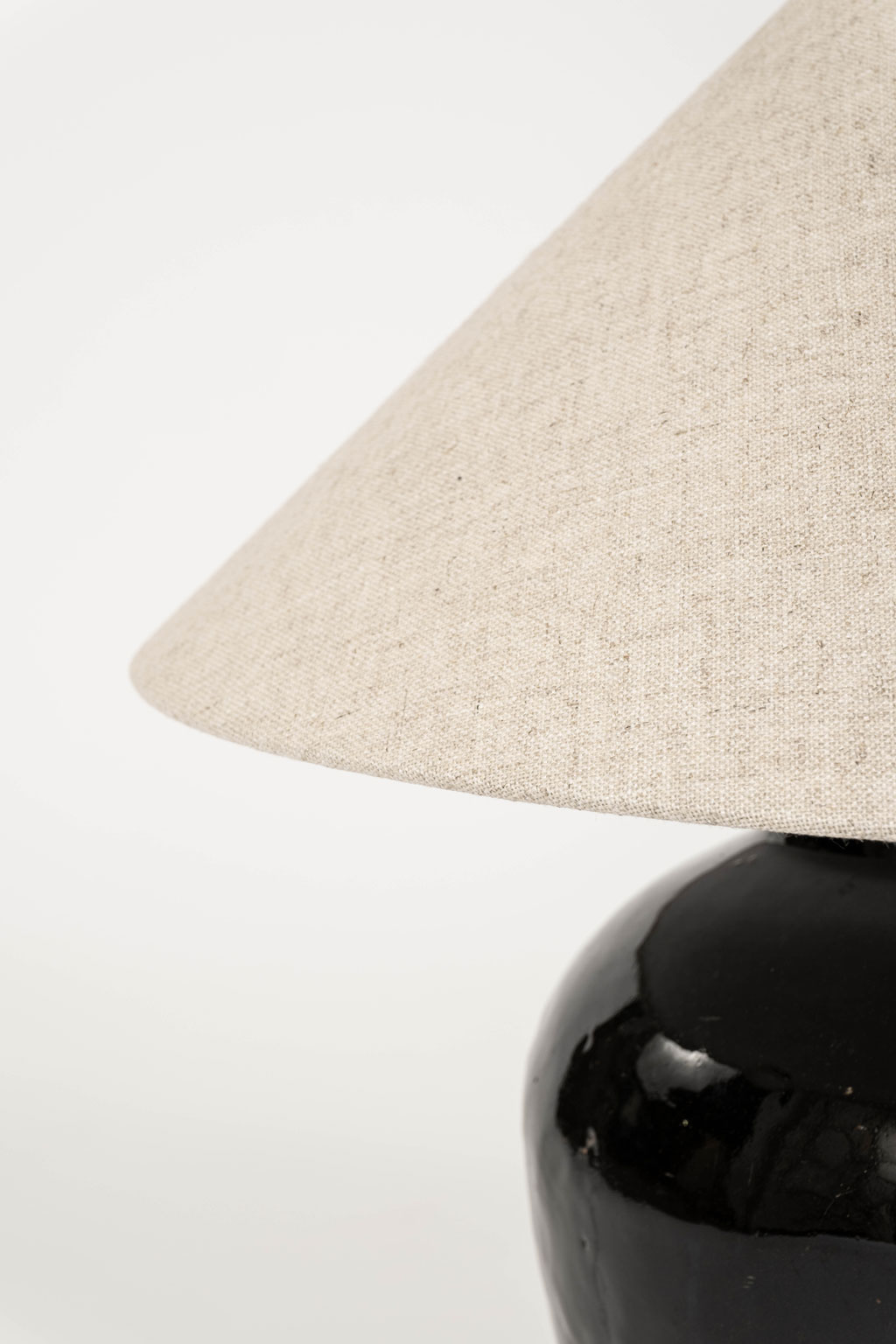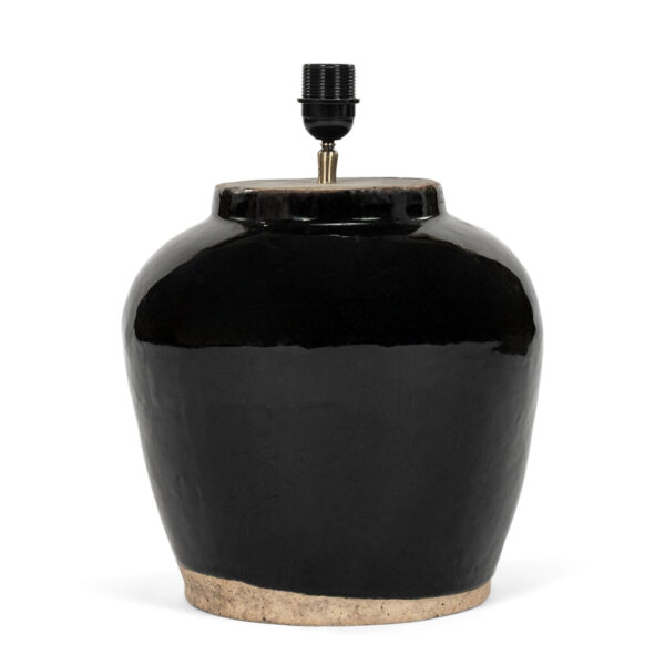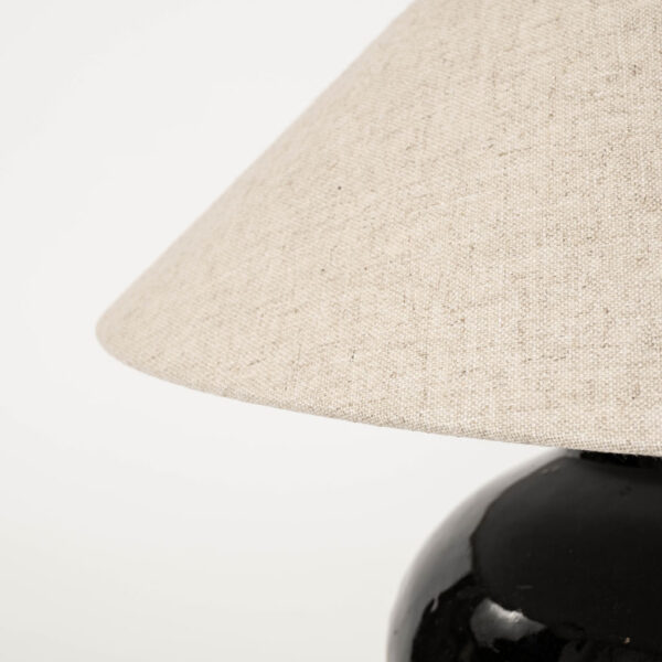 Chinese black glazed water pot lamp with Belgian linen shade. Newly wired for use within the USA with line switch. Natural color linen coolie shade with rolled edge.