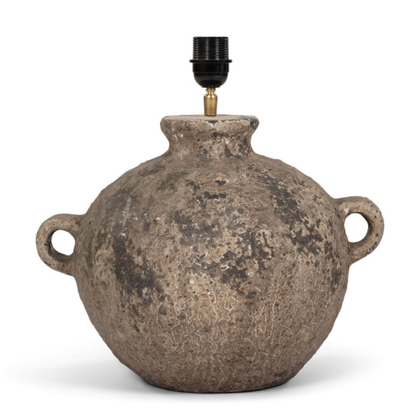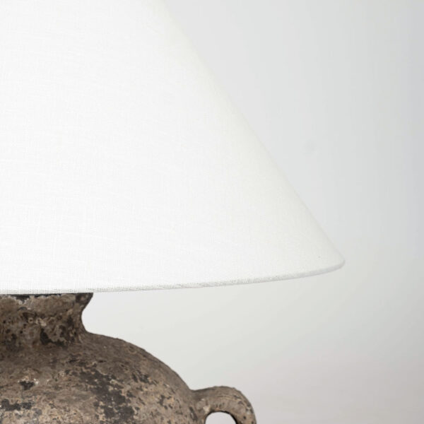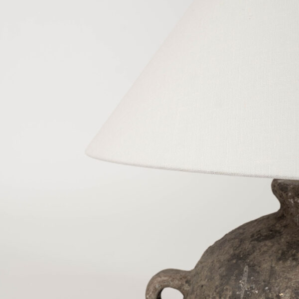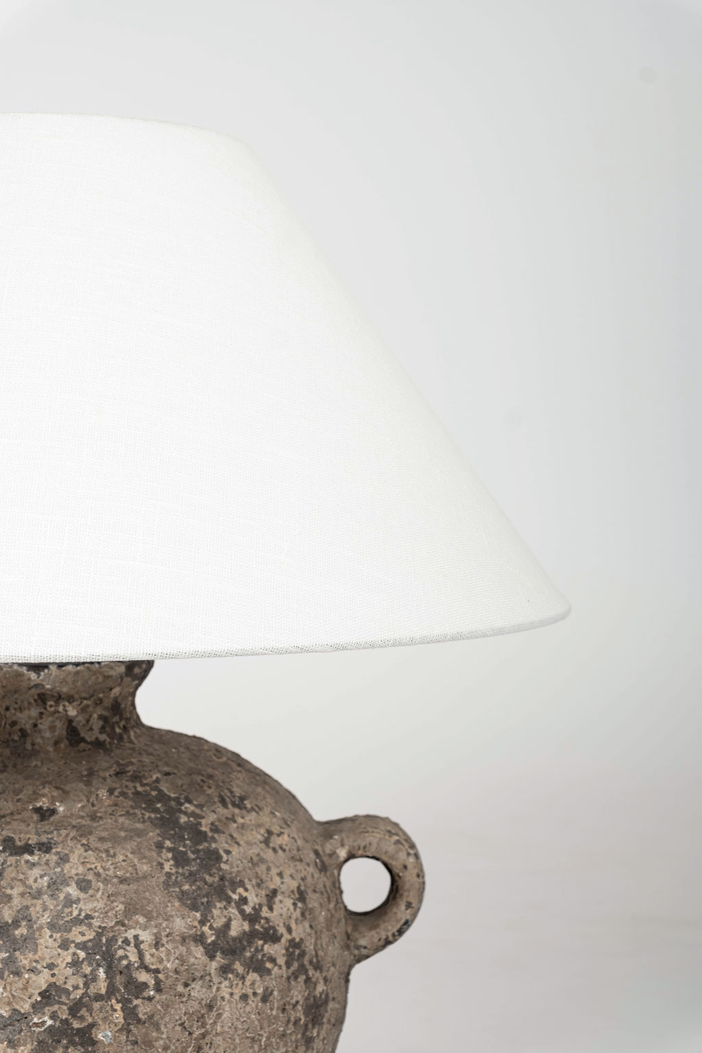 Chinese storage jar lamp with linen shade. Circa 1910-1939 Chinese storage jar, newly wired as table lamp. For use within the USA with line switch.