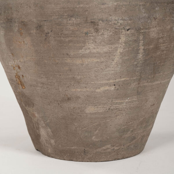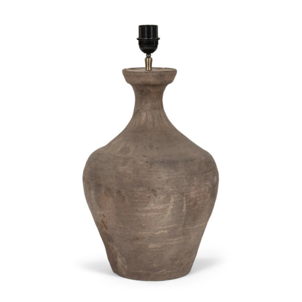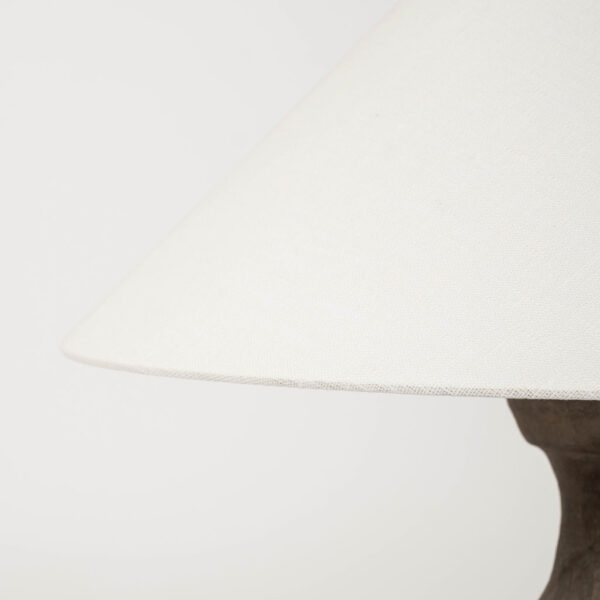 Chinese terracotta vase lamp with linen shade. Handmade unglazed matte brown terracotta vase, newly wired as table lamp with line switch. Includes linen coolie shade with rolled edges.