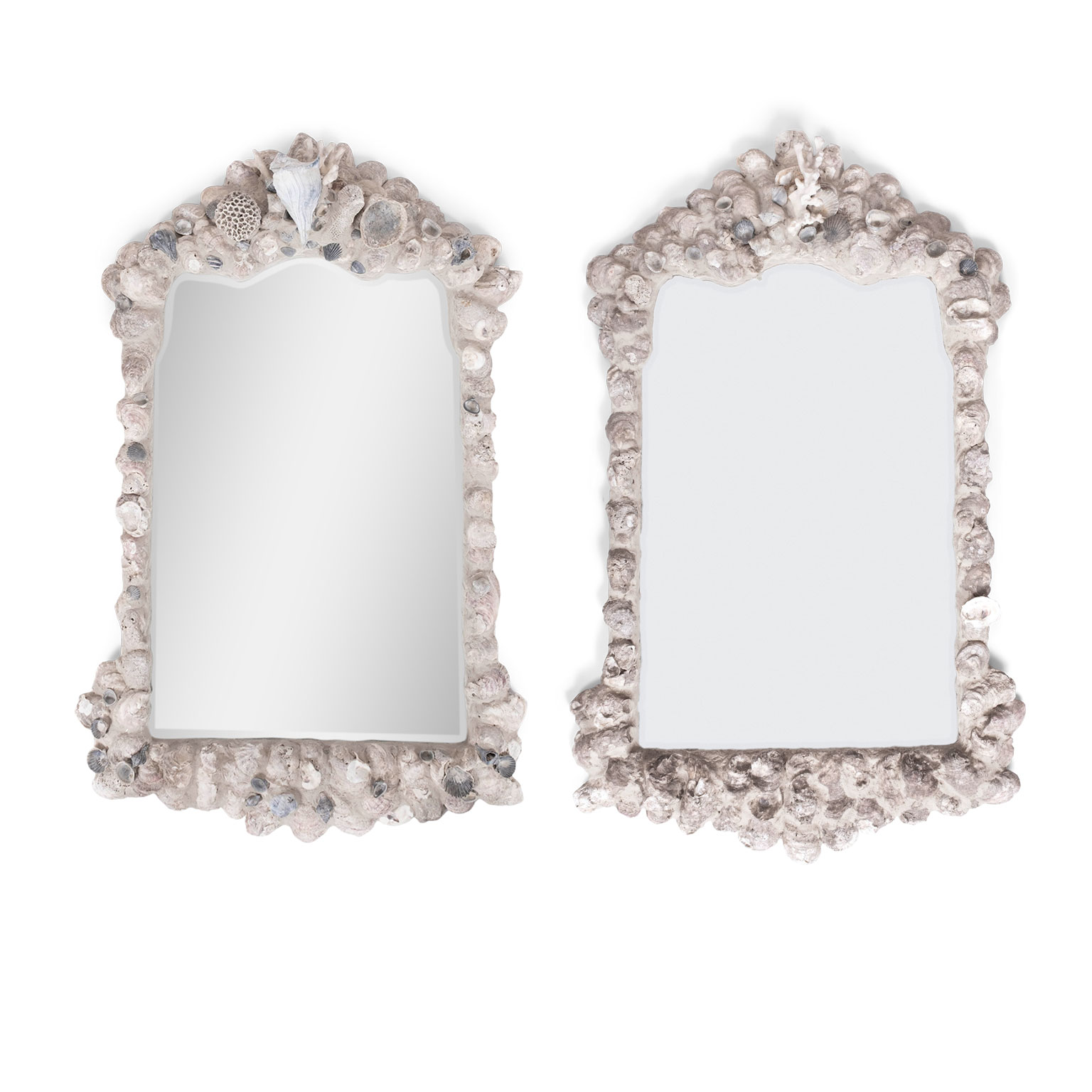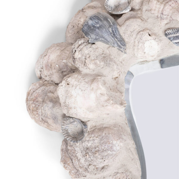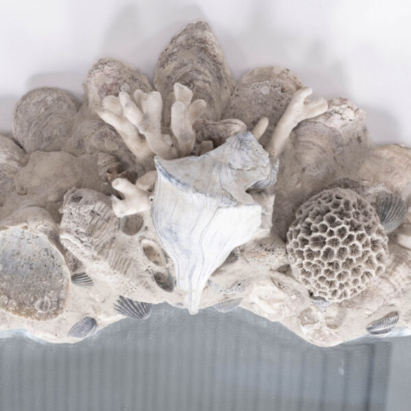 Concrete and shell mirror: vintage concrete and shell mirror frame surrounding beveled mirror. Two mirrors available – see last photo. Sold individually priced $3,600 each.