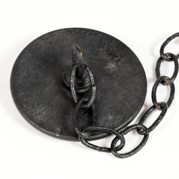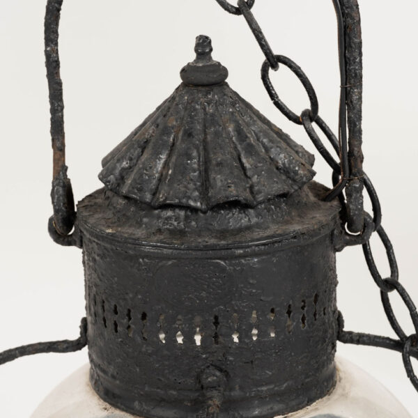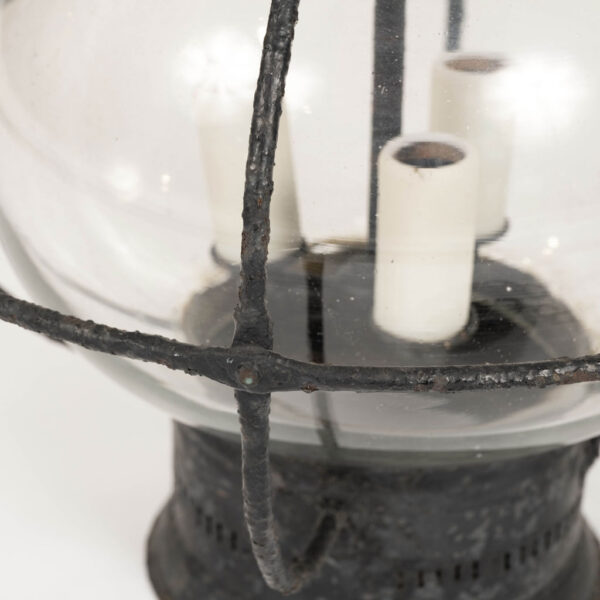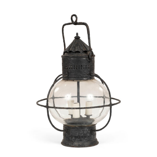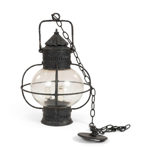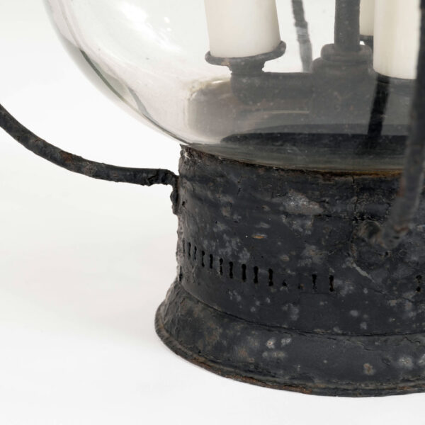 French black-painted iron lantern with hand-blown clear glass globular shade. Newly wired for use within the USA using UL listed parts. Three-drop cluster with three candelabra-sized sockets. Includes four feet of chain (listed dimensions do not include the chain) and a simple canopy.