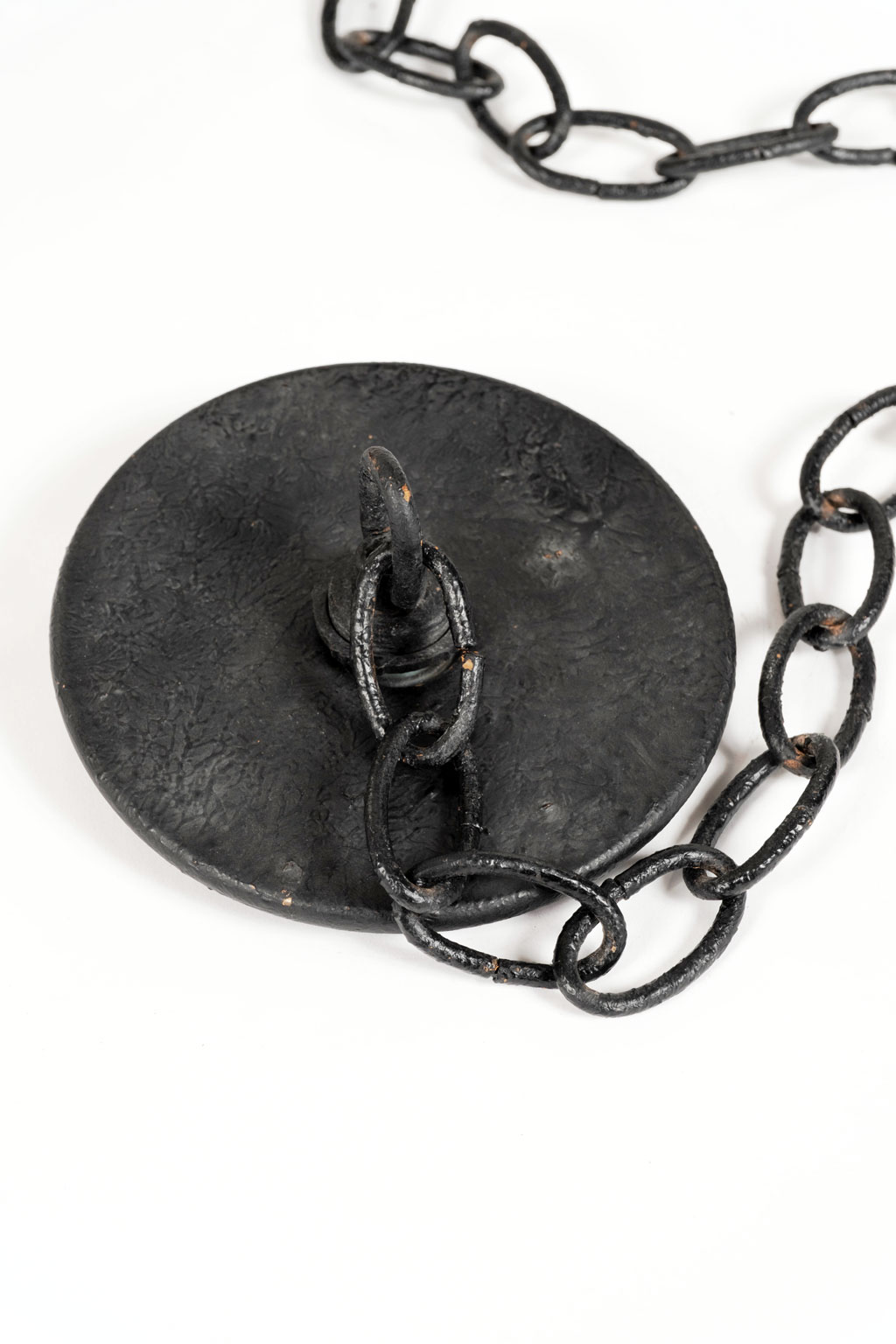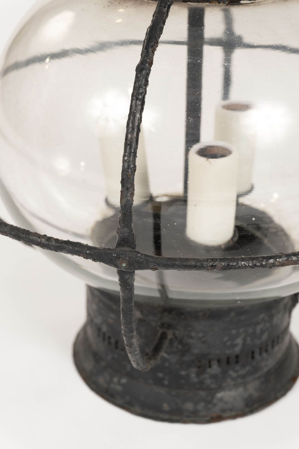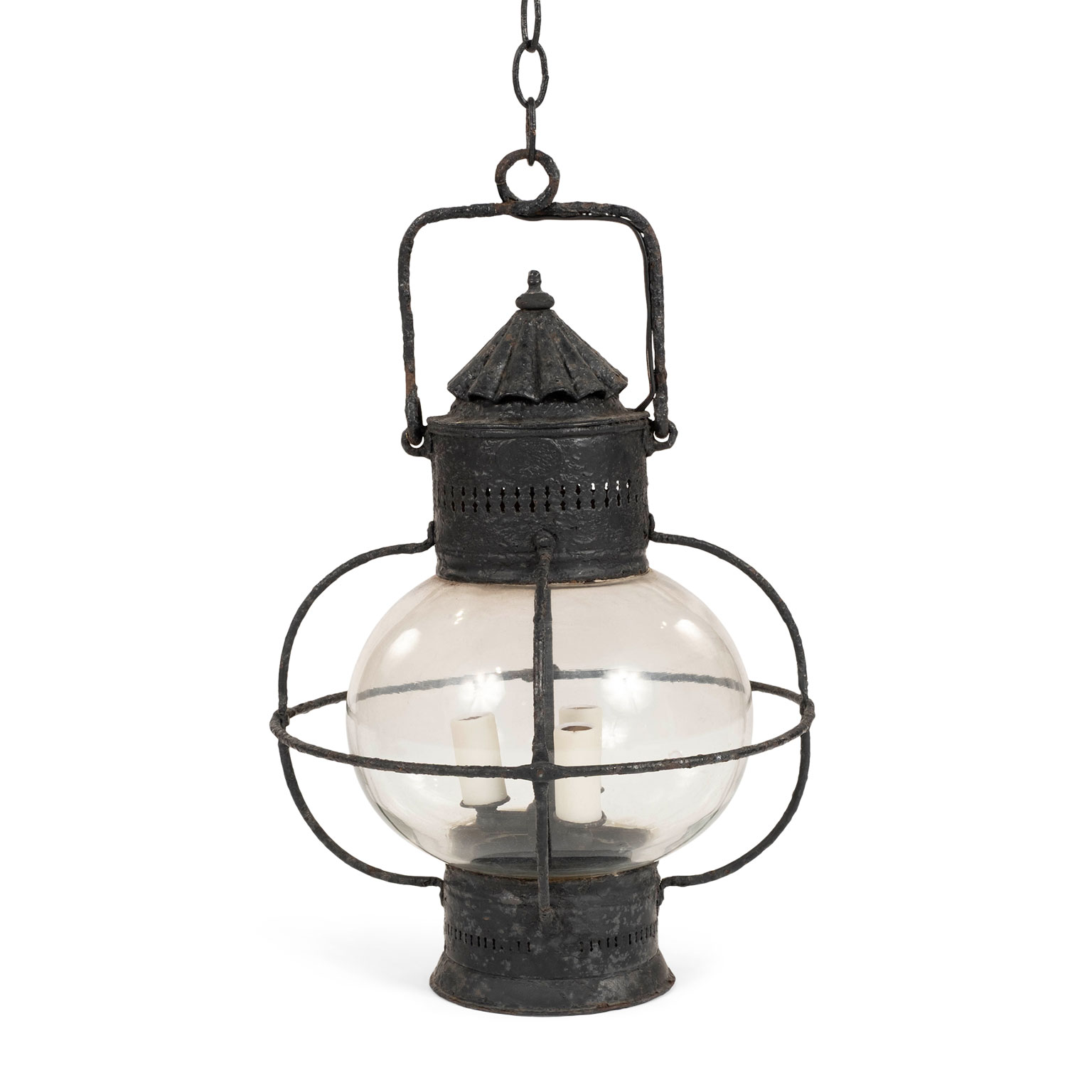 French black-painted iron lantern with hand-blown clear glass globular shade. Newly wired for use within the USA using UL listed parts. Three-drop cluster with three candelabra-sized sockets. Includes four feet of chain (listed dimensions do not include the chain) and a simple canopy.