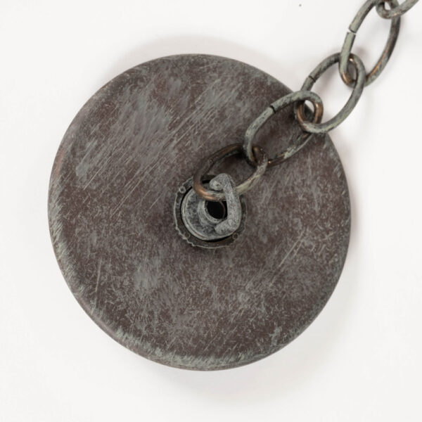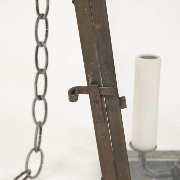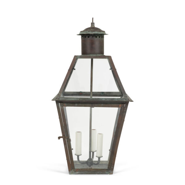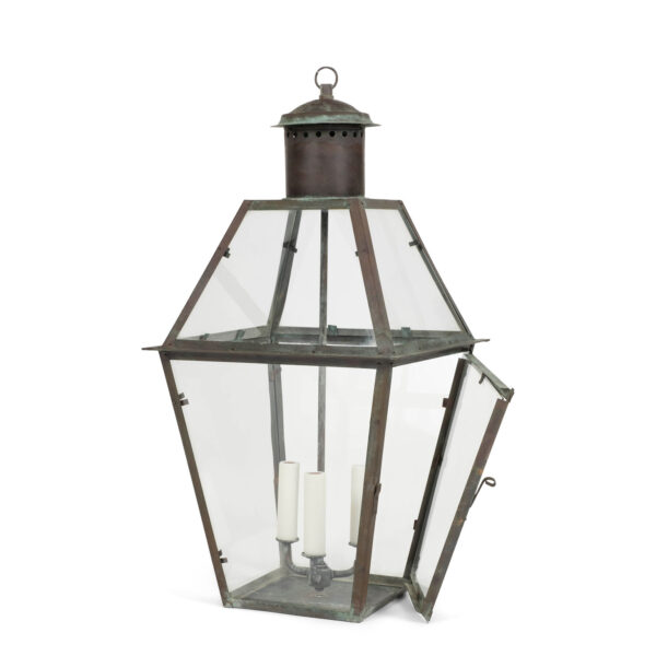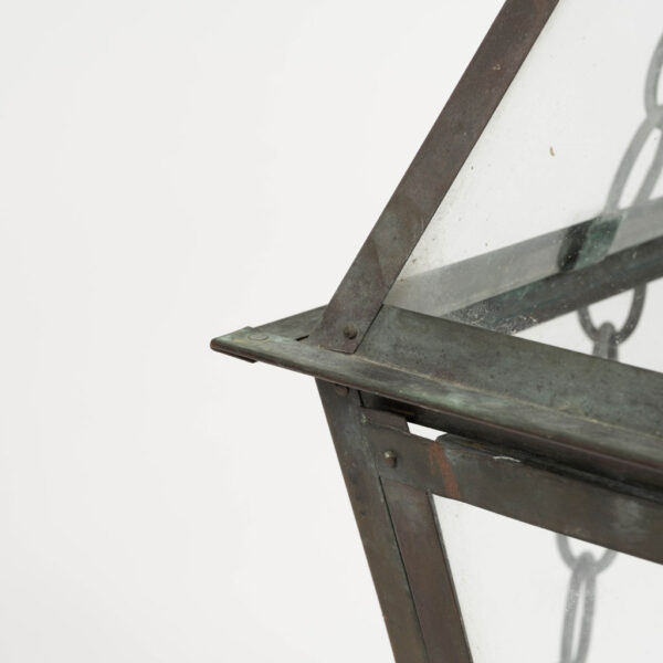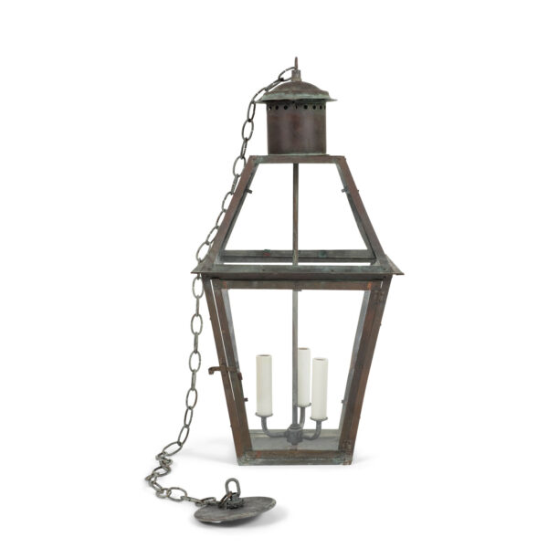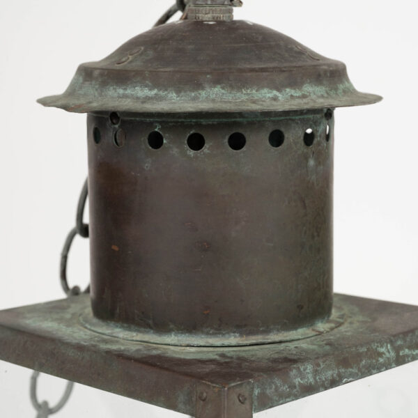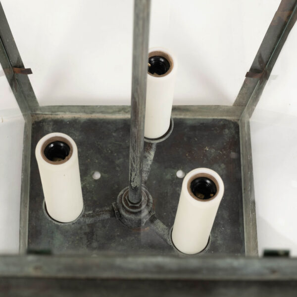 French glass-paneled verdigris-green and copper lantern circa 1870-1909. Natural green patina on copper – not forced. Glass panels replaced – not original. Newly wired for use within the USA using UL listed parts. Three-drop cluster with three candelabra-sized sockets. Four feet of chain (listed dimensions do not include chain) and a canopy.
