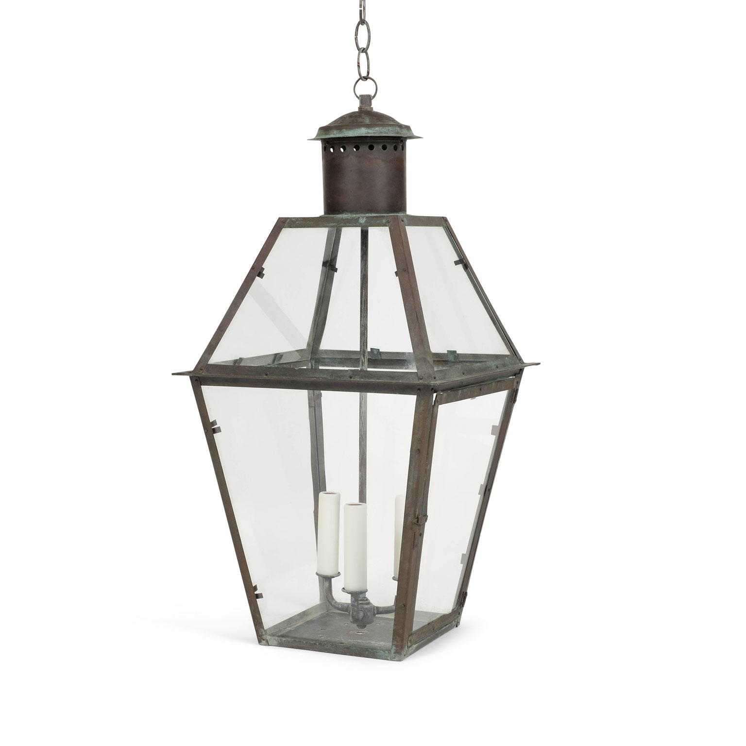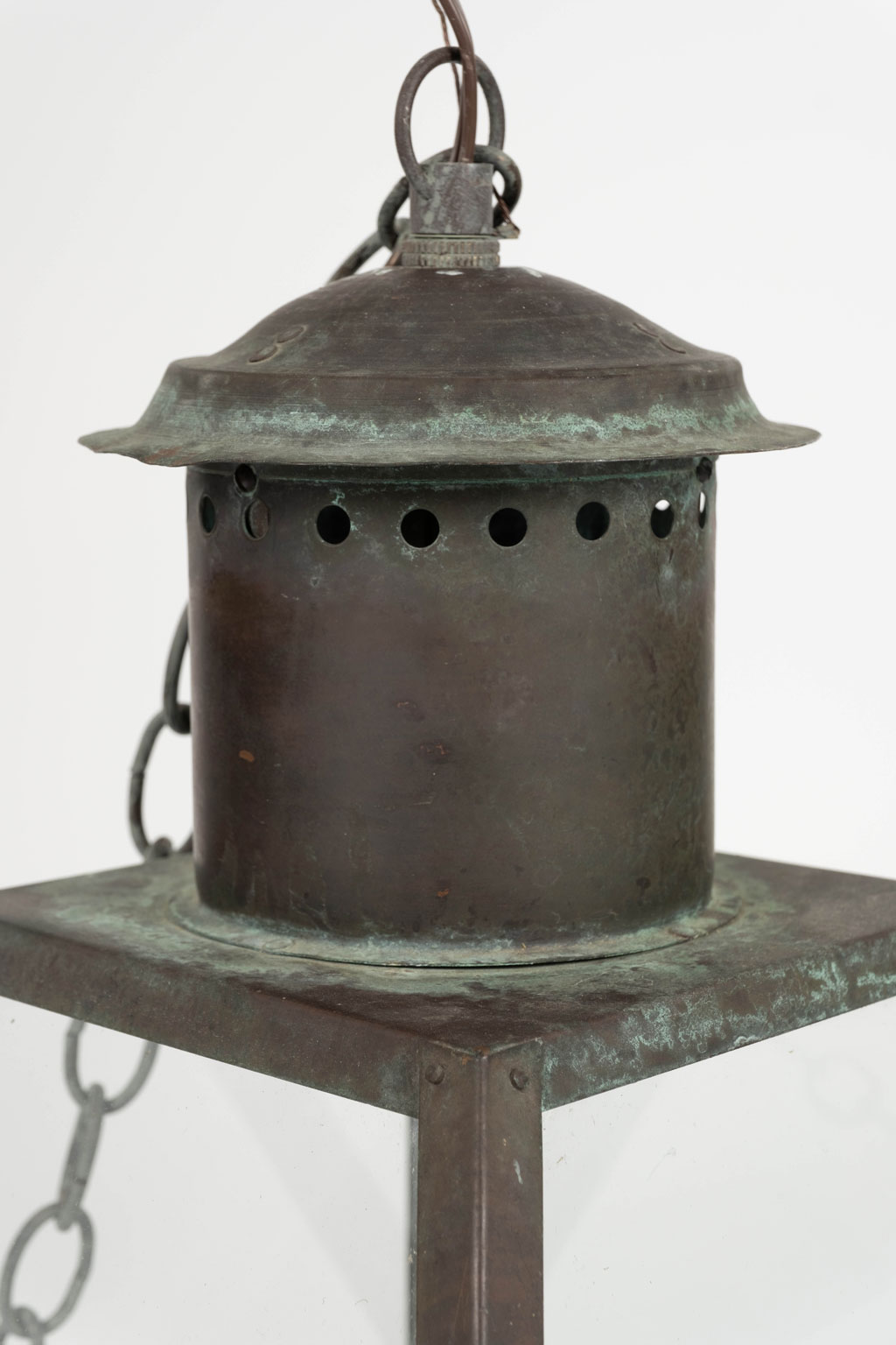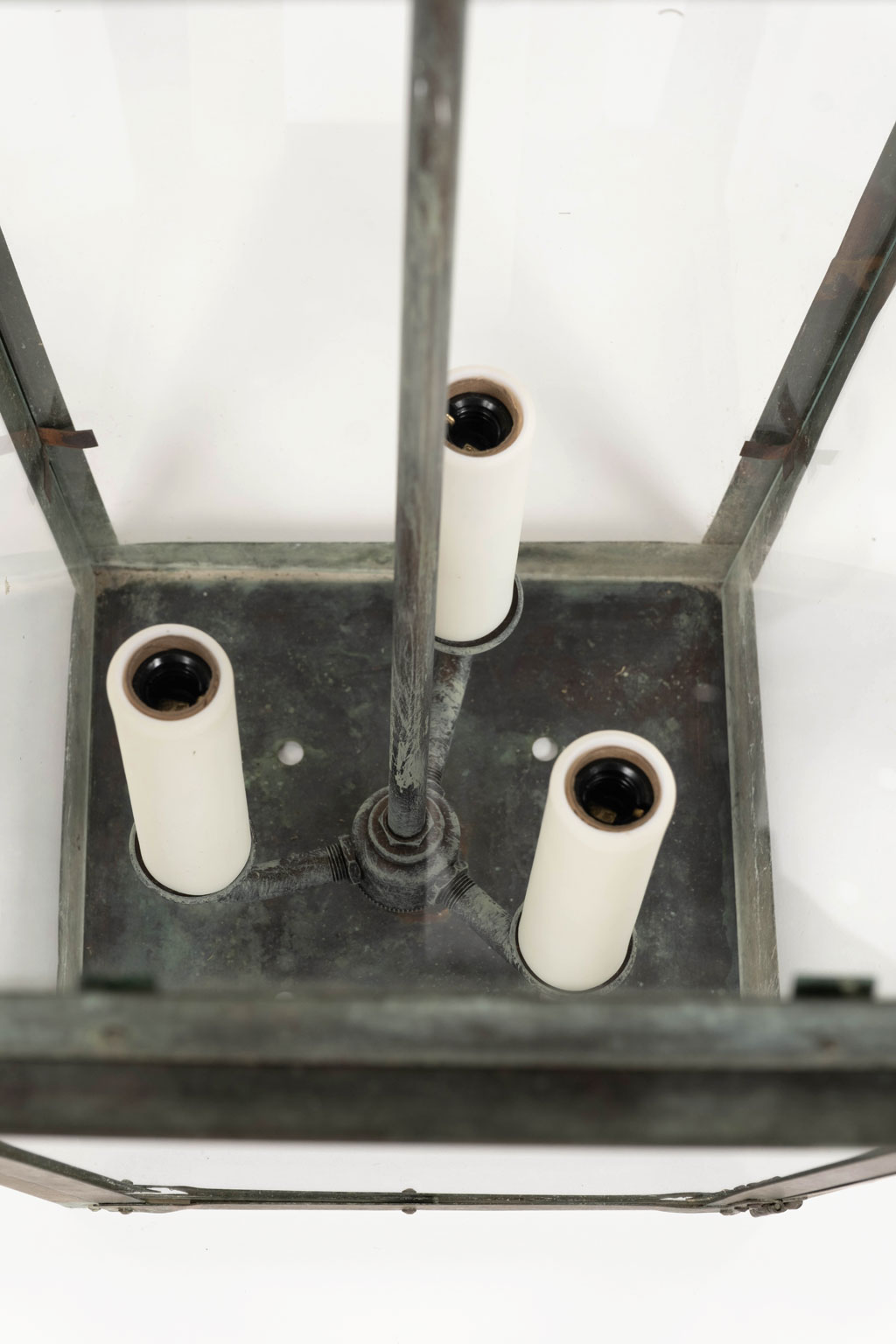 French glass-paneled verdigris-green and copper lantern circa 1870-1909. Natural green patina on copper – not forced. Glass panels replaced – not original. Newly wired for use within the USA using UL listed parts. Three-drop cluster with three candelabra-sized sockets. Four feet of chain (listed dimensions do not include chain) and a canopy.