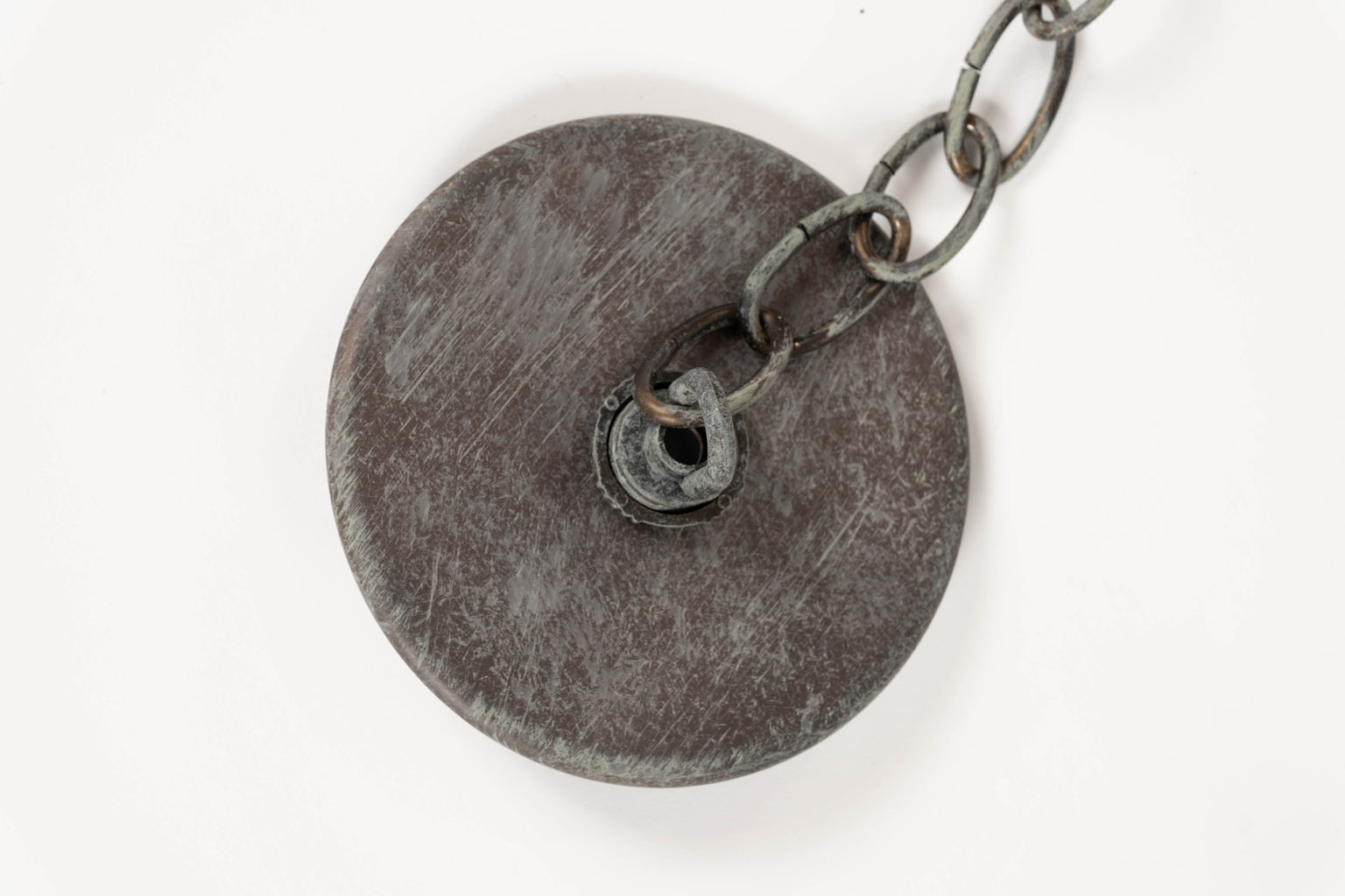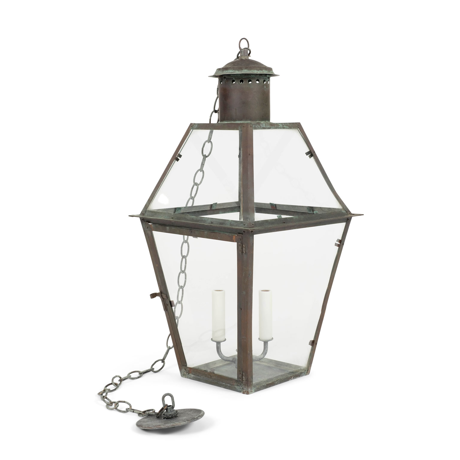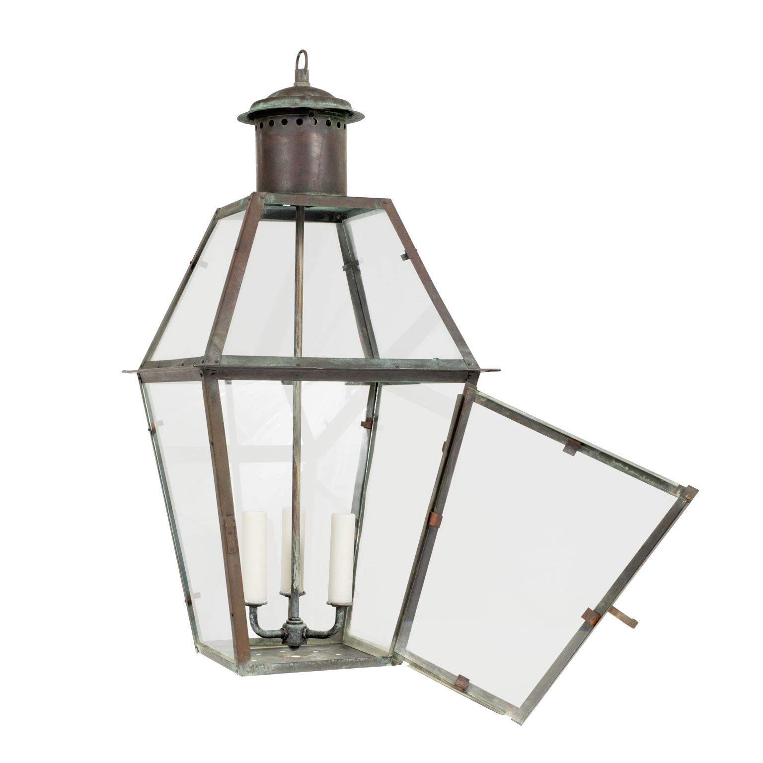 French glass-paneled verdigris-green and copper lantern circa 1870-1909. Natural green patina on copper – not forced. Glass panels replaced – not original. Newly wired for use within the USA using UL listed parts. Three-drop cluster with three candelabra-sized sockets. Four feet of chain (listed dimensions do not include chain) and a canopy.