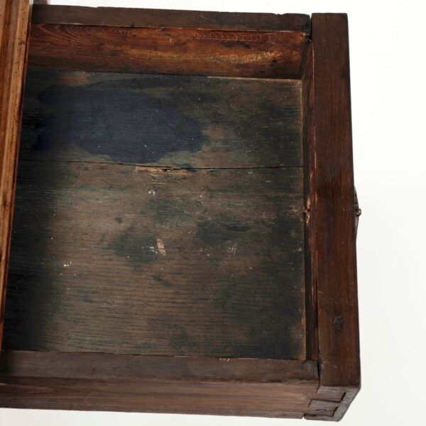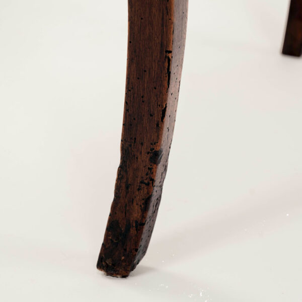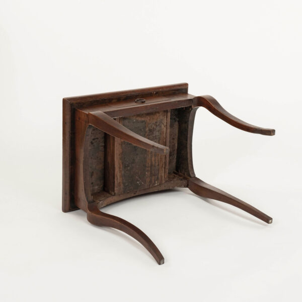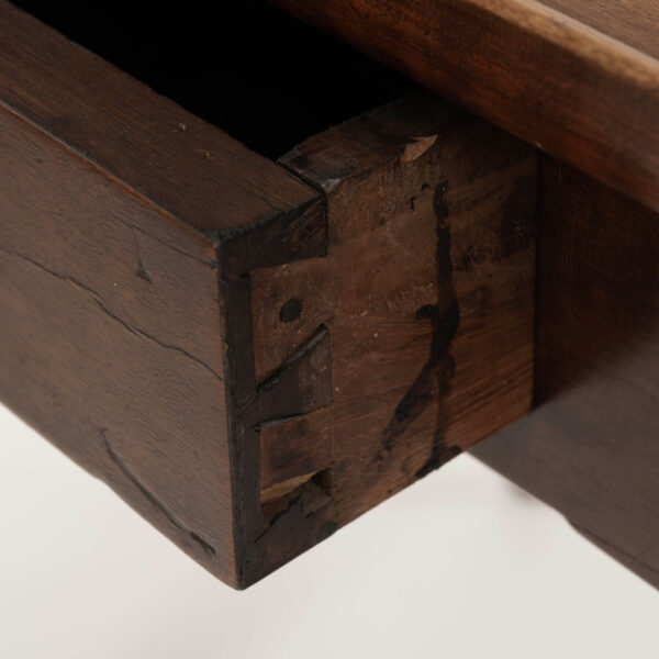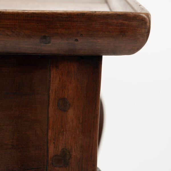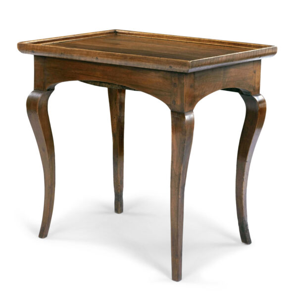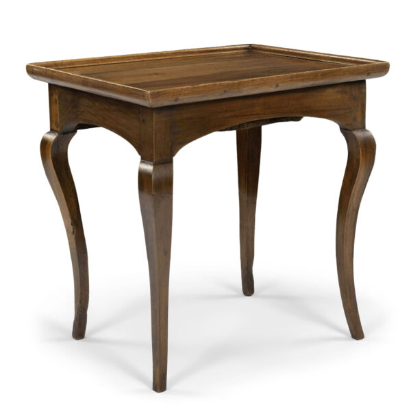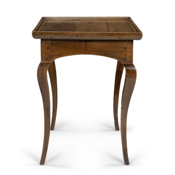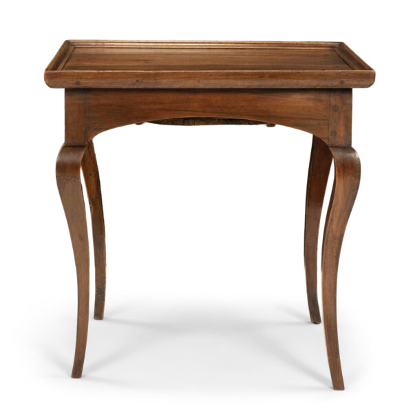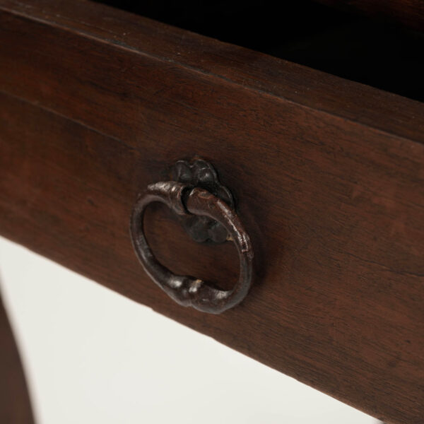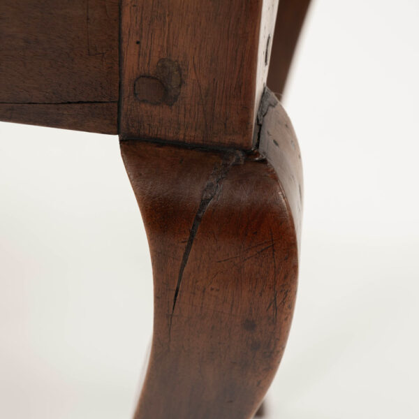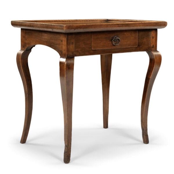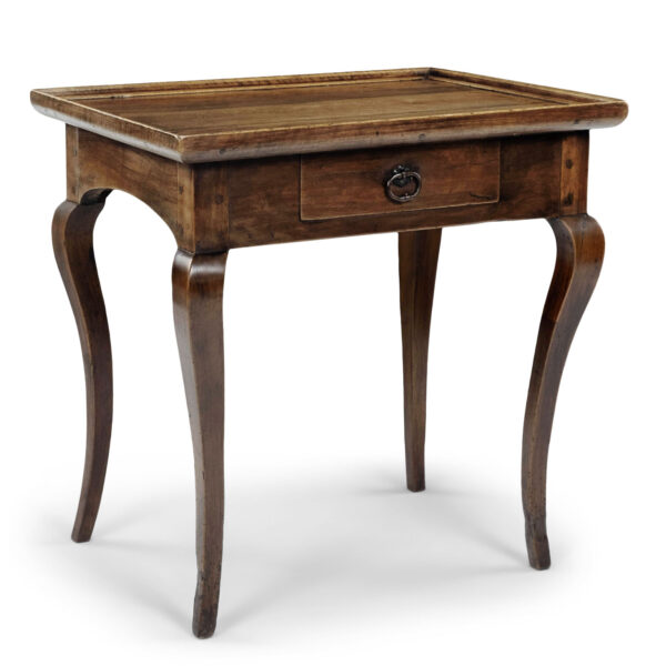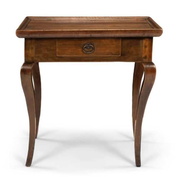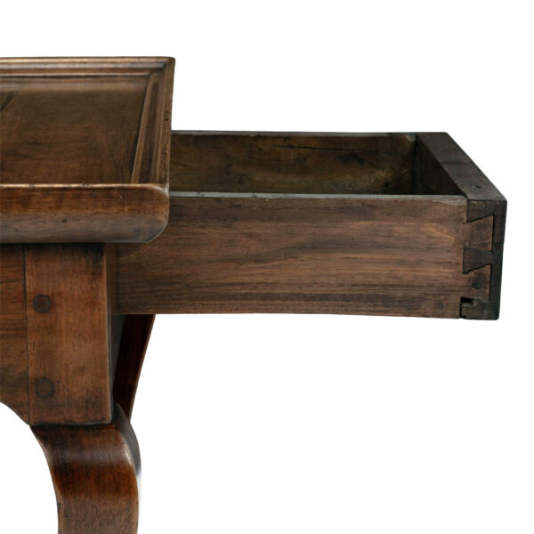 French walnut side table with single drawer, circa 1730-1759. Original drawer front with early – or original – dovetailed drawer interior. Pull not original, but old. Simple, graceful carved cabriole legs. Shaped trim band of walnut surrounds table top serving as a gallery.