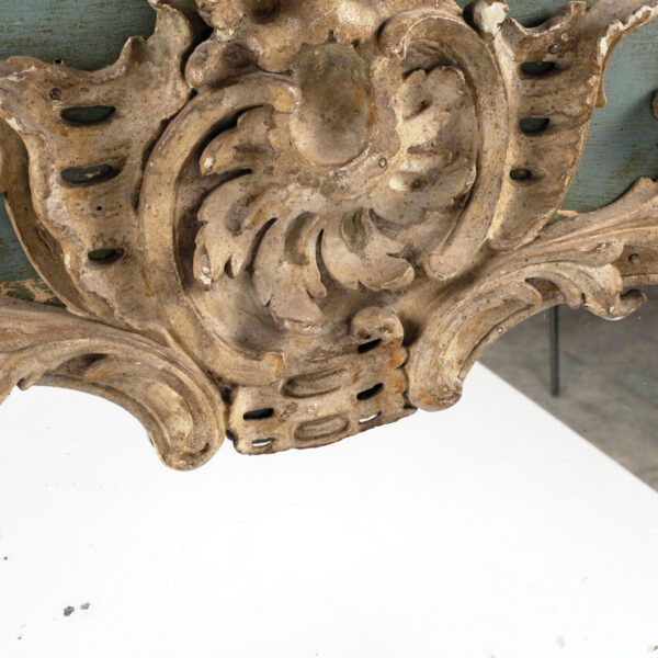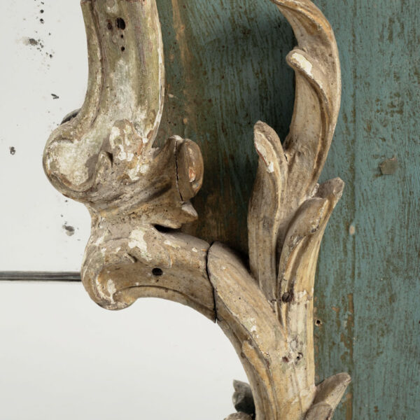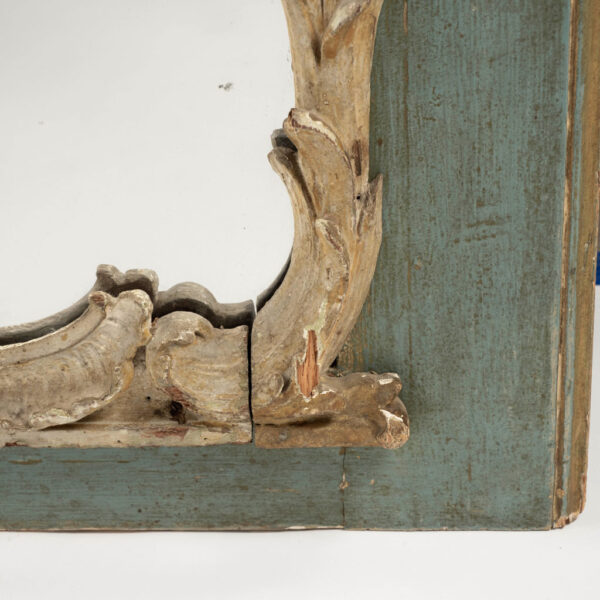 Hand-carved rococo Italian mirror, circa 1720-1759. Italian trumeau-style mirror from Venice. Fine hand-carved adornment. Early painted finish. Early split-plate mirror glass.