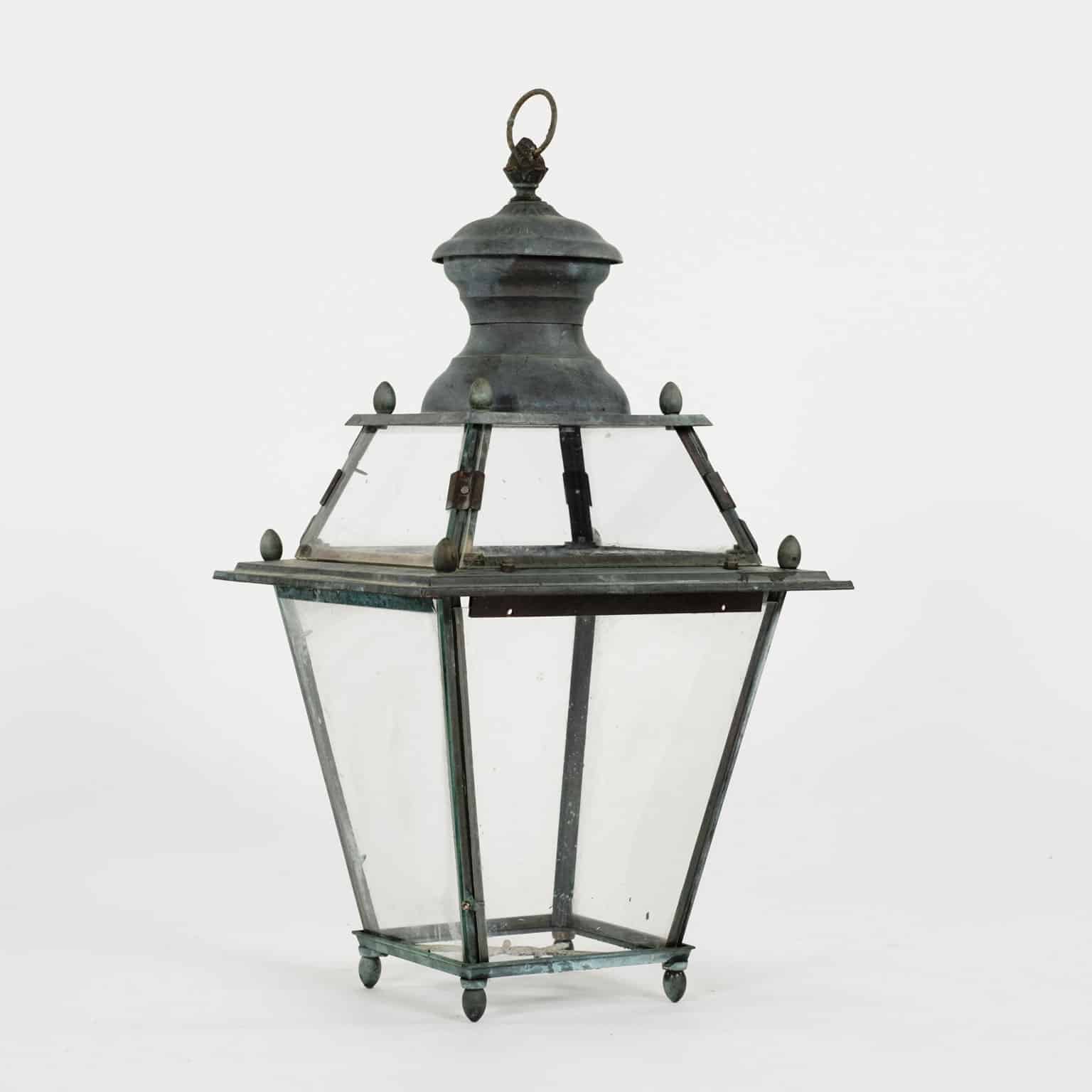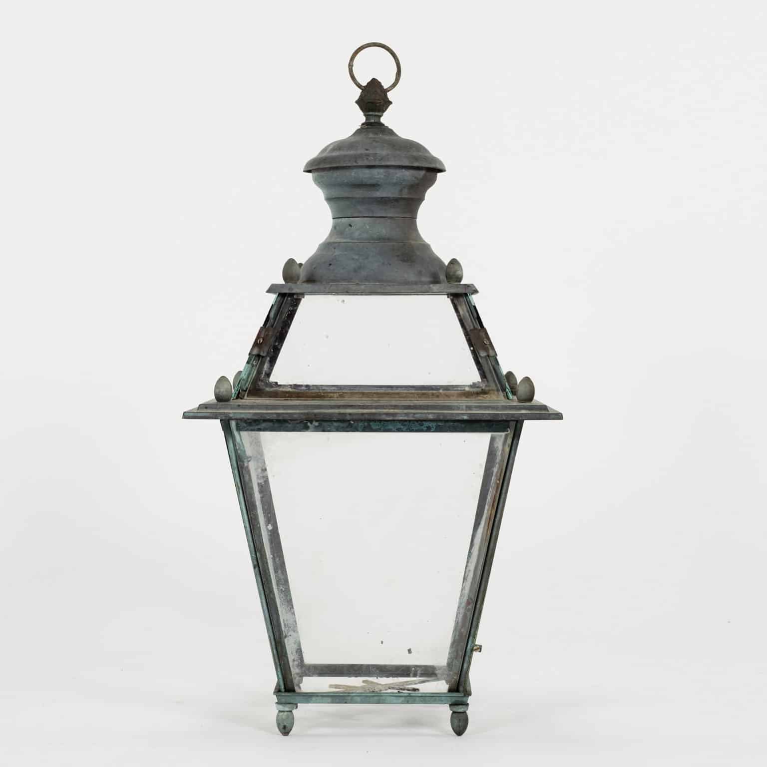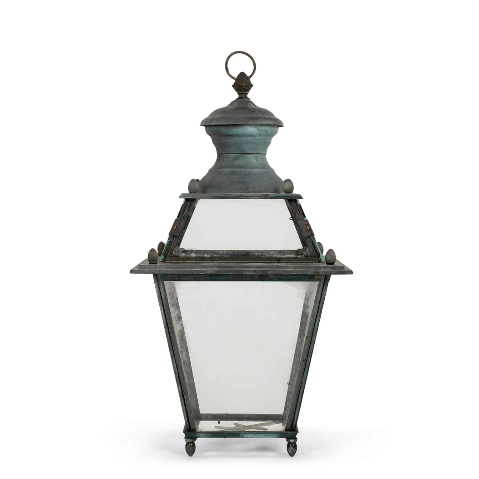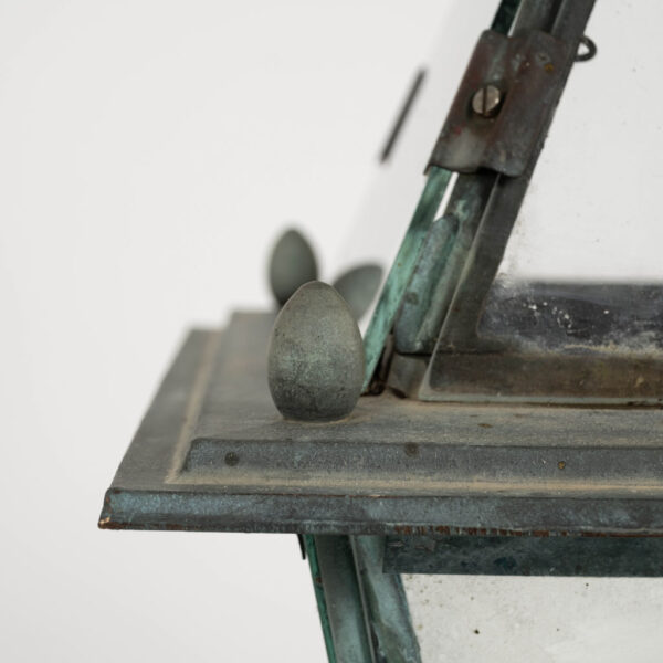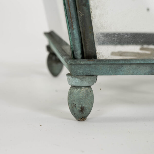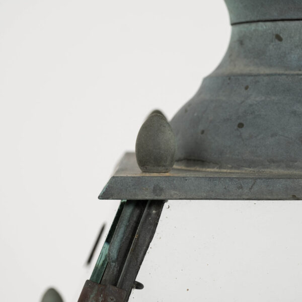 Italian glass paneled lantern, cast circa 1900-1909 in Genoa. Subtle, natural gray and green color patina. Not wired.