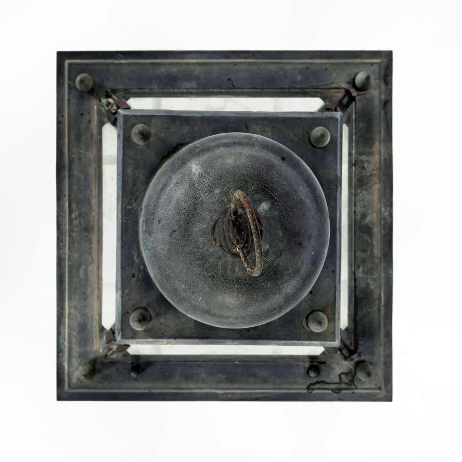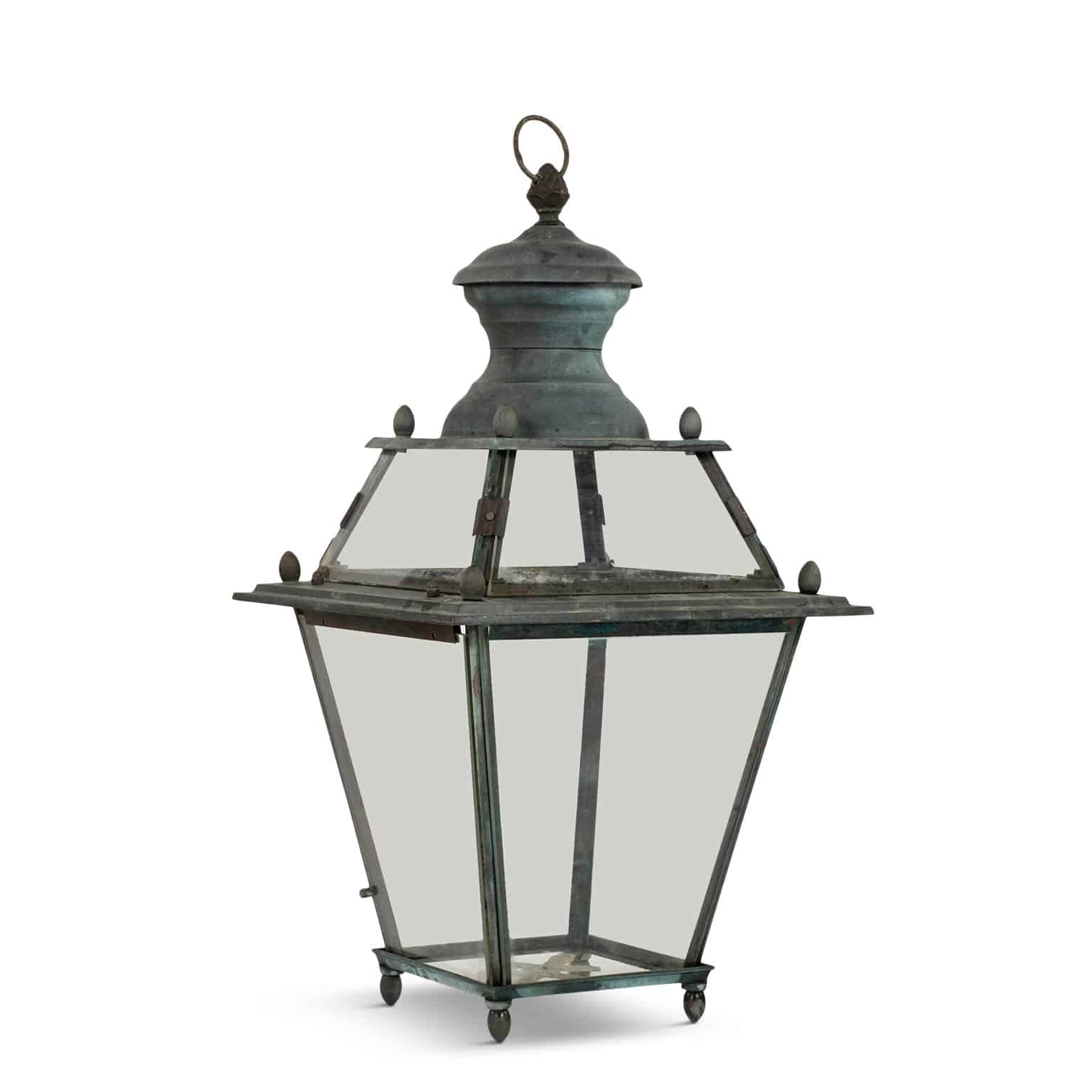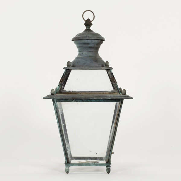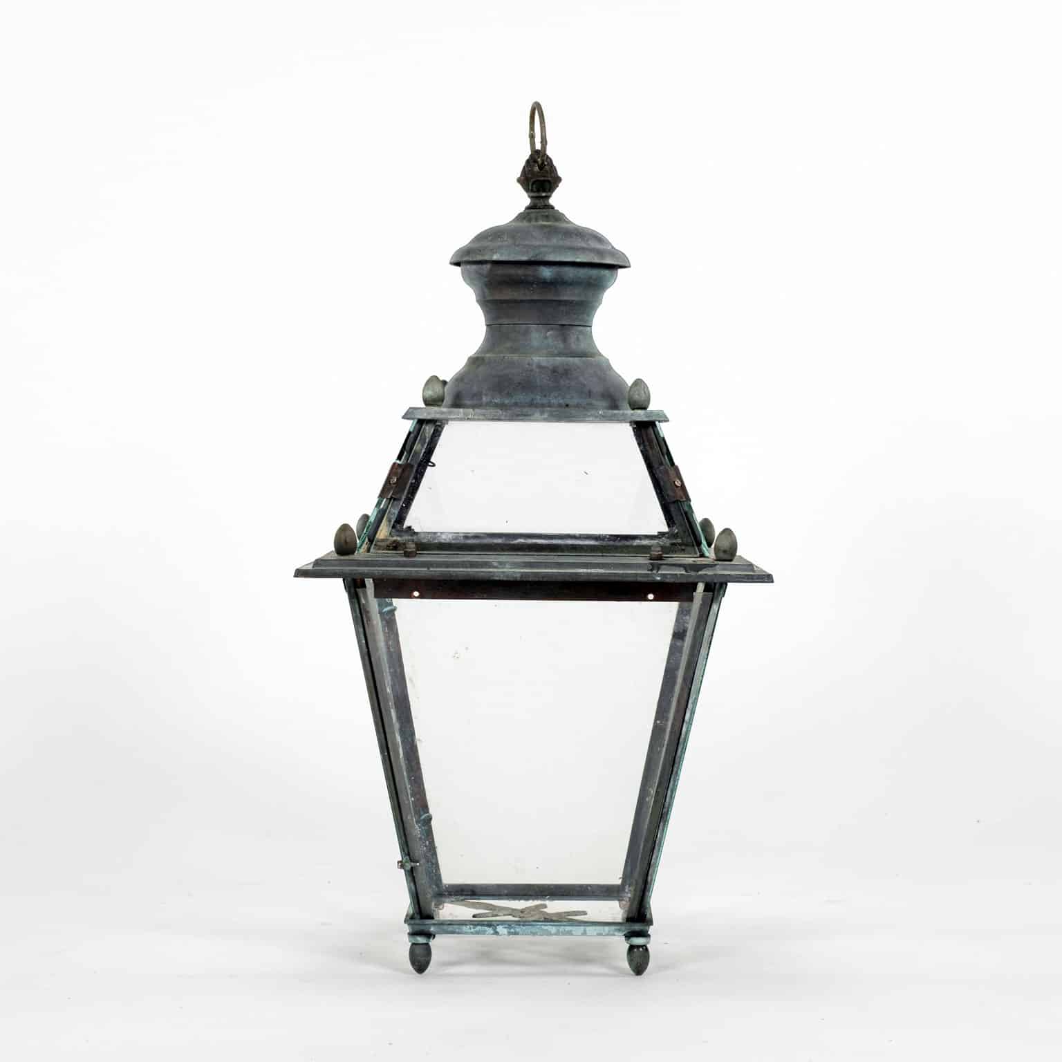 Italian glass paneled lantern, cast circa 1900-1909 in Genoa. Subtle, natural gray and green color patina. Not wired.