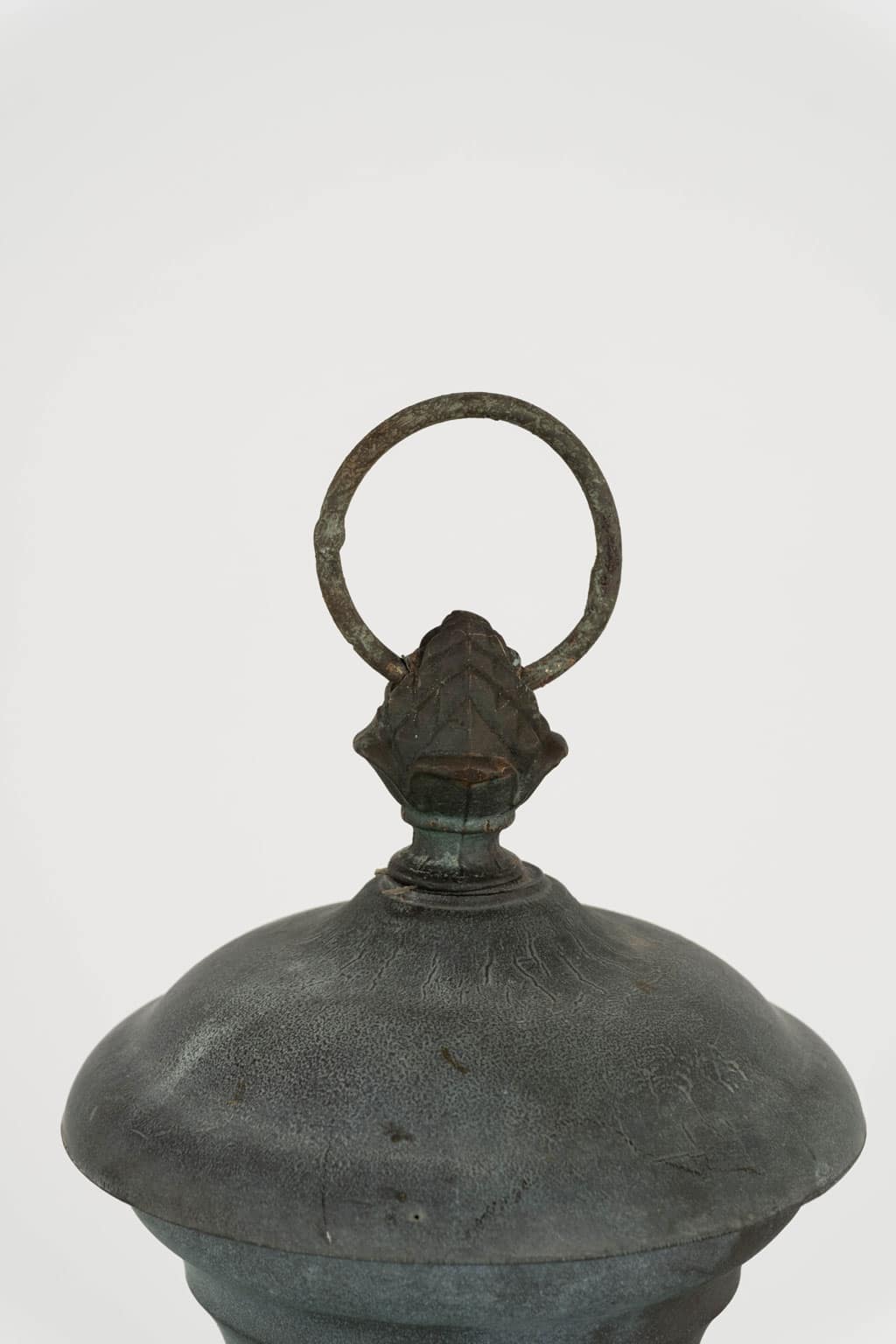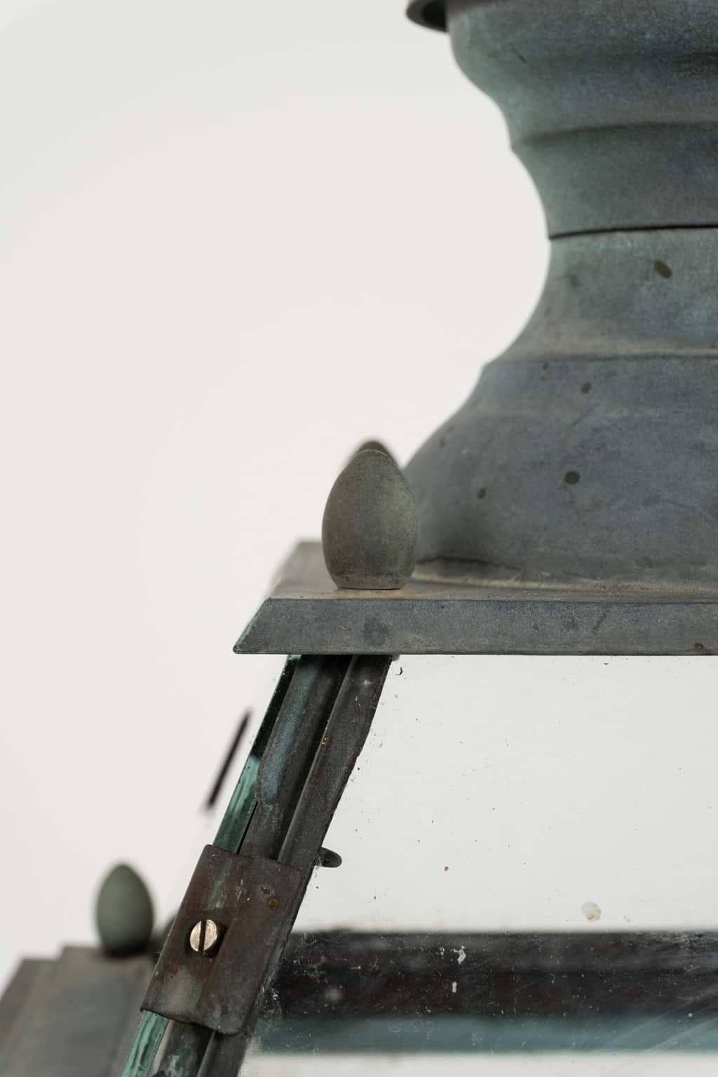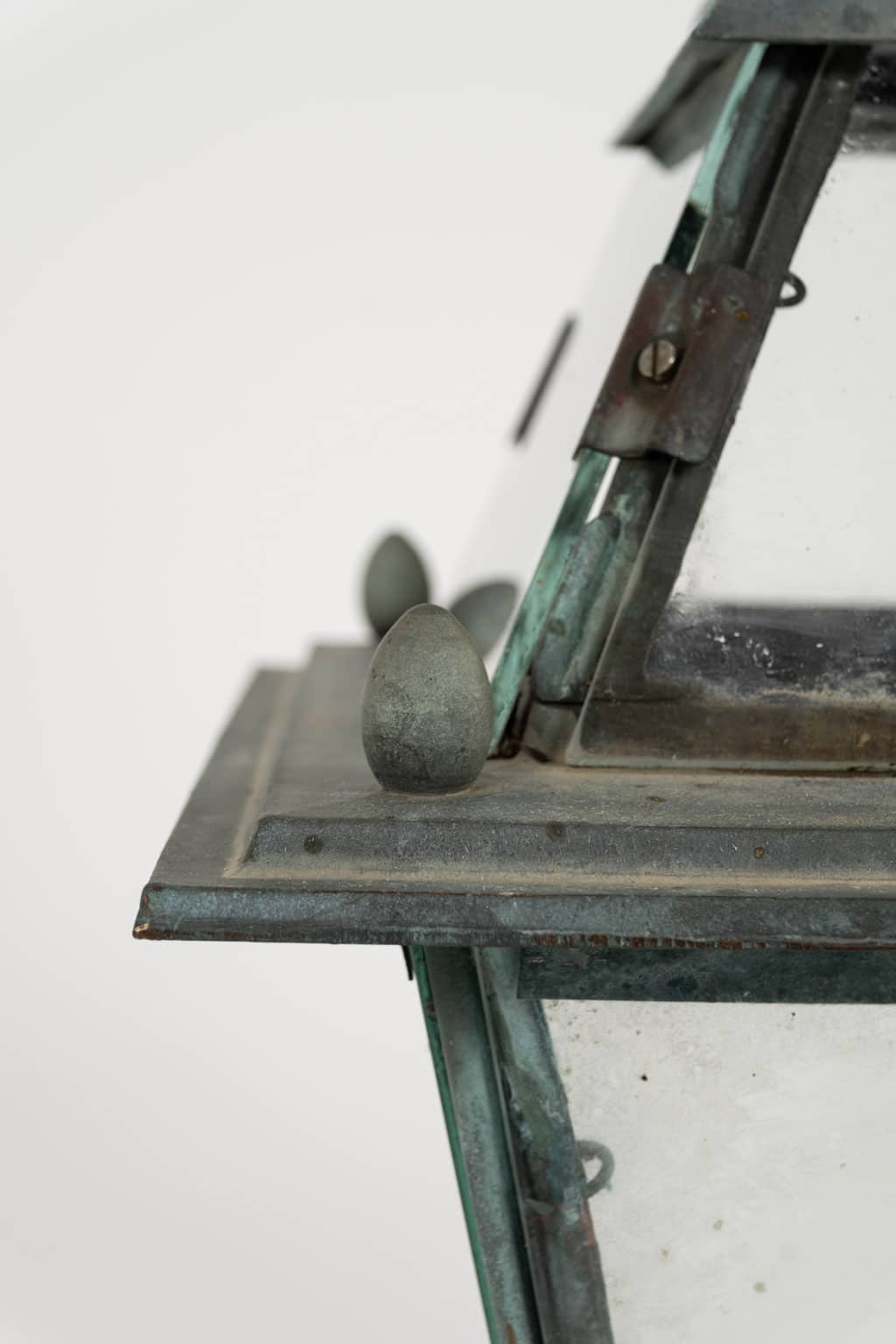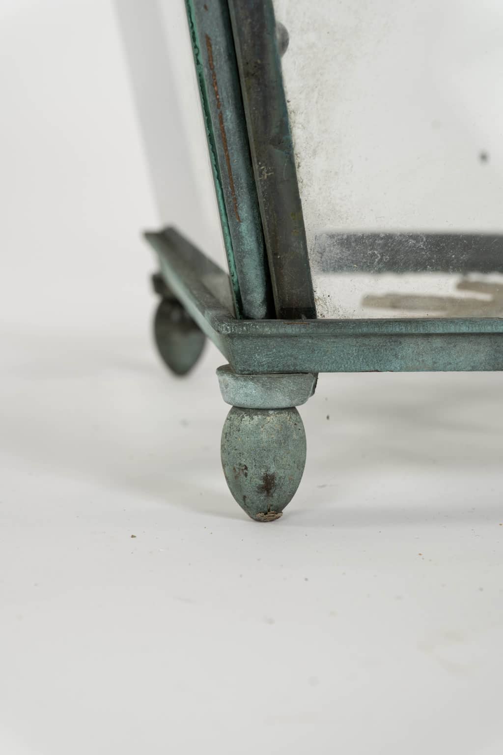 Italian glass paneled lantern, cast circa 1900-1909 in Genoa. Subtle, natural gray and green color patina. Not wired.