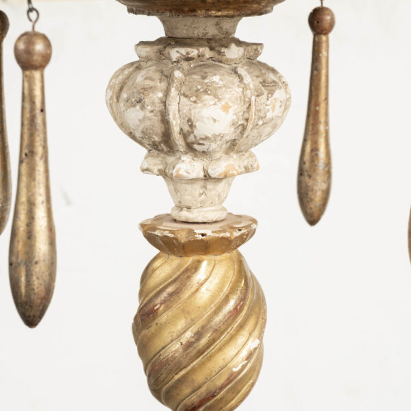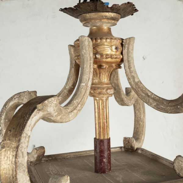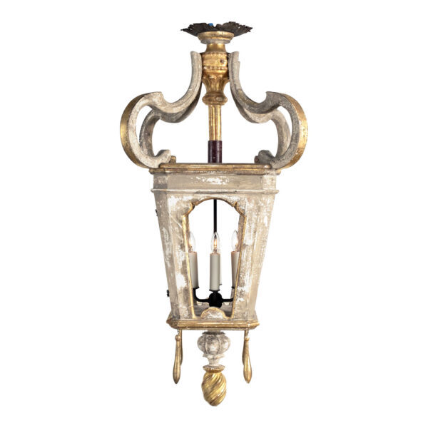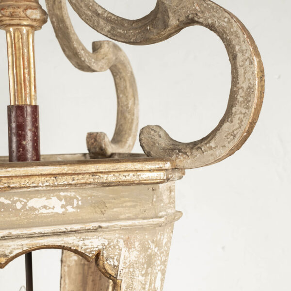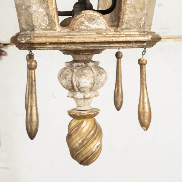 Large wooden lantern made from 18th century French fragments featuring their beautiful original patina with remnants of gilt. Newly wired for use within the USA. Three drop cluster of candelabra size sockets. Includes chain and canopy.