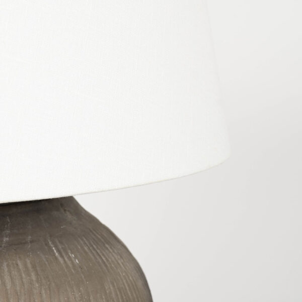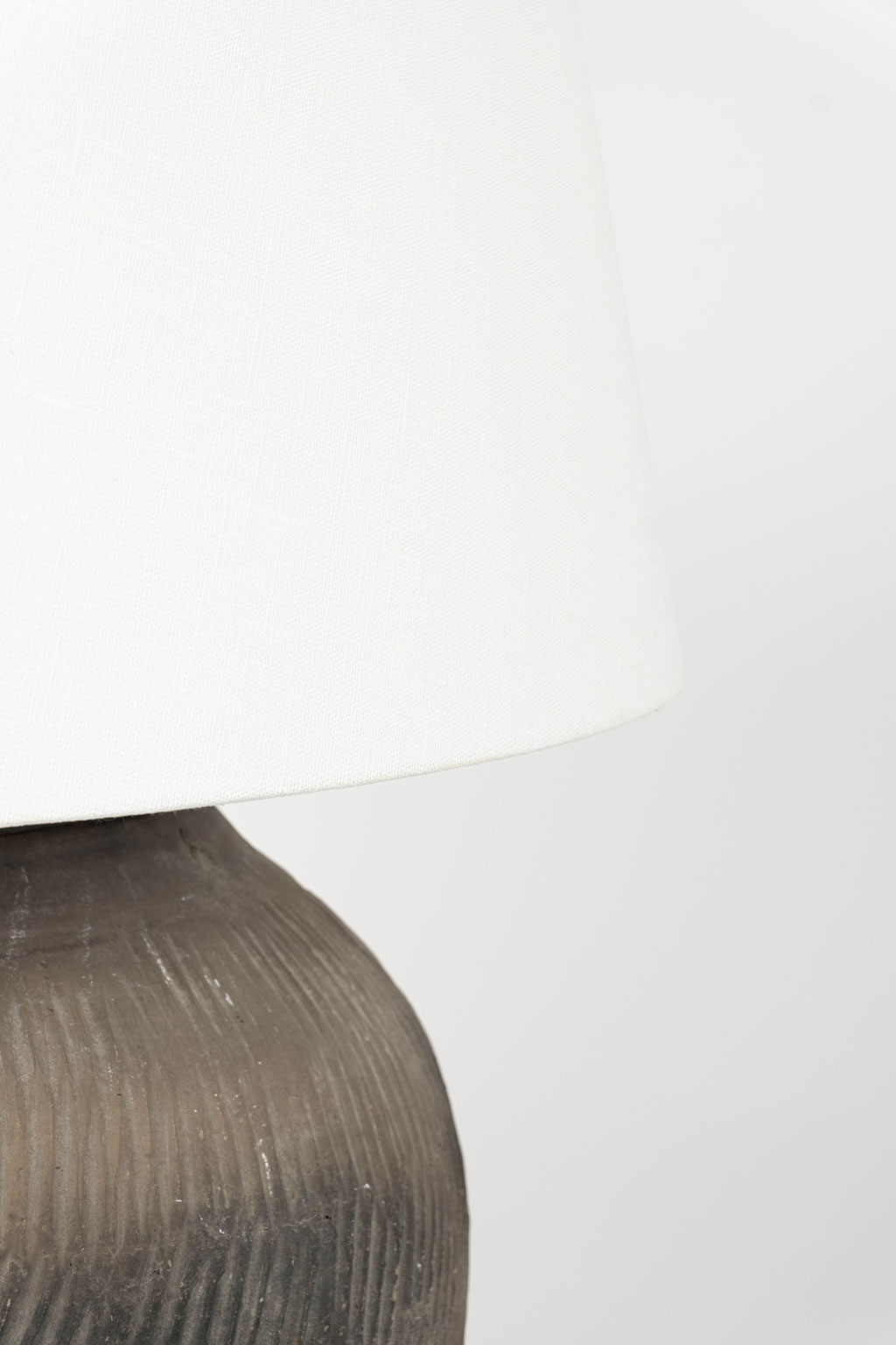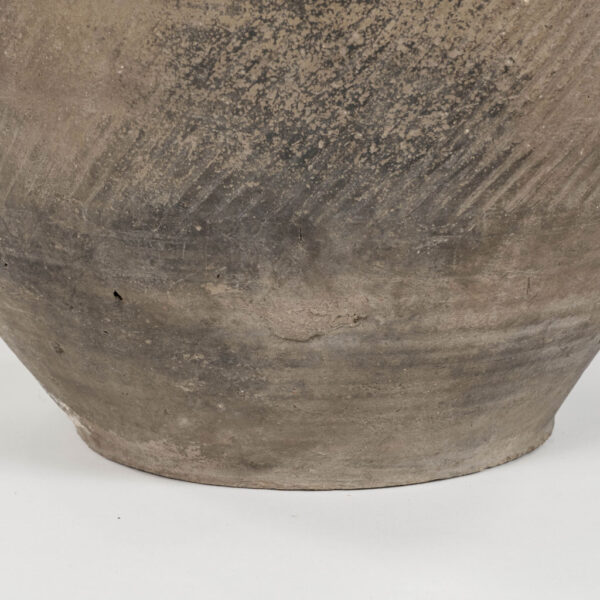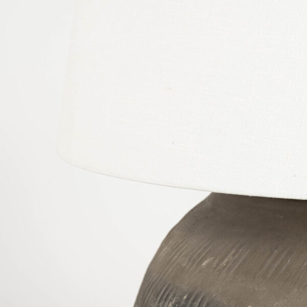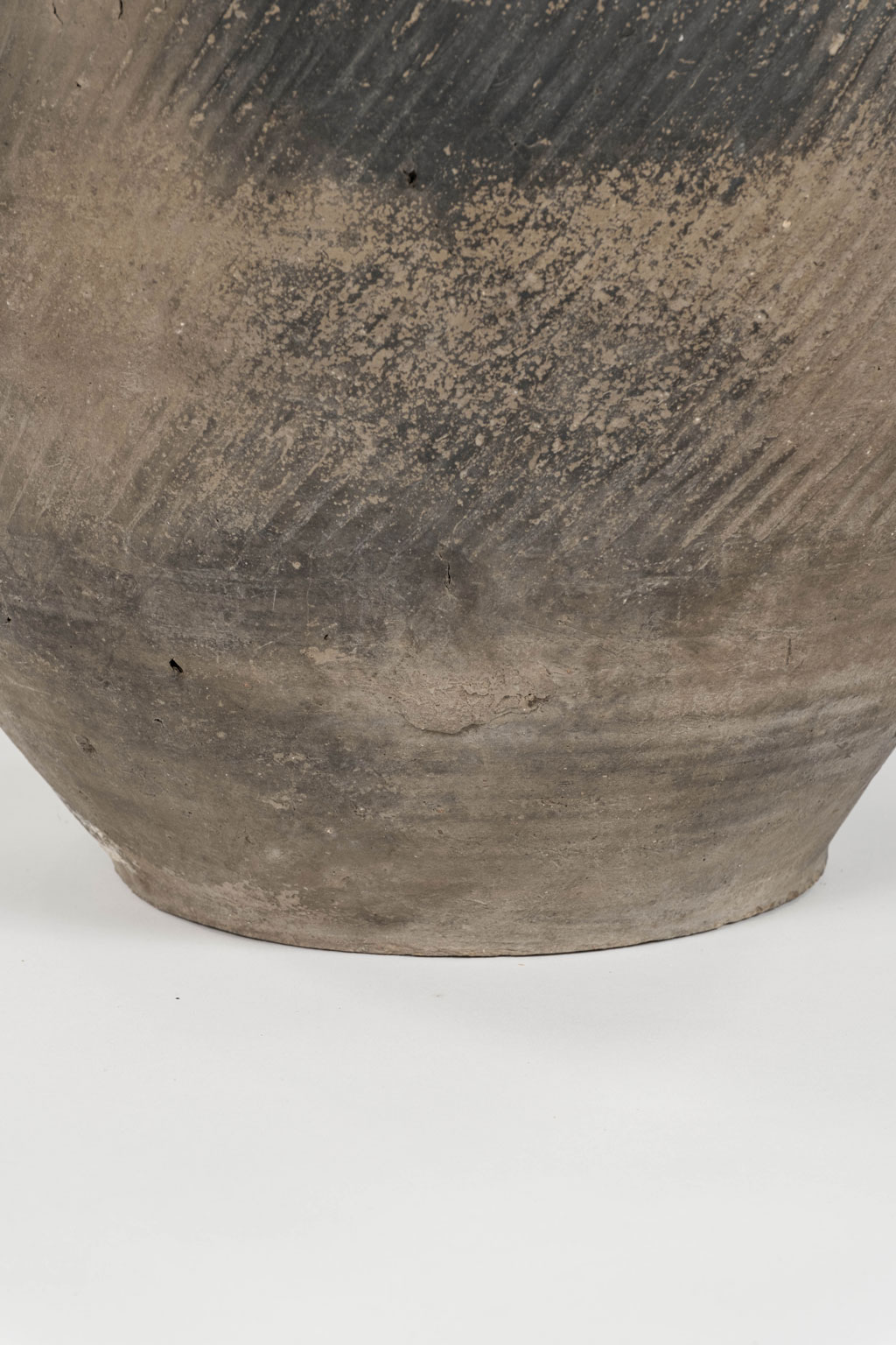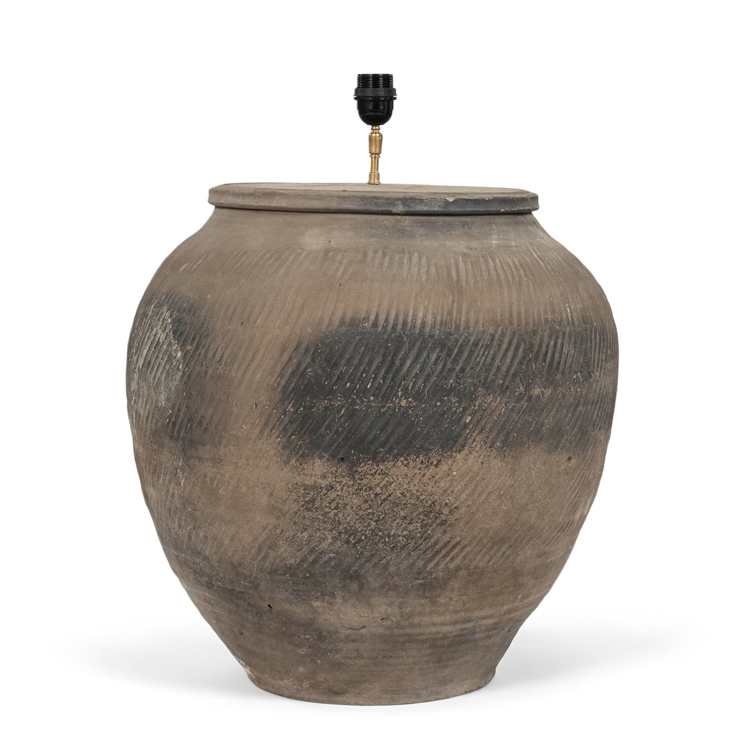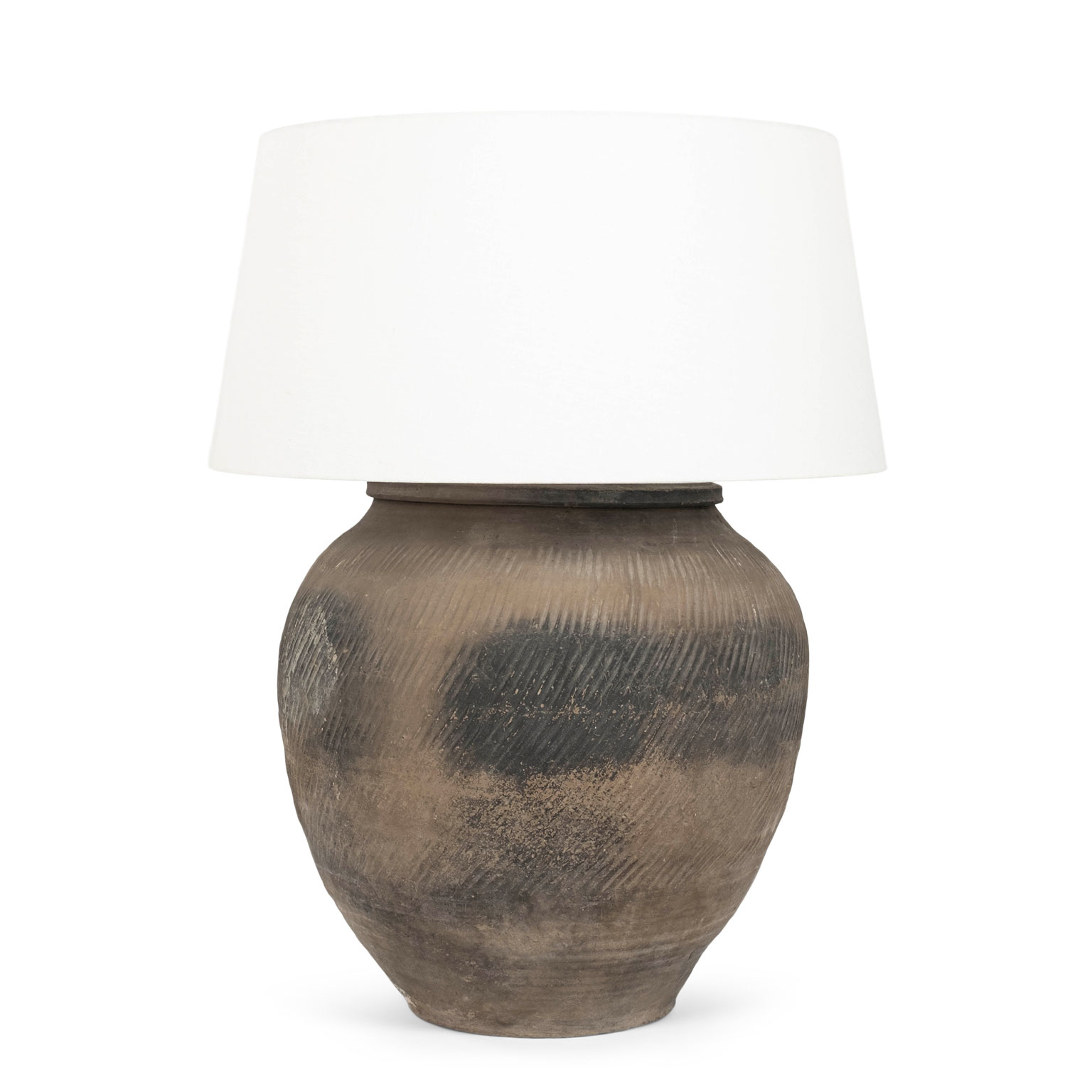 Large Chinese storage jar lamp with linen shade. Handmade Chinese storage jar in matte brown and gray finish. Newly wired as custom lamp with line switch. Shallow drum linen shade with rolled edge.