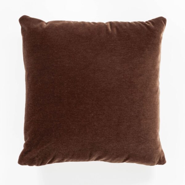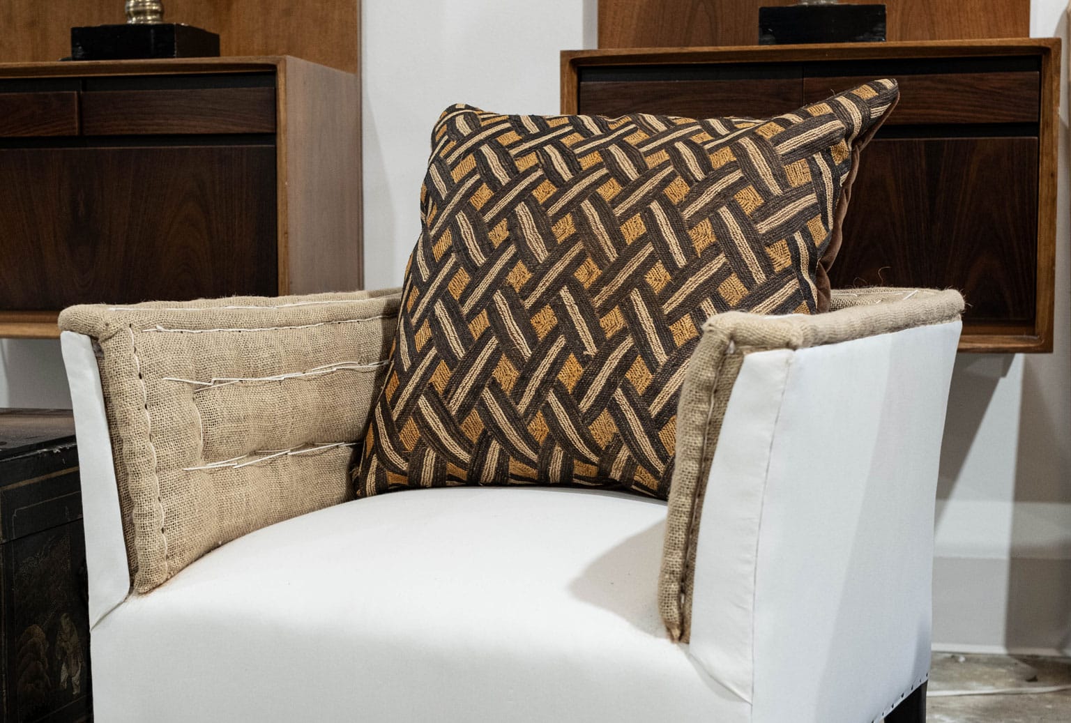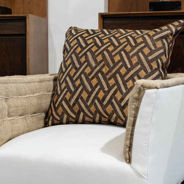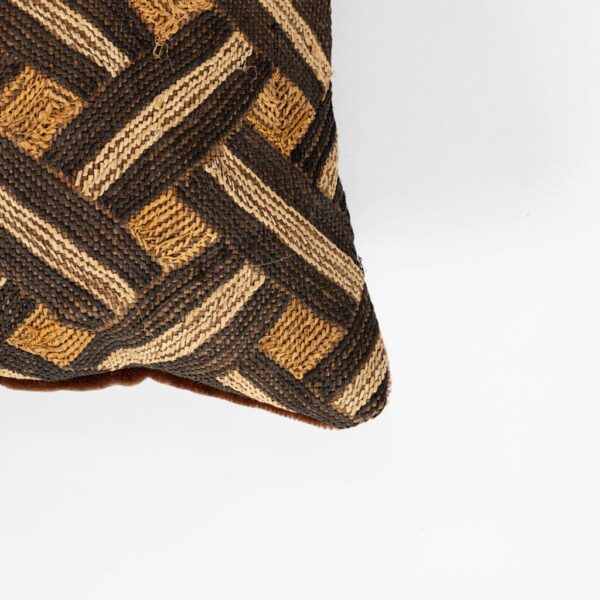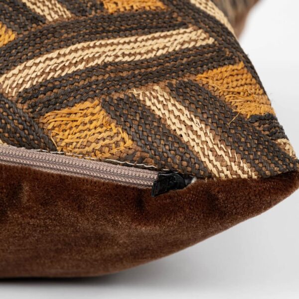 Large custom cushion from vintage African Kuba cloth. Hand-dyed raphia palm handwoven in an interlocking pattern. Backed by brown velvet. Includes zip fastener and feather insert.