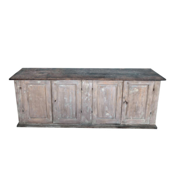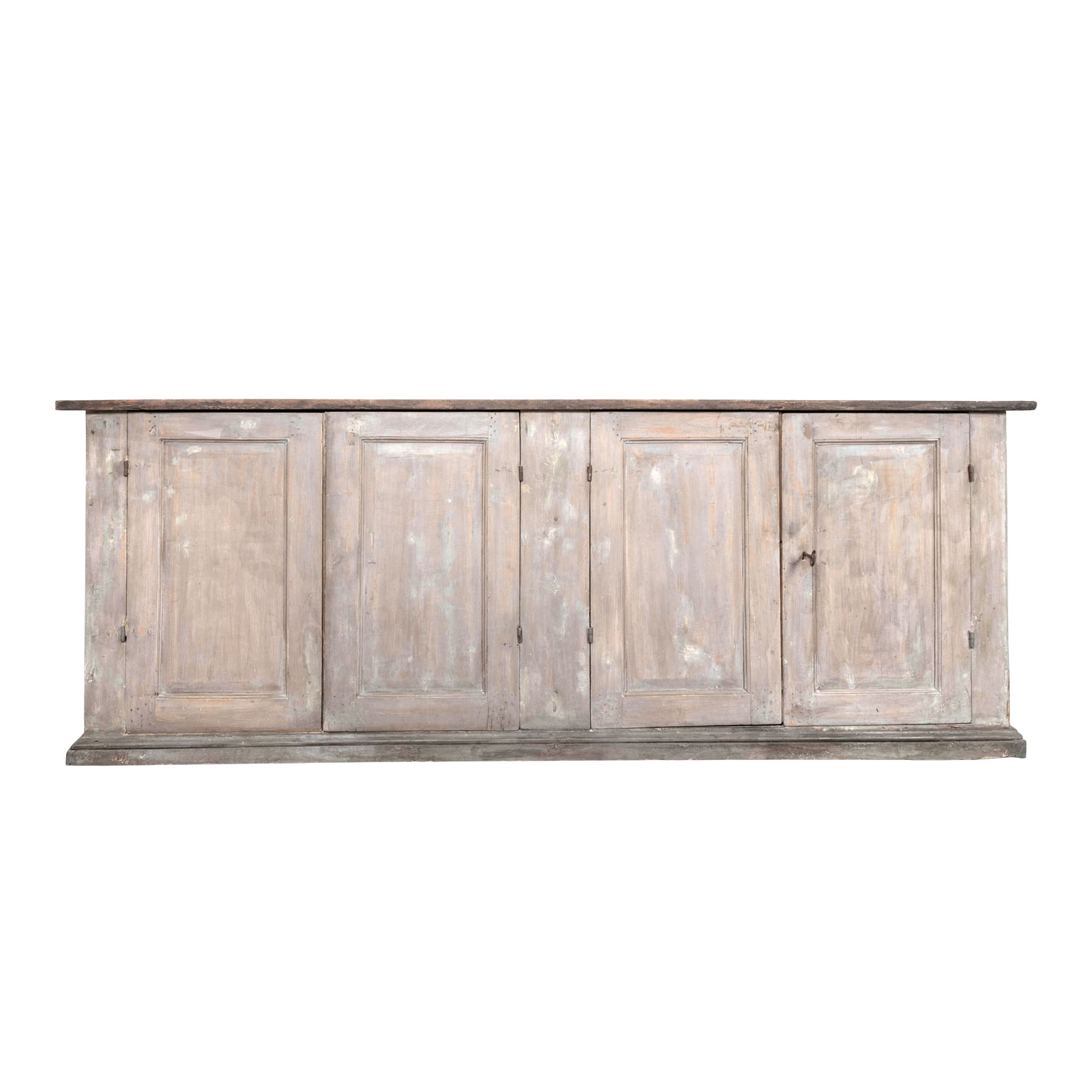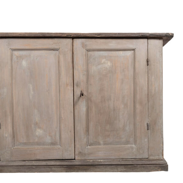 Large four-door painted enfilade, circa 1850-1889, France. Large rustic French enfilade buffet with gray painted with warm salmon color undertones. Large rustic wooden top. Surface edges are smoothed and rounded from centuries of natural wear and use. Old iron ‘staples’ in panels of doors to prevent the common problem of panel splitting and separation. Sturdy, stable. Working locks and key.
