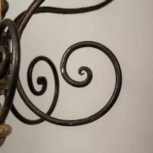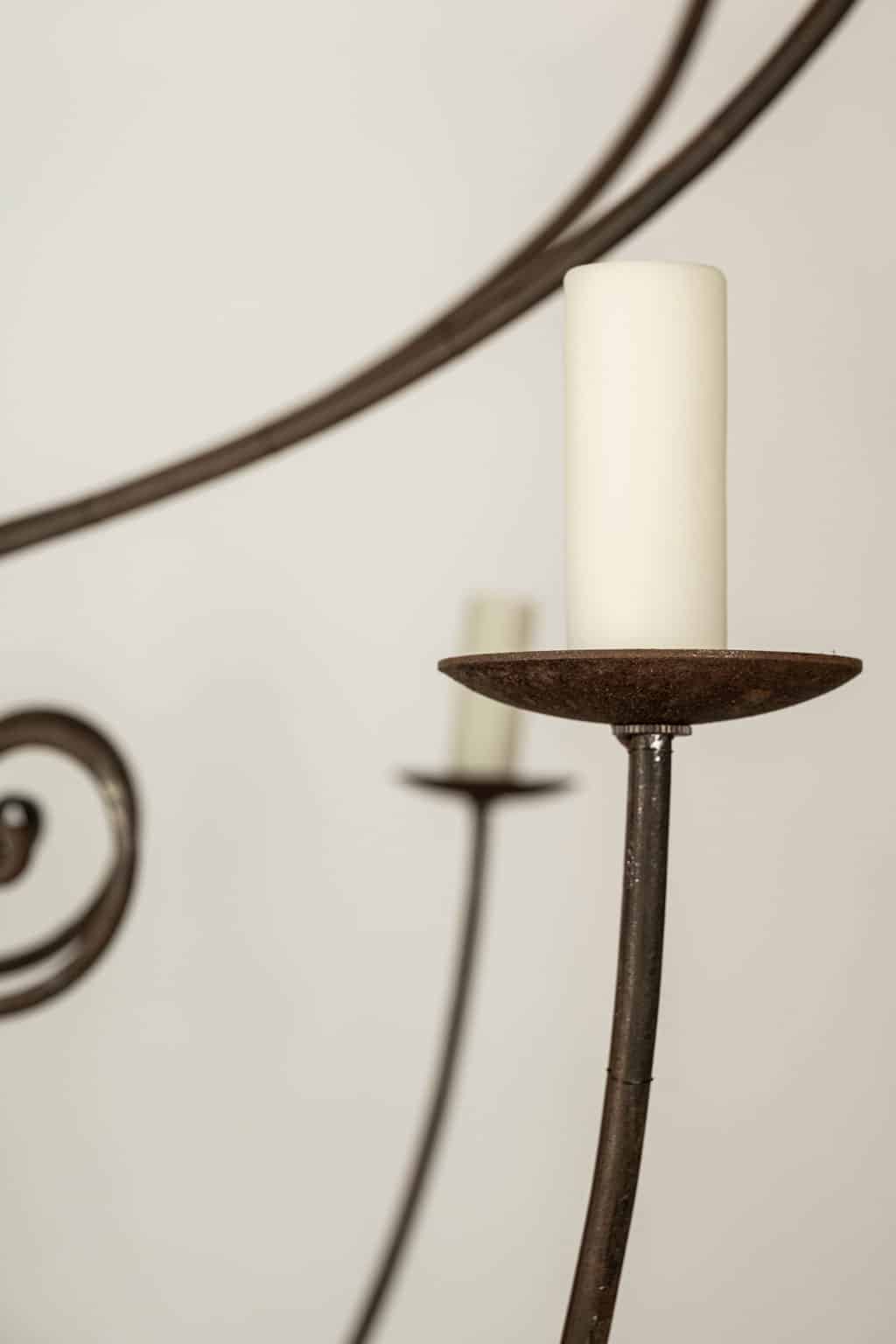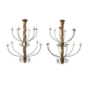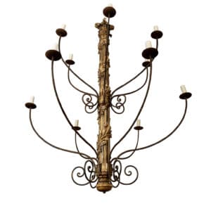 Large hand-carved and gilded Italian twelve arm chandelier newly wired. Giltwood garland hand-carved around its gilded and gray-green painted fluted body. Restored with twelve newly forged iron arms in two tiers (six arms in each tier). Newly wired with medium size sockets. Includes chain and a canopy. Two chandeliers available and sold individually priced $14,800 each.