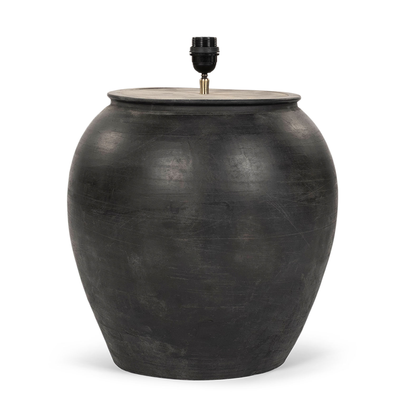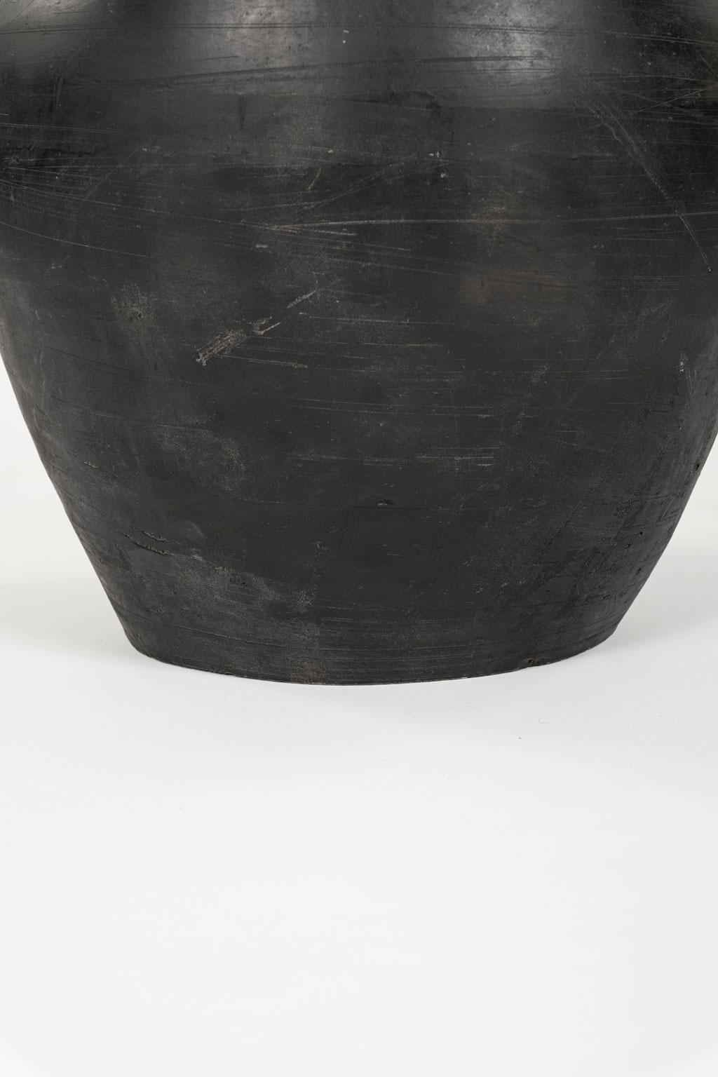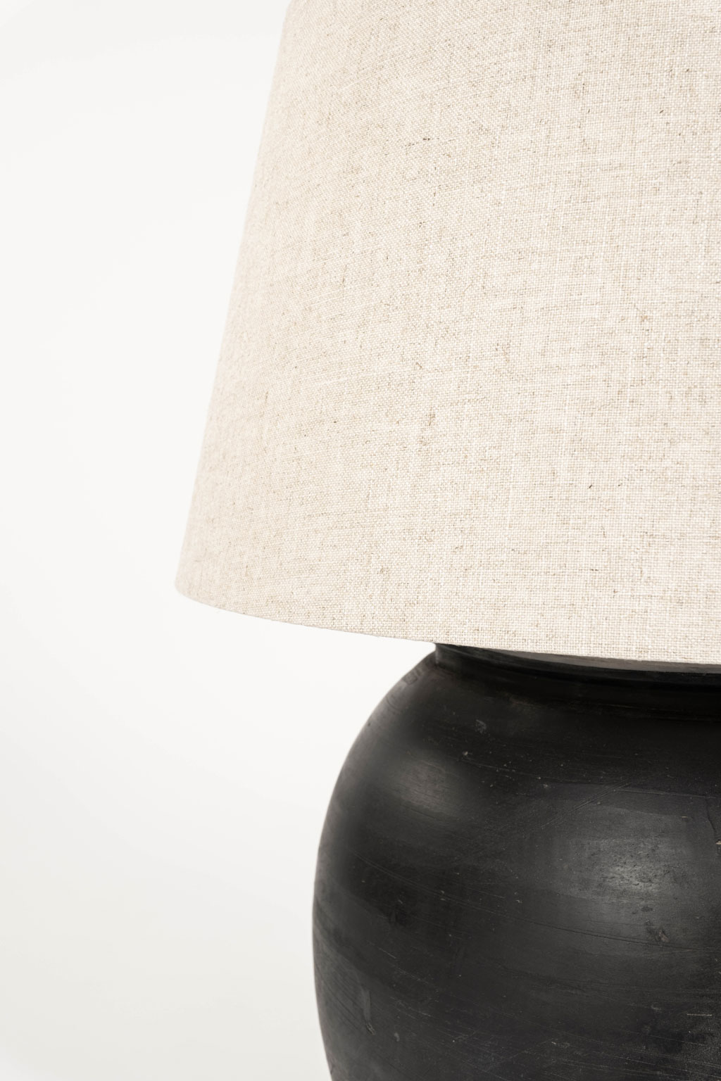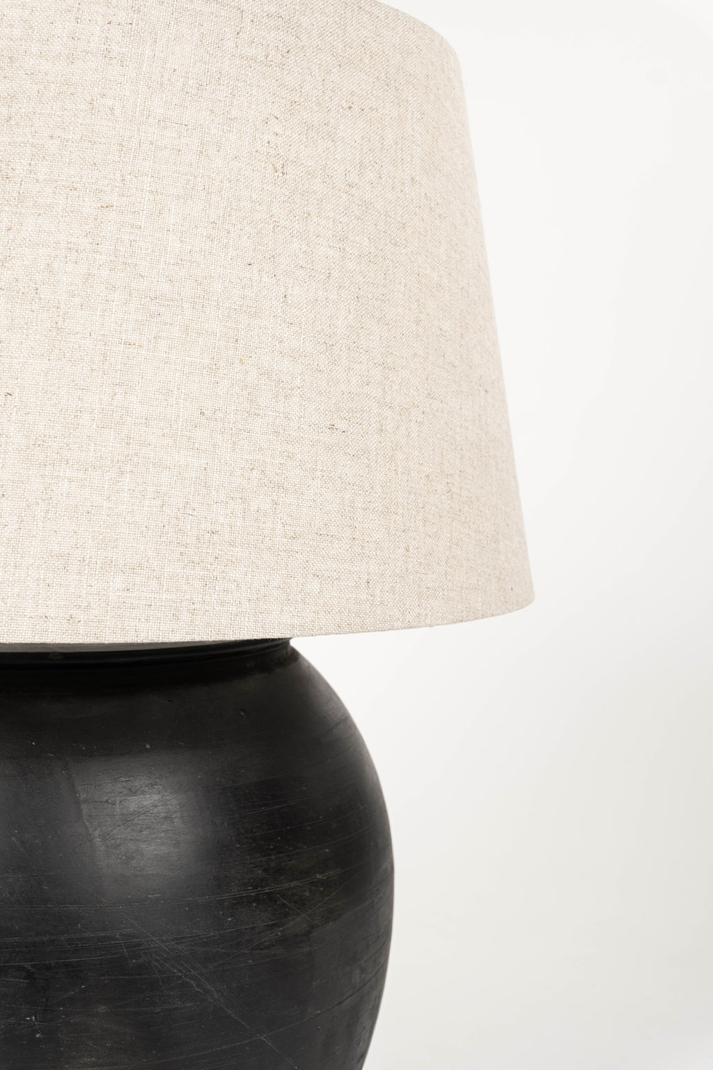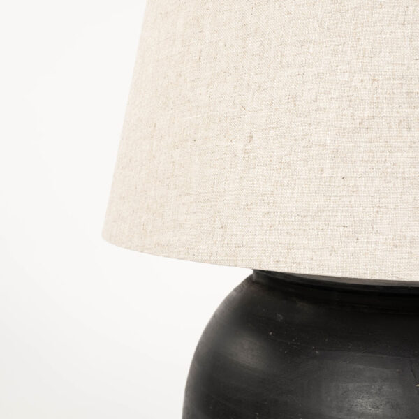 Large matte black pottery lamp with linen drum shade. Newly wired for use within the USA with line switch.