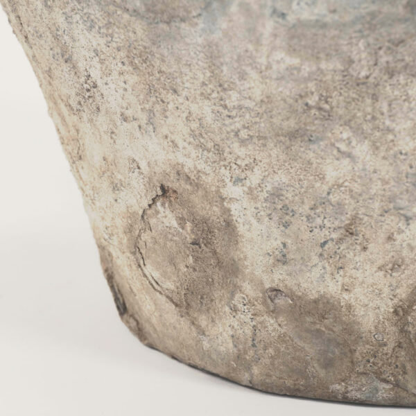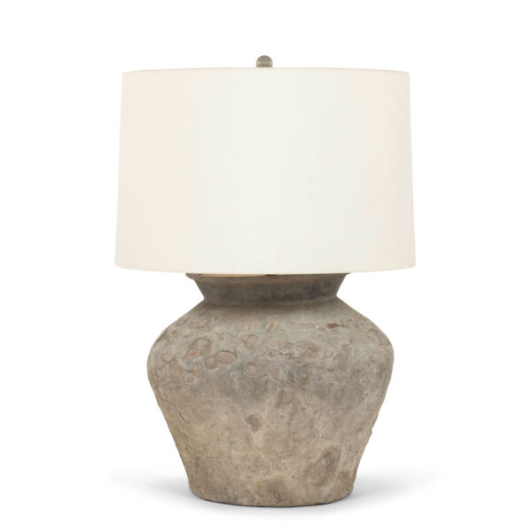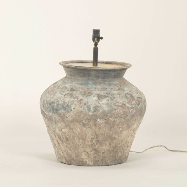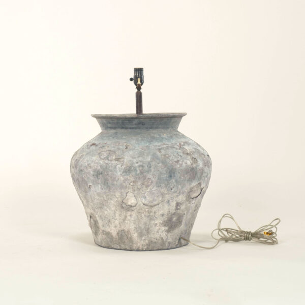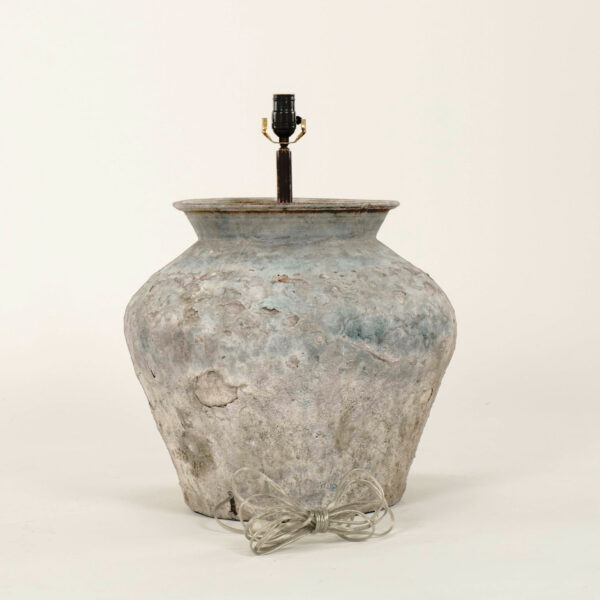Large vintage Cambodian water jar lamp wired for use within the USA. Circa 1950-1979 terracotta jar created to collect rain water. Original bluish gray color and patina. Newly wired. Includes complimentary linen shade.