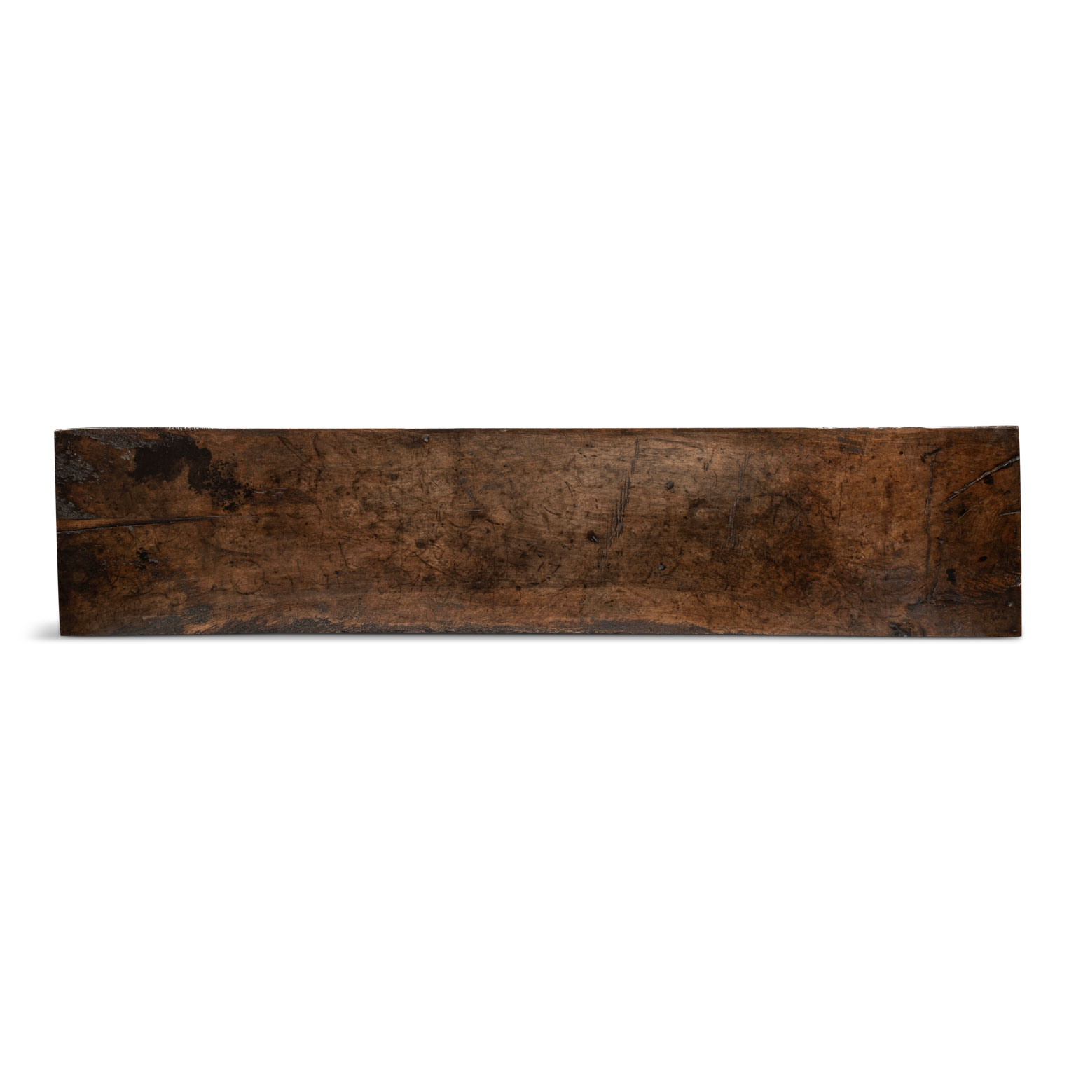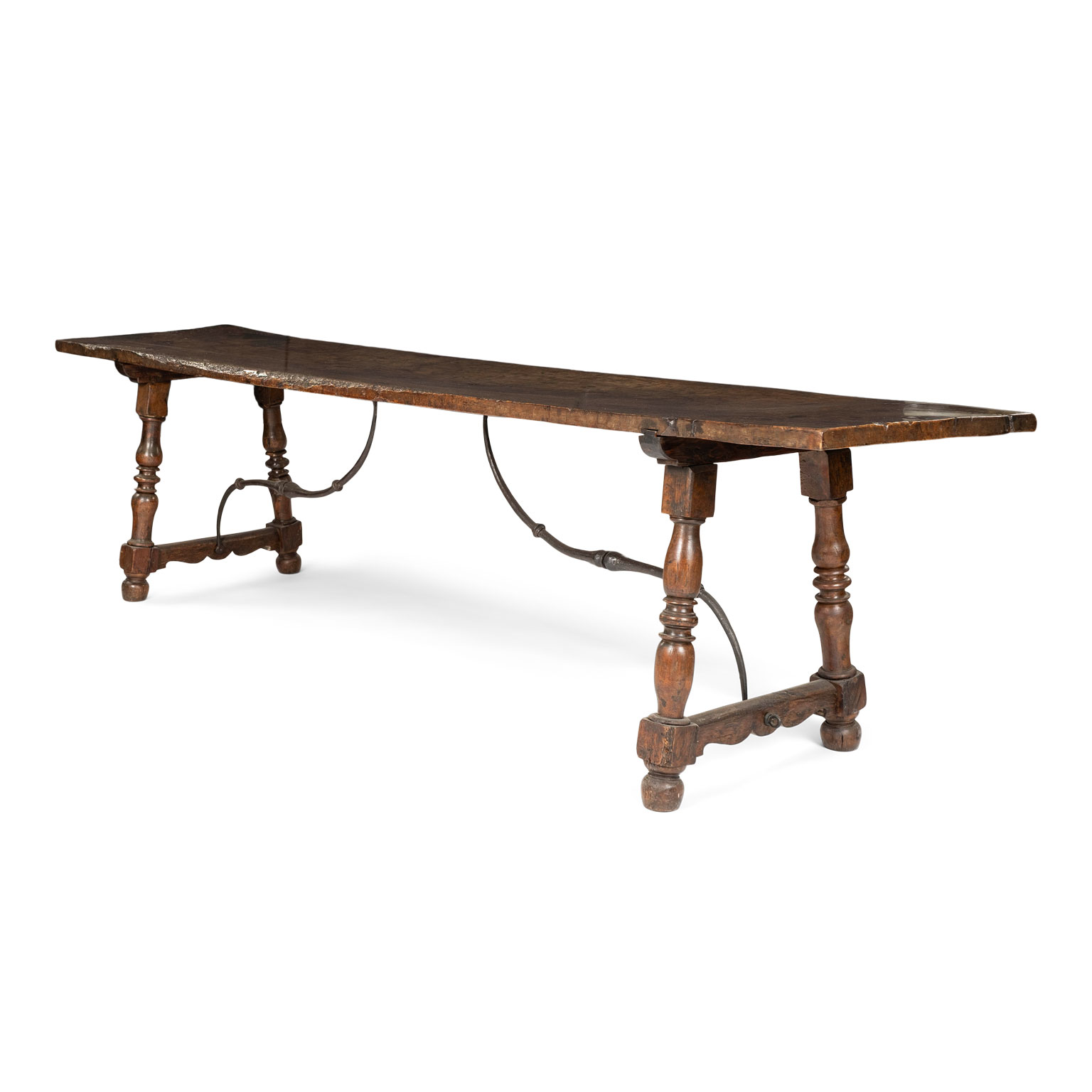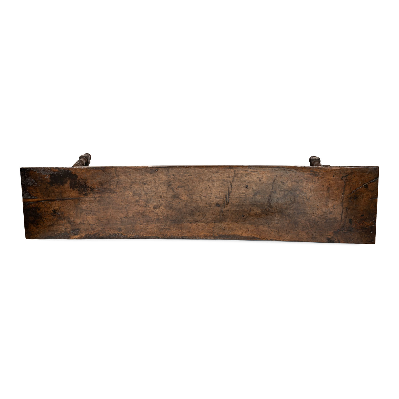 Long single-board top walnut Italian console, hand-carved circa 1650-1689. Mortise and tenon joints, original forged iron trestle.