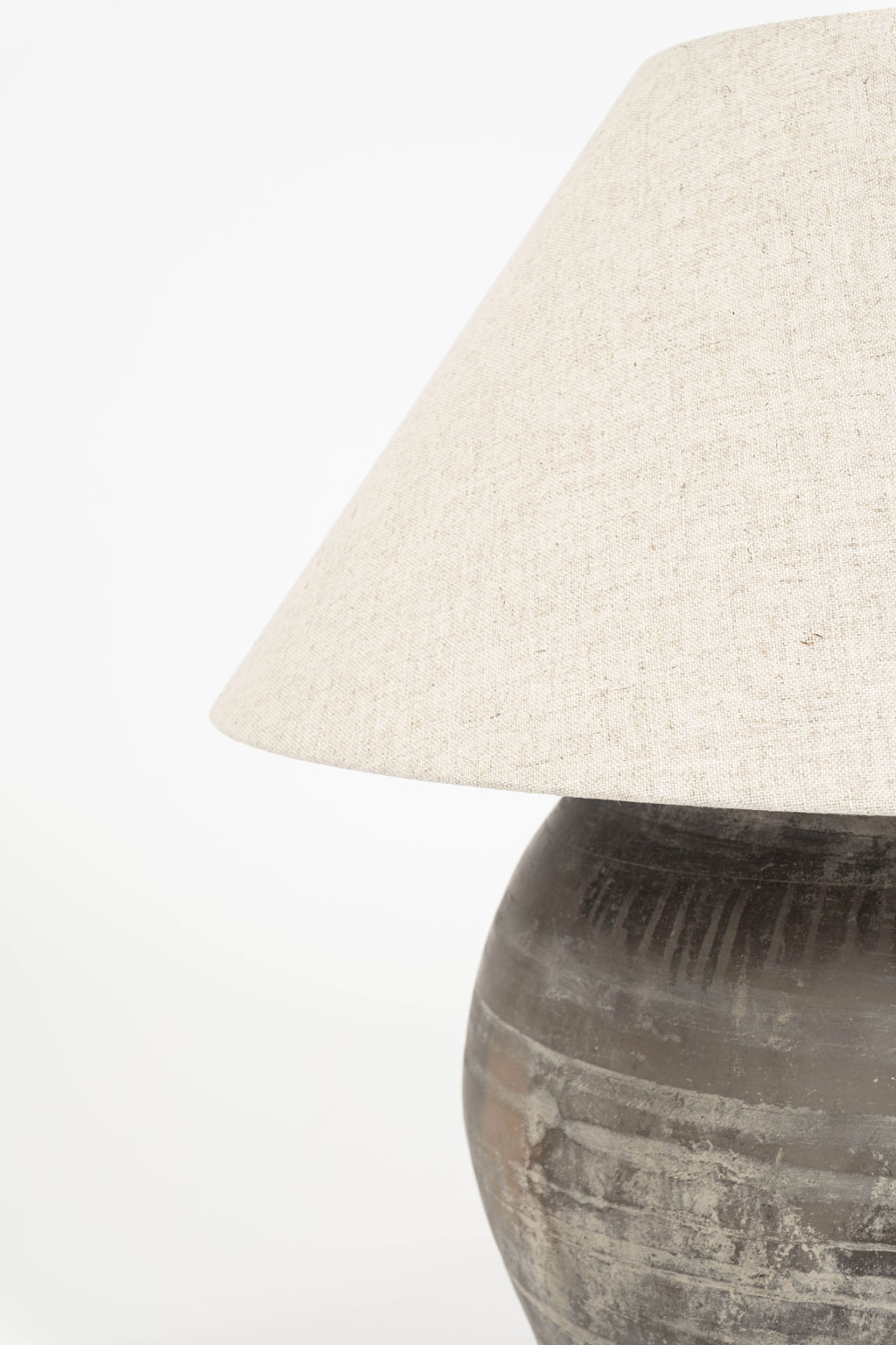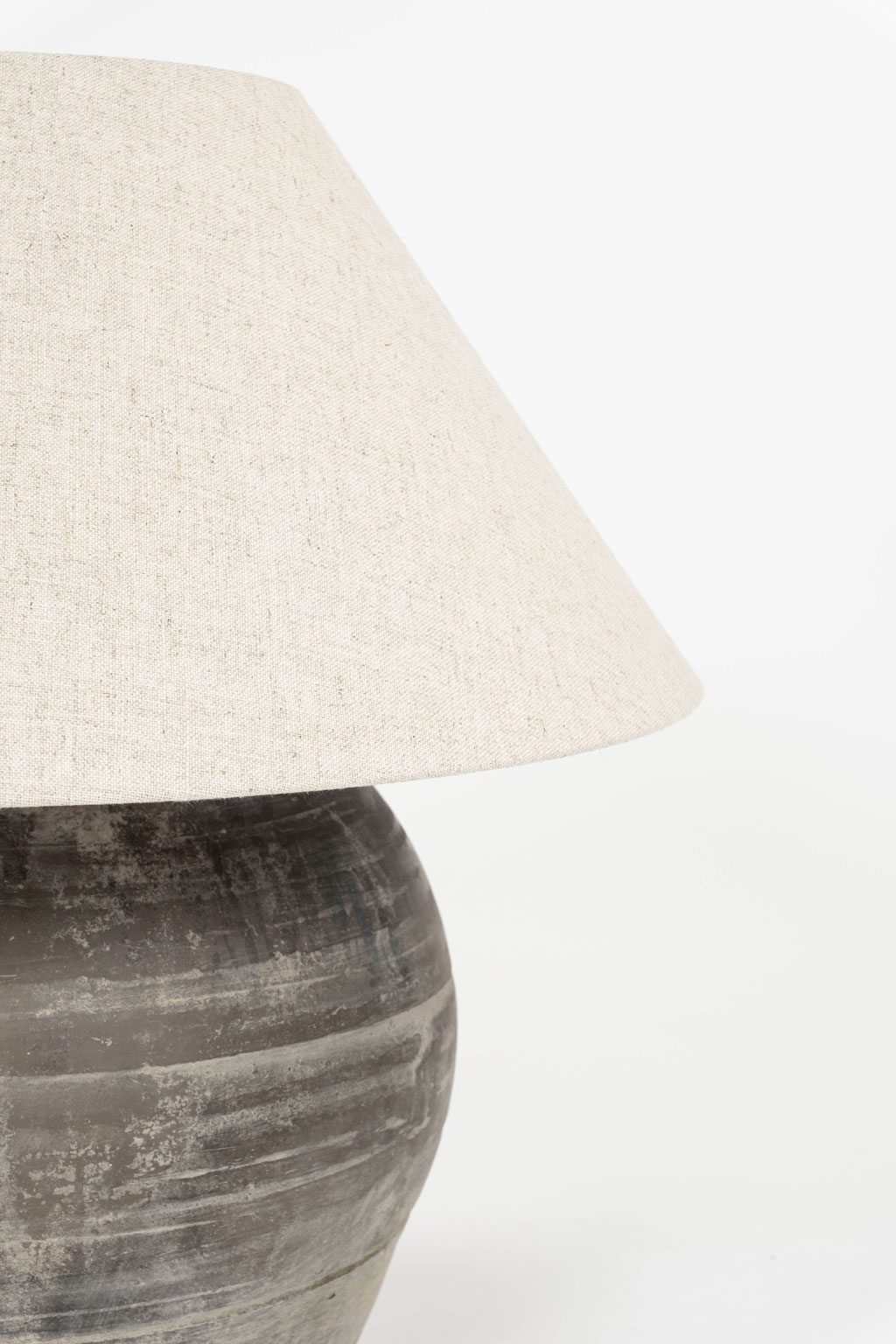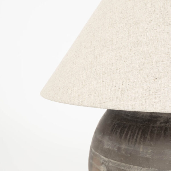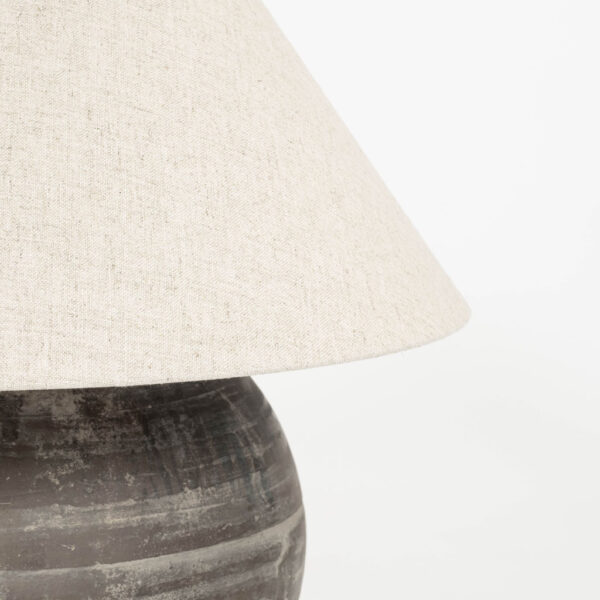 Matte black pottery table lamp with linen shade. Newly wired for use within the USA with line switch.