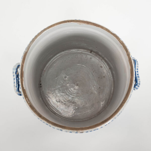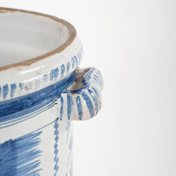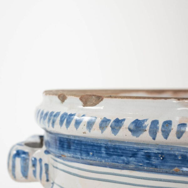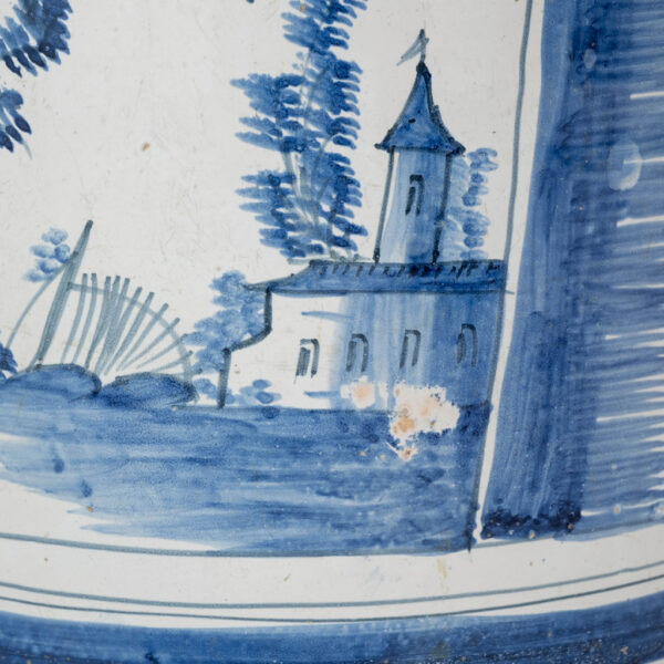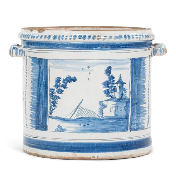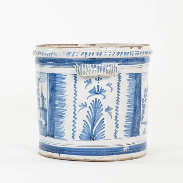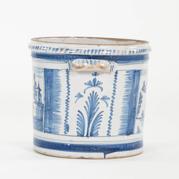 Nevers Faience ‘Pot a Oranger’ adorned with painted farmhouse scenes and scrolled decoration in shades of blue (camaieu bleu). This circa 1780-1800 tin-glazed planter comes from Nevers, France, an important site of faience production in the 18th century. Unusually large size.