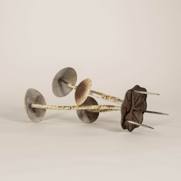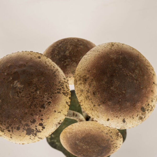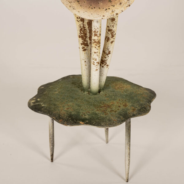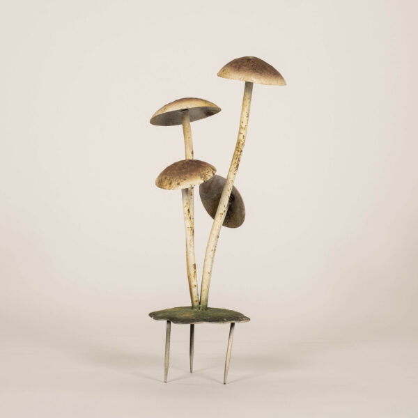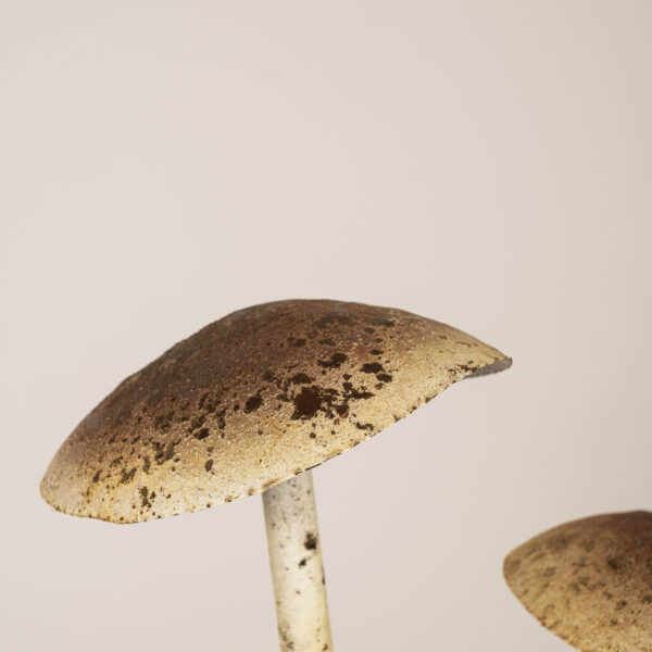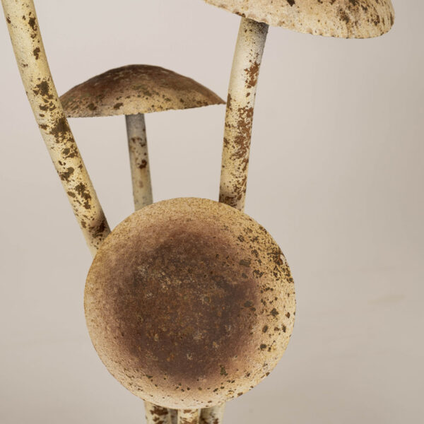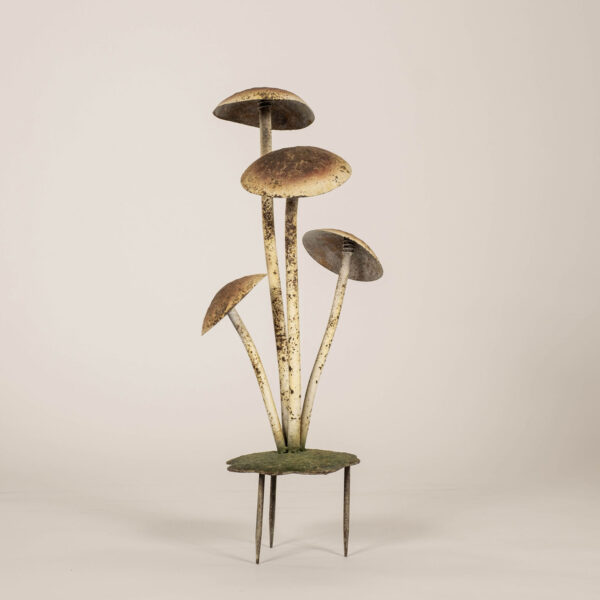 Painted French tole mushroom decoration for planters or gardens. Circa 1950s. Twenty-six inches height total: 21 inches high above ground level and 5 inch long spikes below ground level to anchor sculpture. Six available – see last few photos for the group. Sold individually priced $820 each.