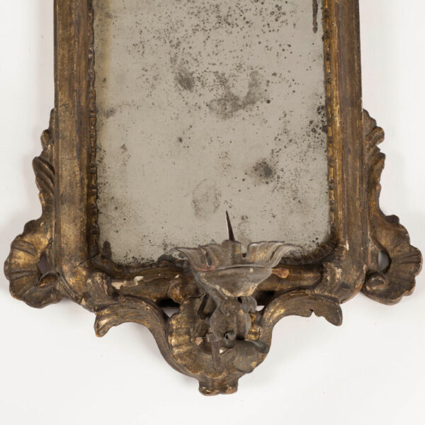 Pair of 18th century giltwood mirrored sconces. Circa 1750-1789. Hand-carved and gilded. Early mirror. Each projects a single tole arm for candles. Unwired. Sold together and priced $5,700 pair.