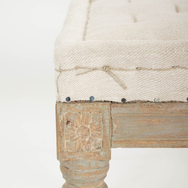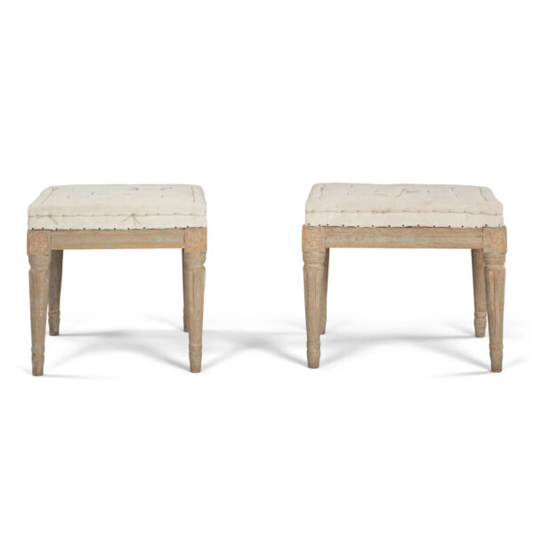 Pair of Gustavian stools circa 1810. Scrapped back to remnants of gray paint. Sold together and priced $6,800 for the pair.