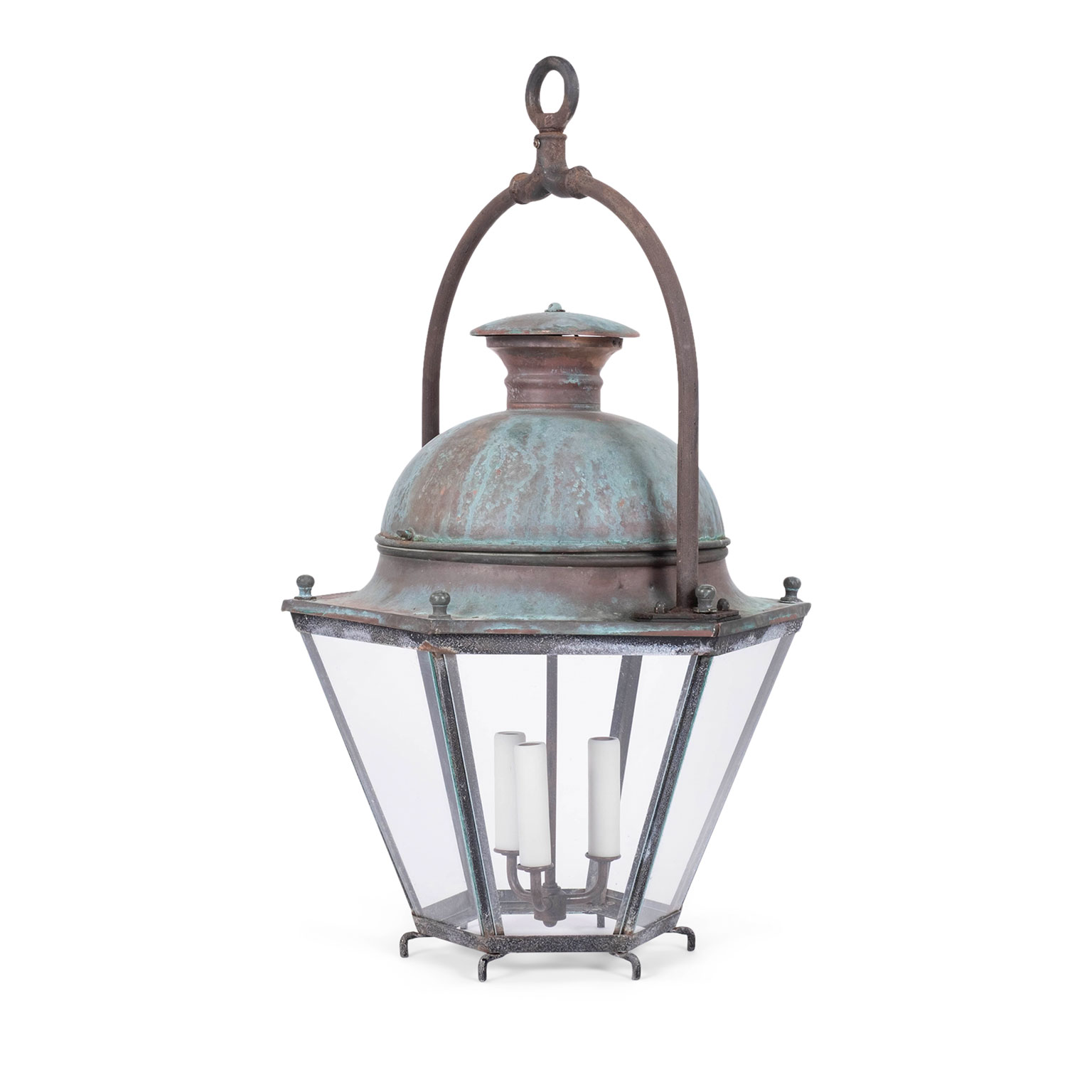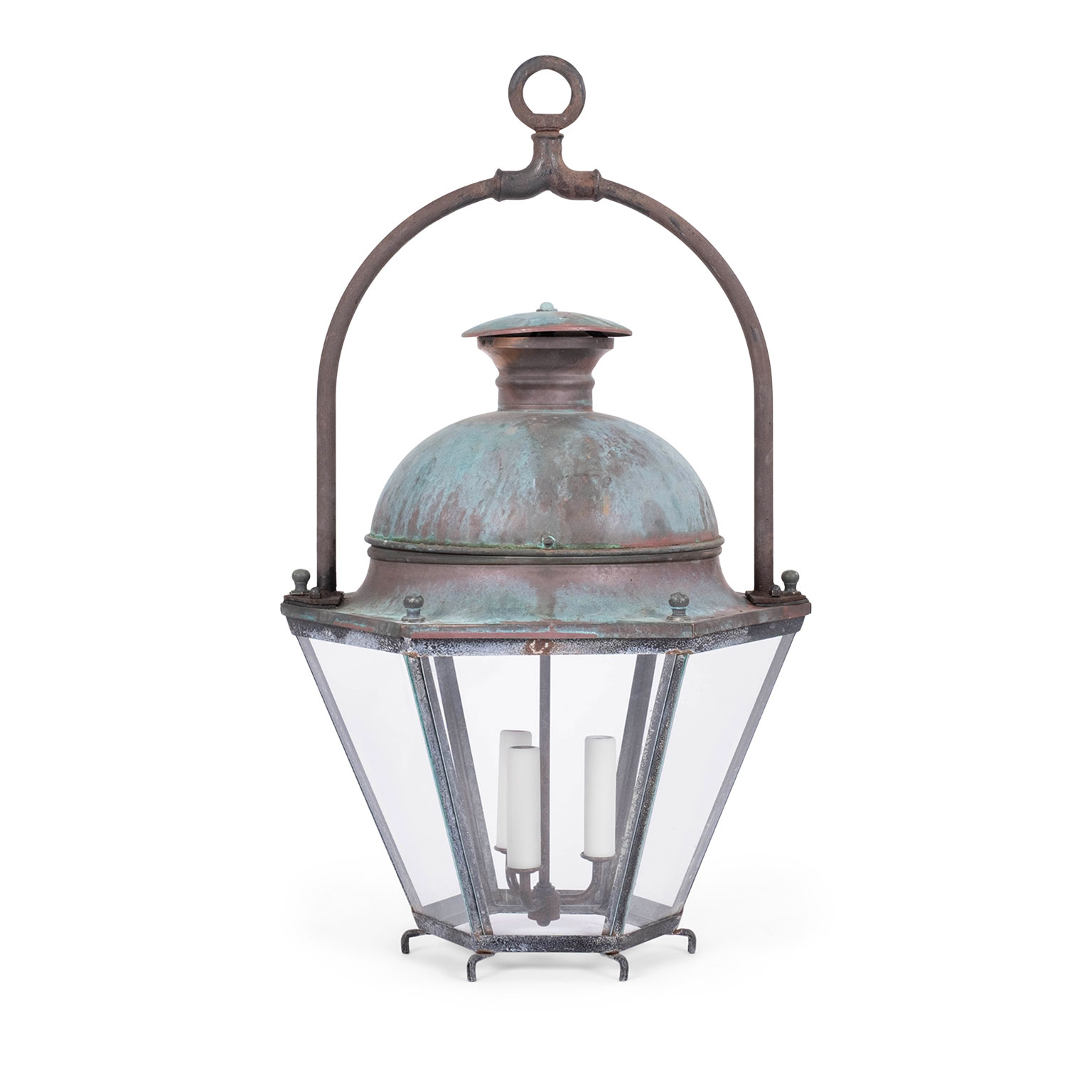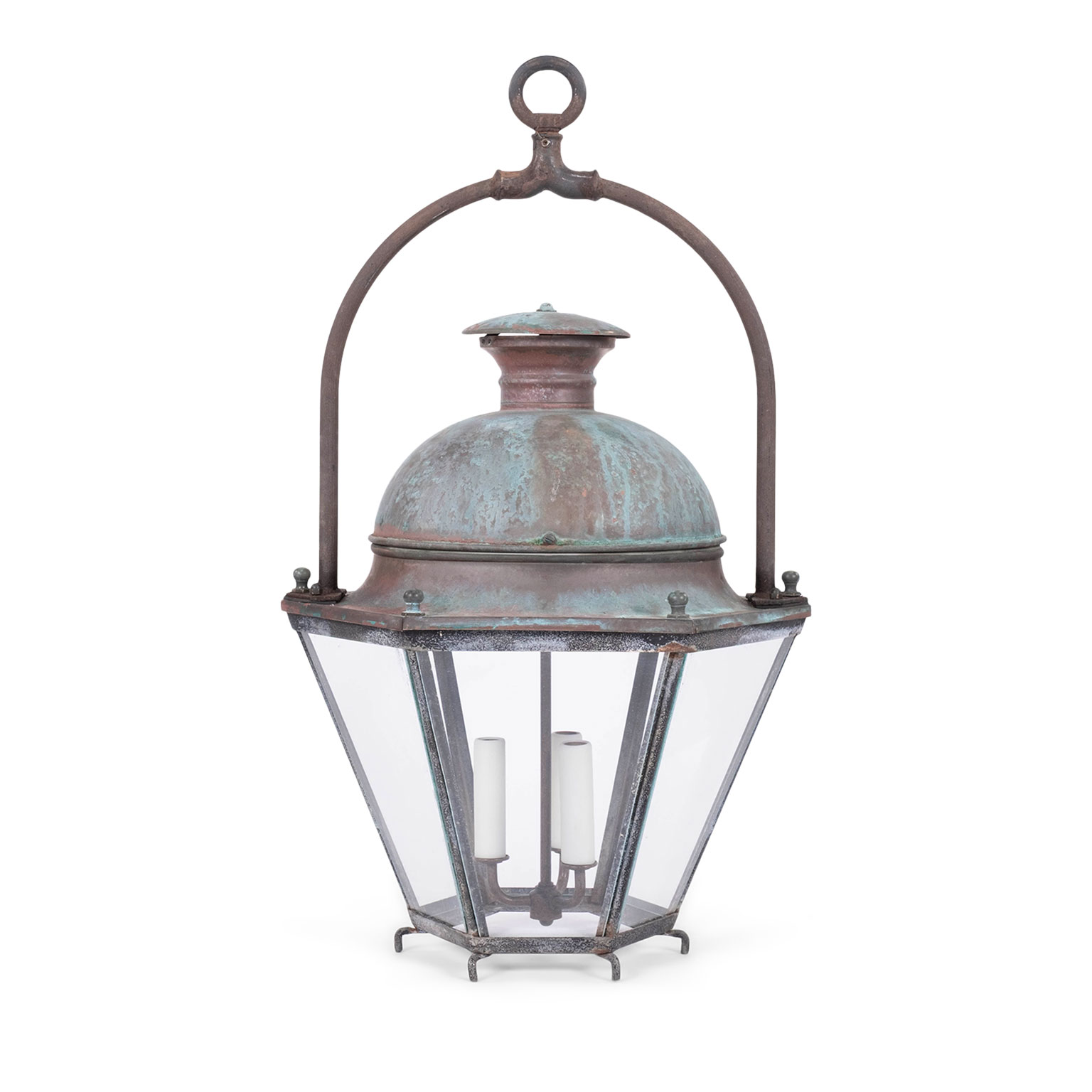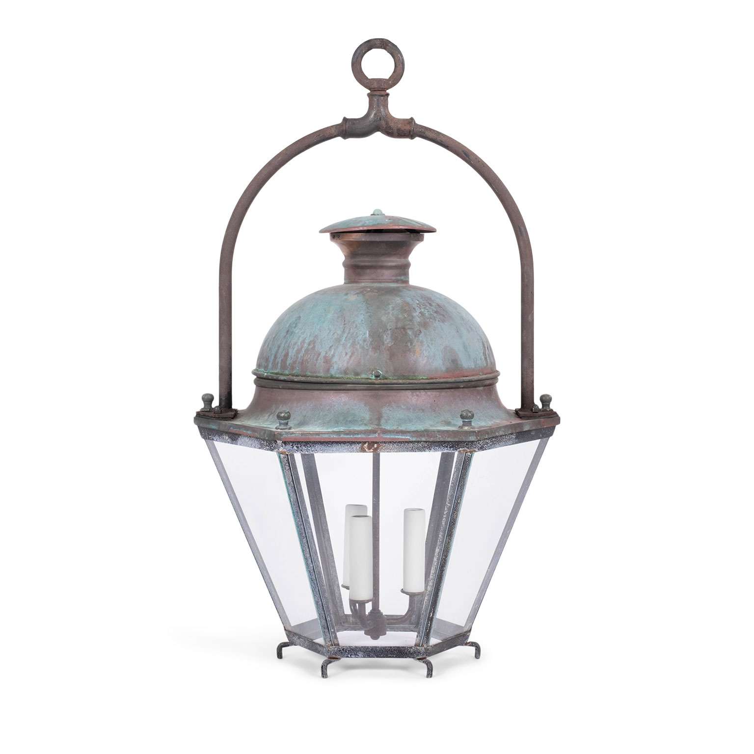 French hexagonal glass paneled domed verdigris green copper lantern dating to the early 20th century. Unwired.