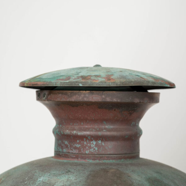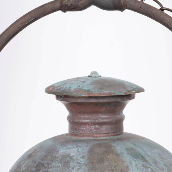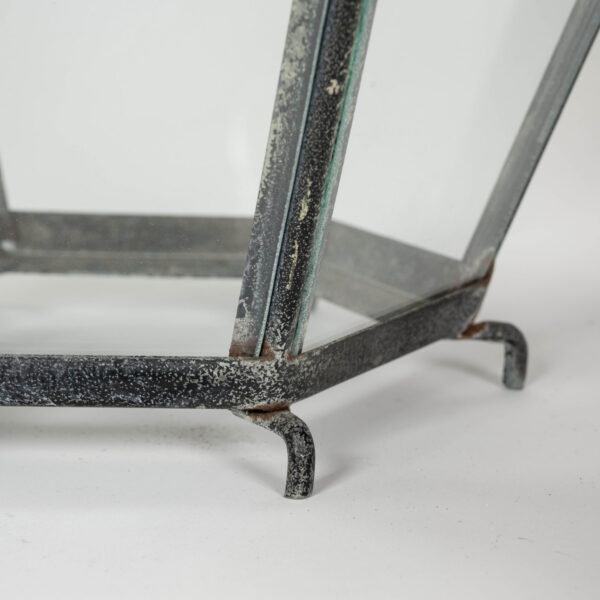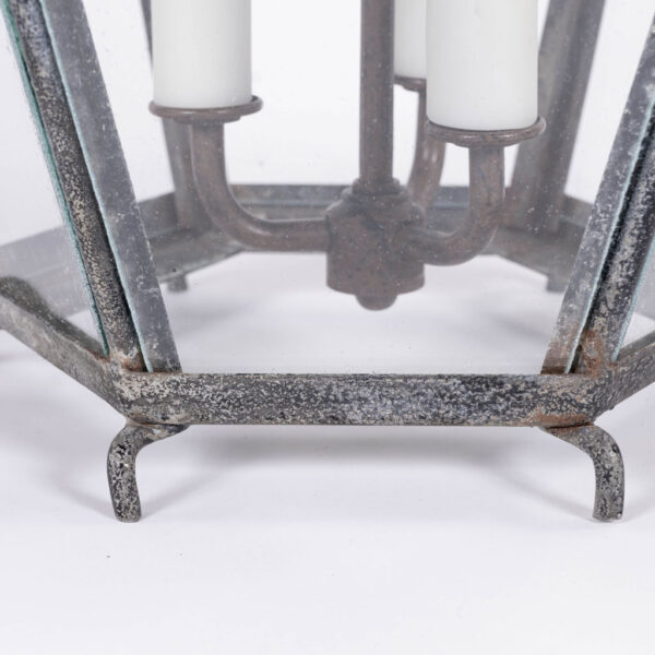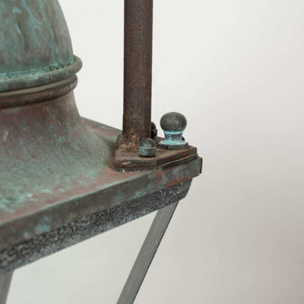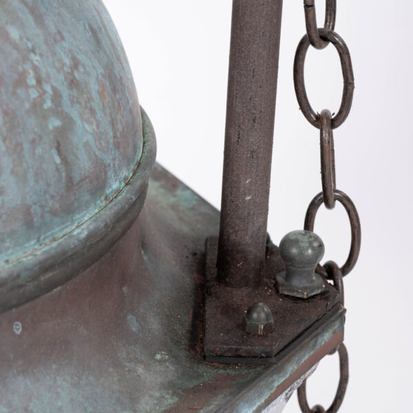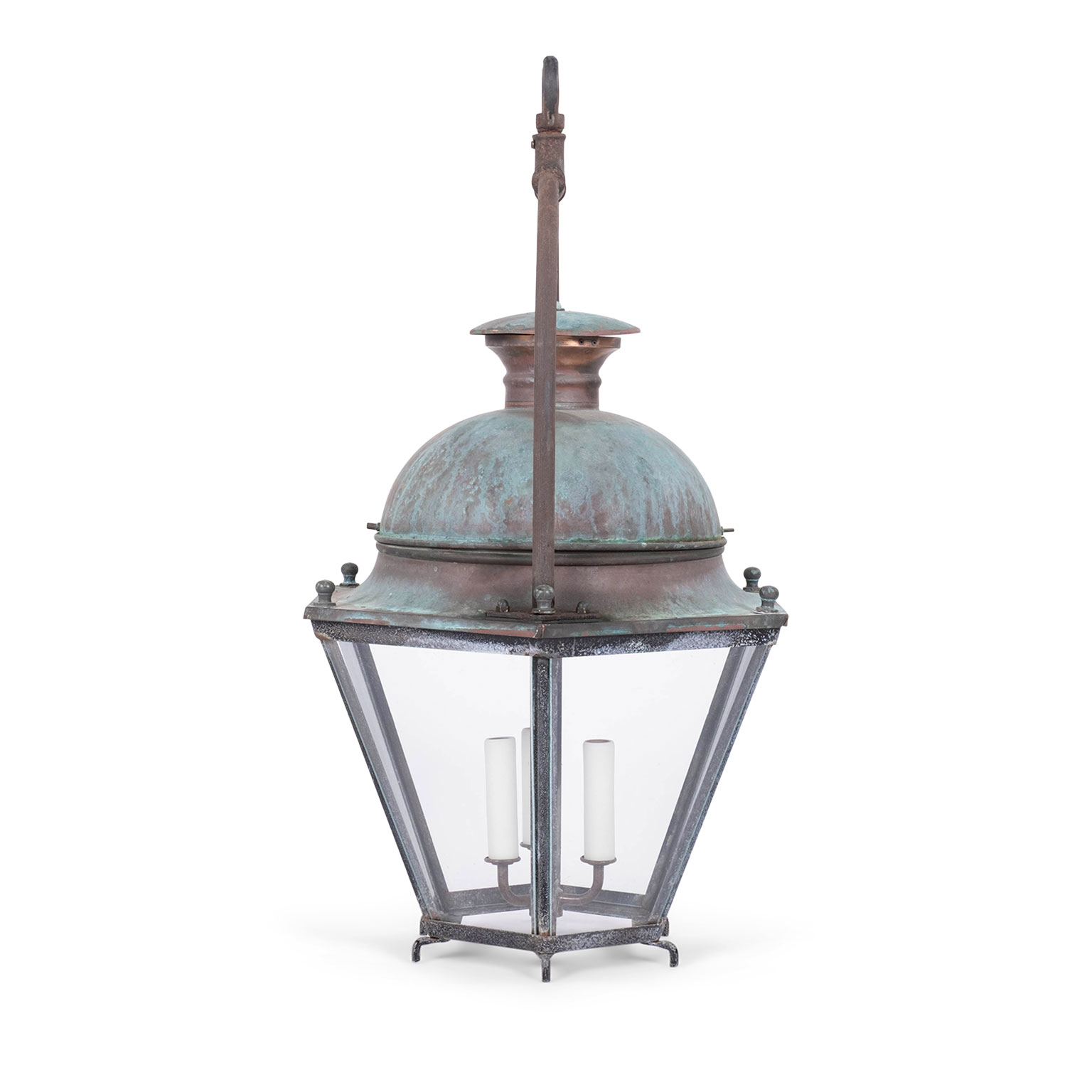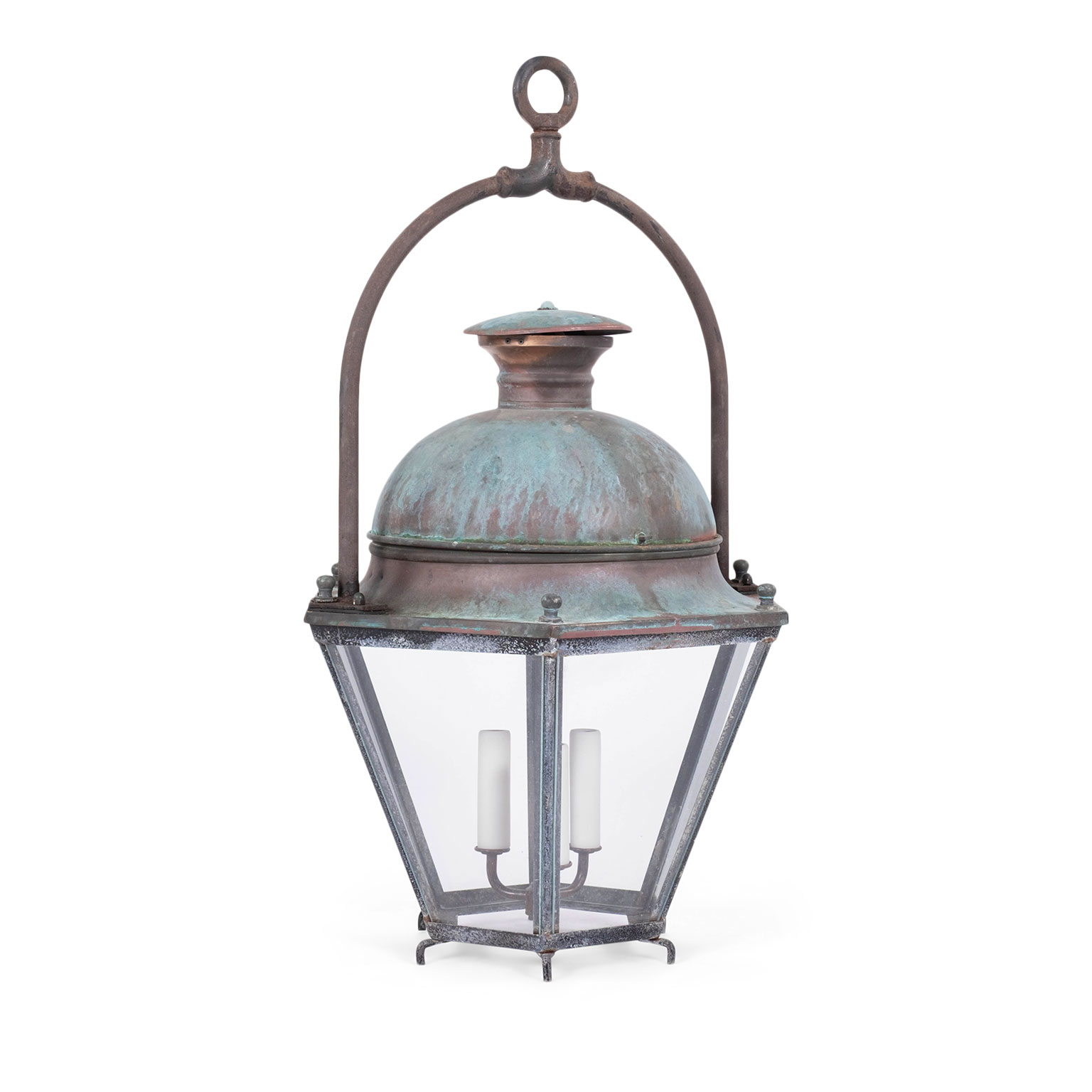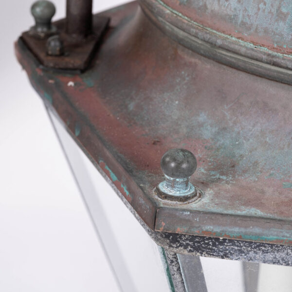 French hexagonal glass paneled domed verdigris green copper lantern dating to the early 20th century. Unwired.