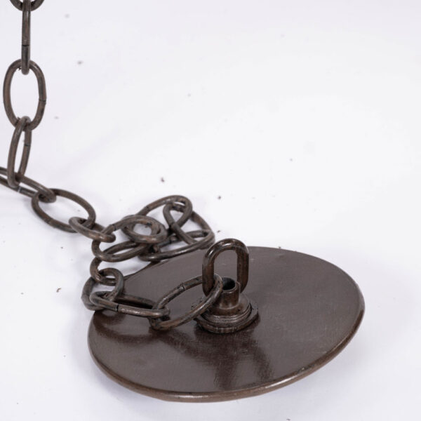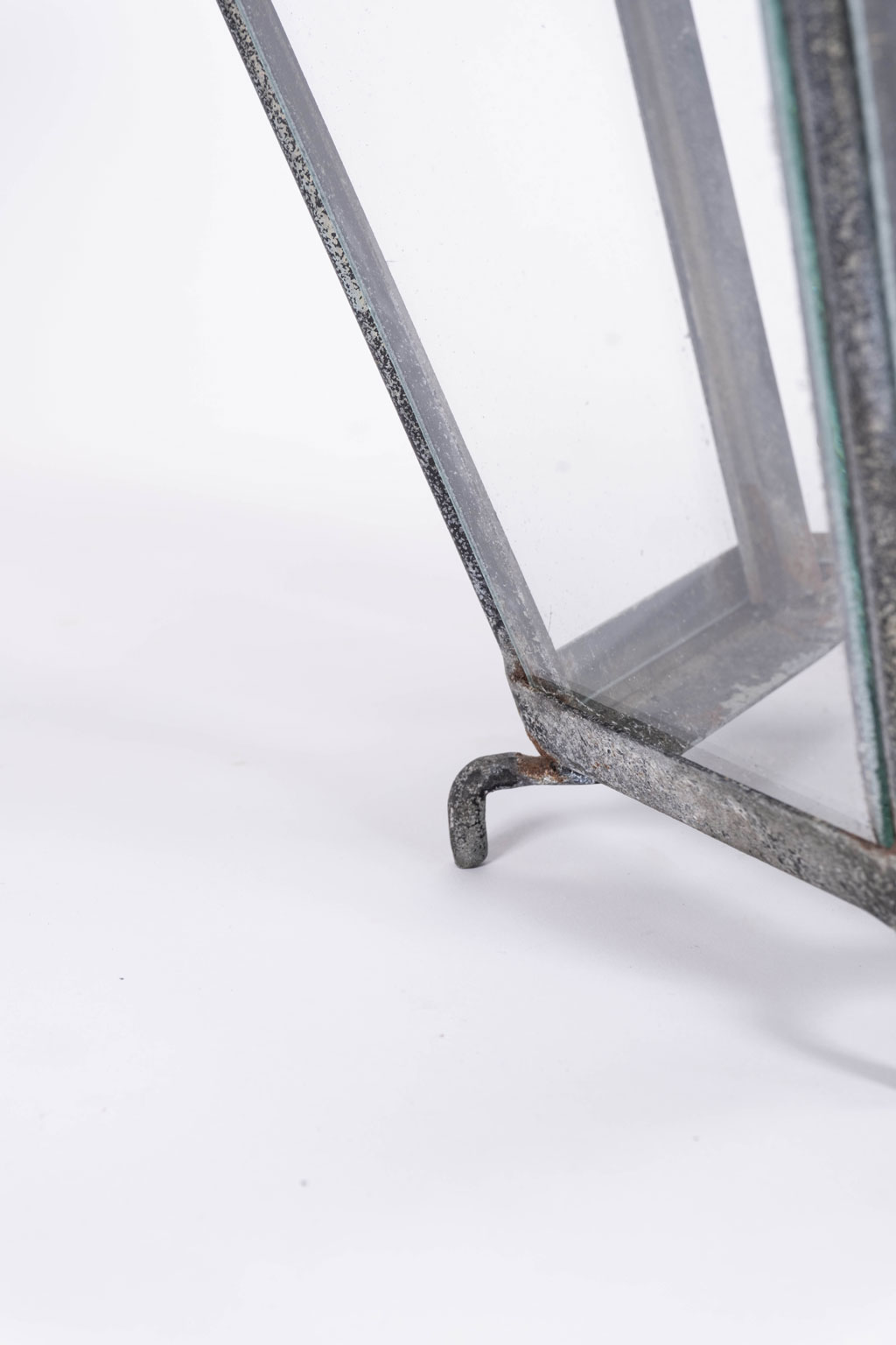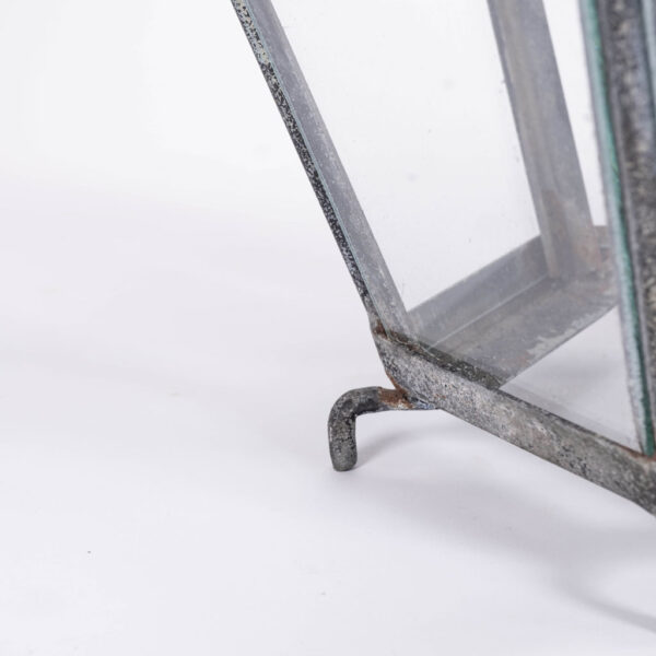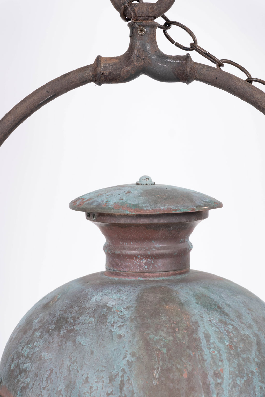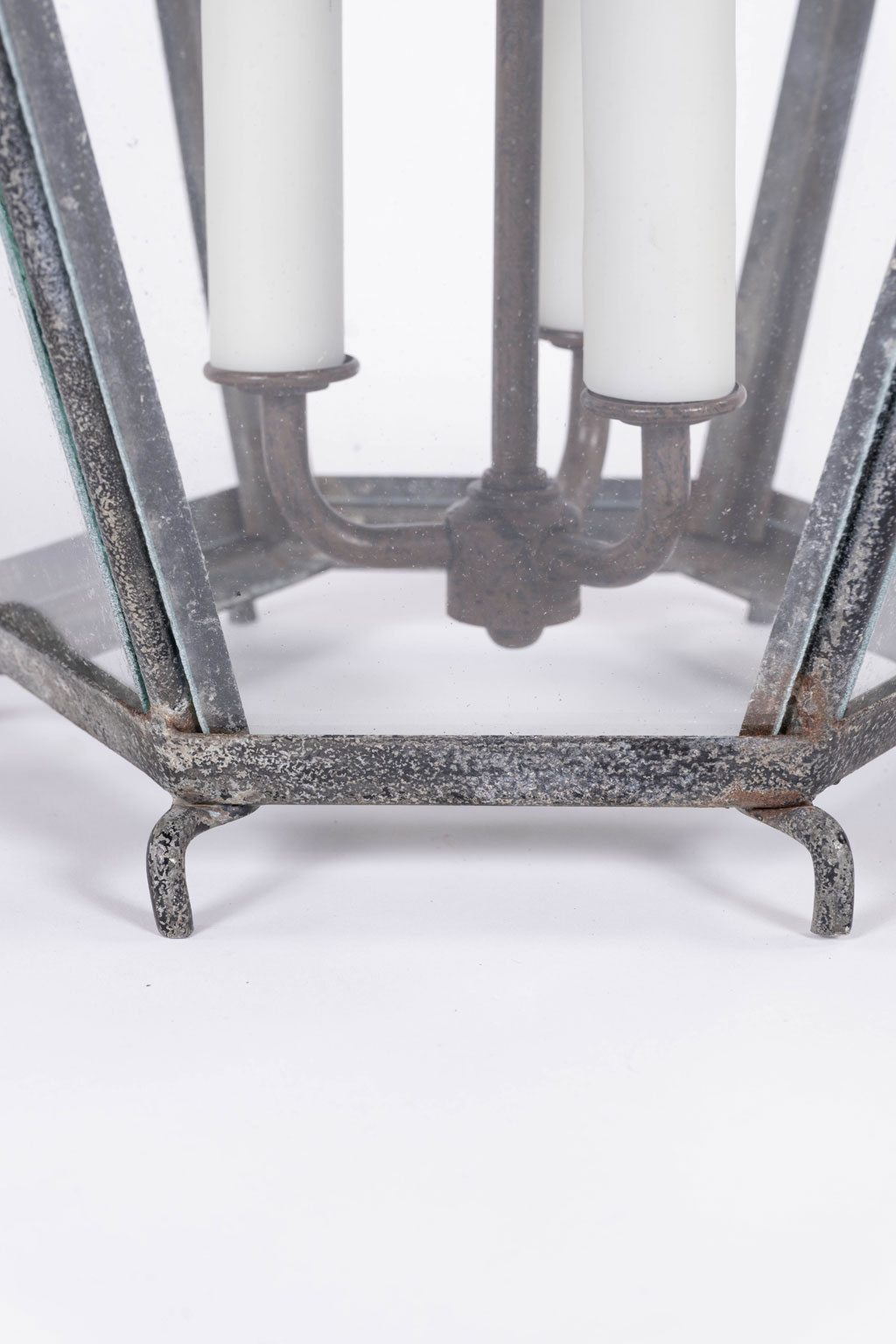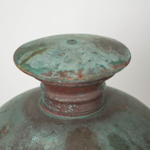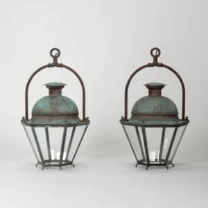 French hexagonal glass paneled domed verdigris green copper lantern dating to the early 20th century. Unwired.