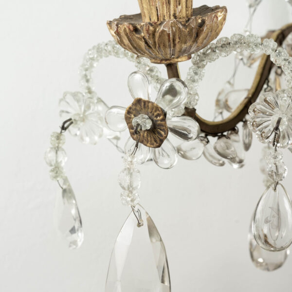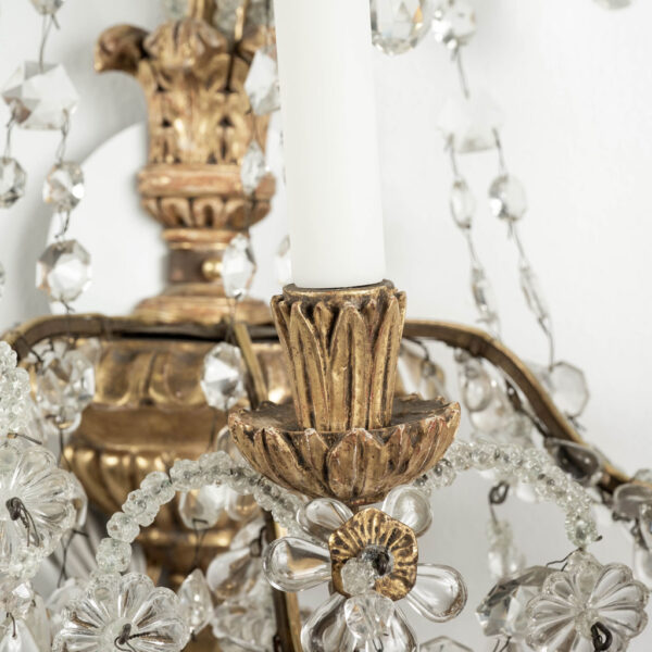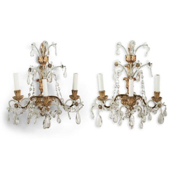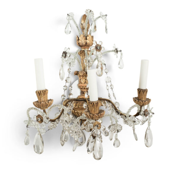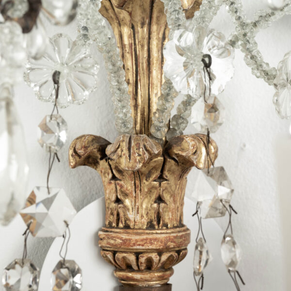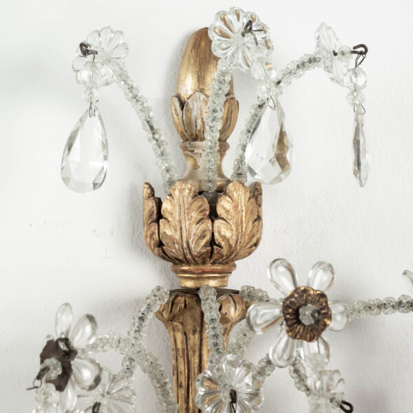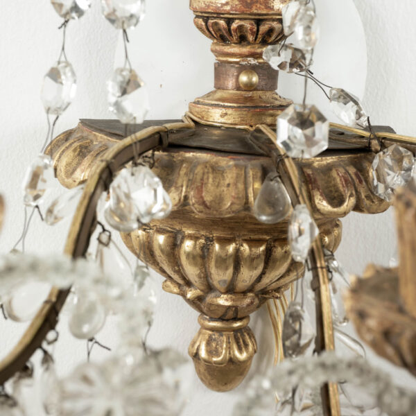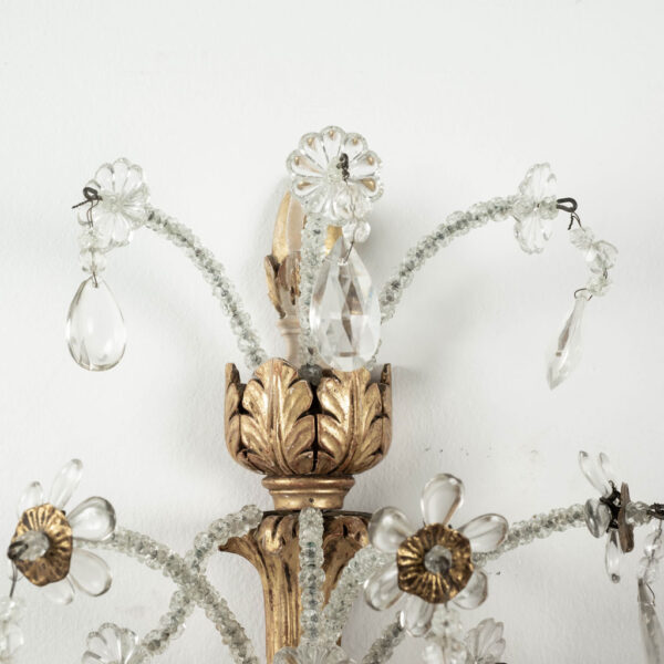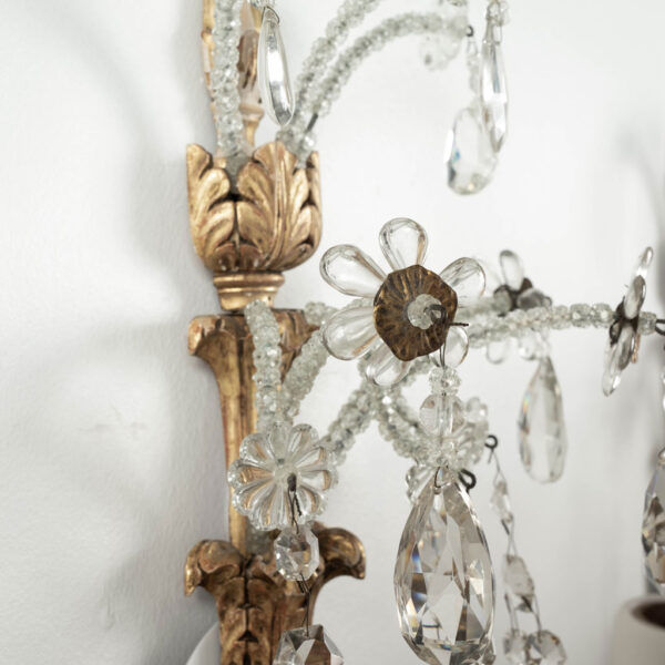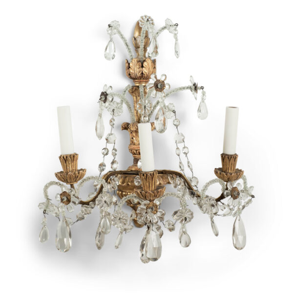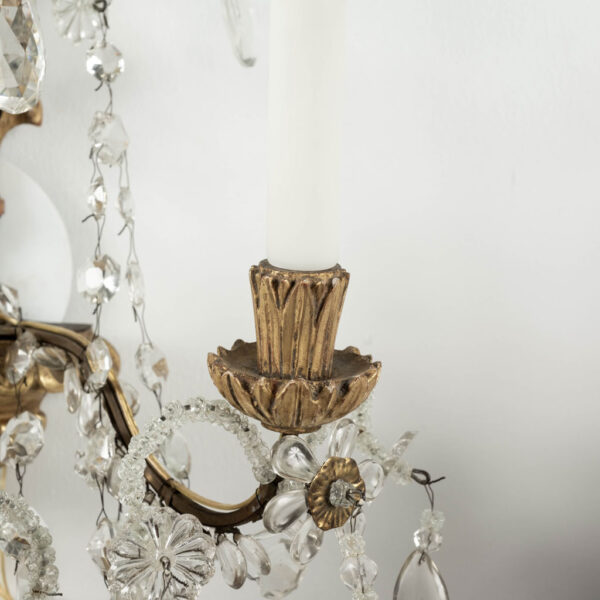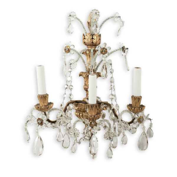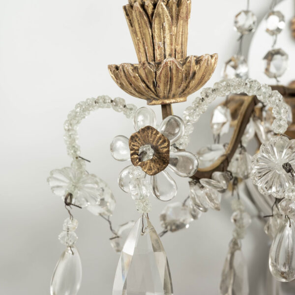 Pair of iron, crystal and carved giltwood sconces circa 1920-1939. Three arms on each sconce hold single candelabra size lights – for six total. Newly wired for use within the USA. Neutral white color back plate affixed to each sconce that can be painted your wall color or covered with your wall paper to blend seamlessly into the wall. Sold together and priced $7,800 for the pair.