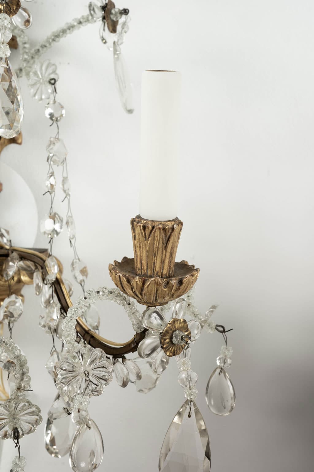 Pair of iron, crystal and carved giltwood sconces circa 1920-1939. Three arms on each sconce hold single candelabra size lights – for six total. Newly wired for use within the USA. Neutral white color back plate affixed to each sconce that can be painted your wall color or covered with your wall paper to blend seamlessly into the wall. Sold together and priced $7,800 for the pair.