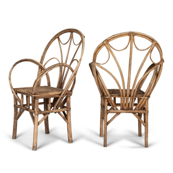 Pair of rattan armchairs circa 1950-1979. Two French armchairs constructed in willow with woven wooden seats. Sold together and priced $3,800 for the pair.