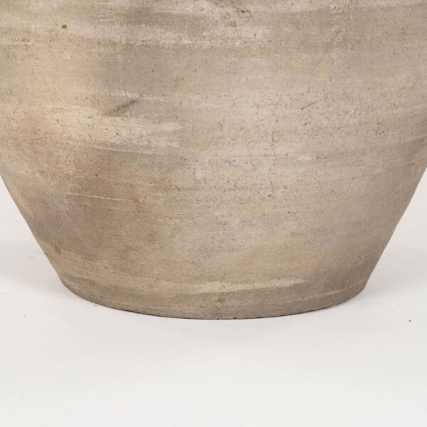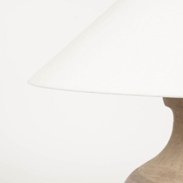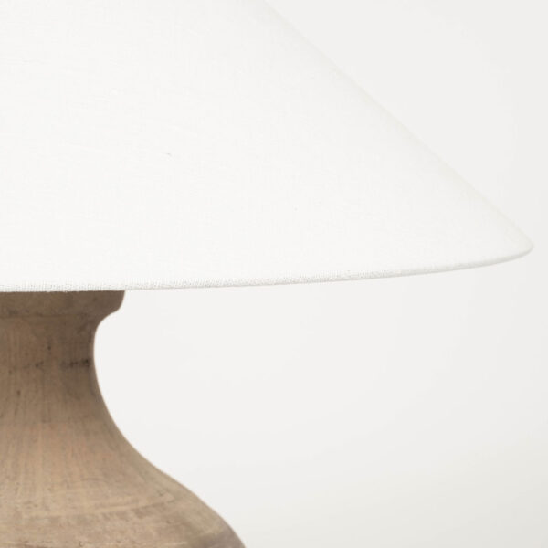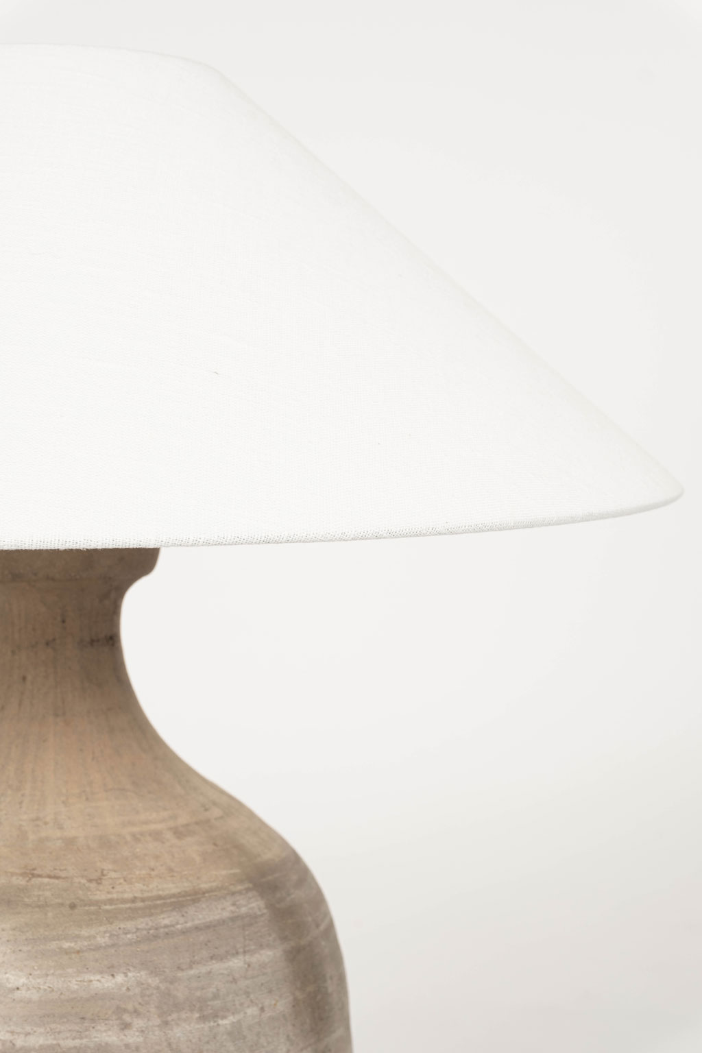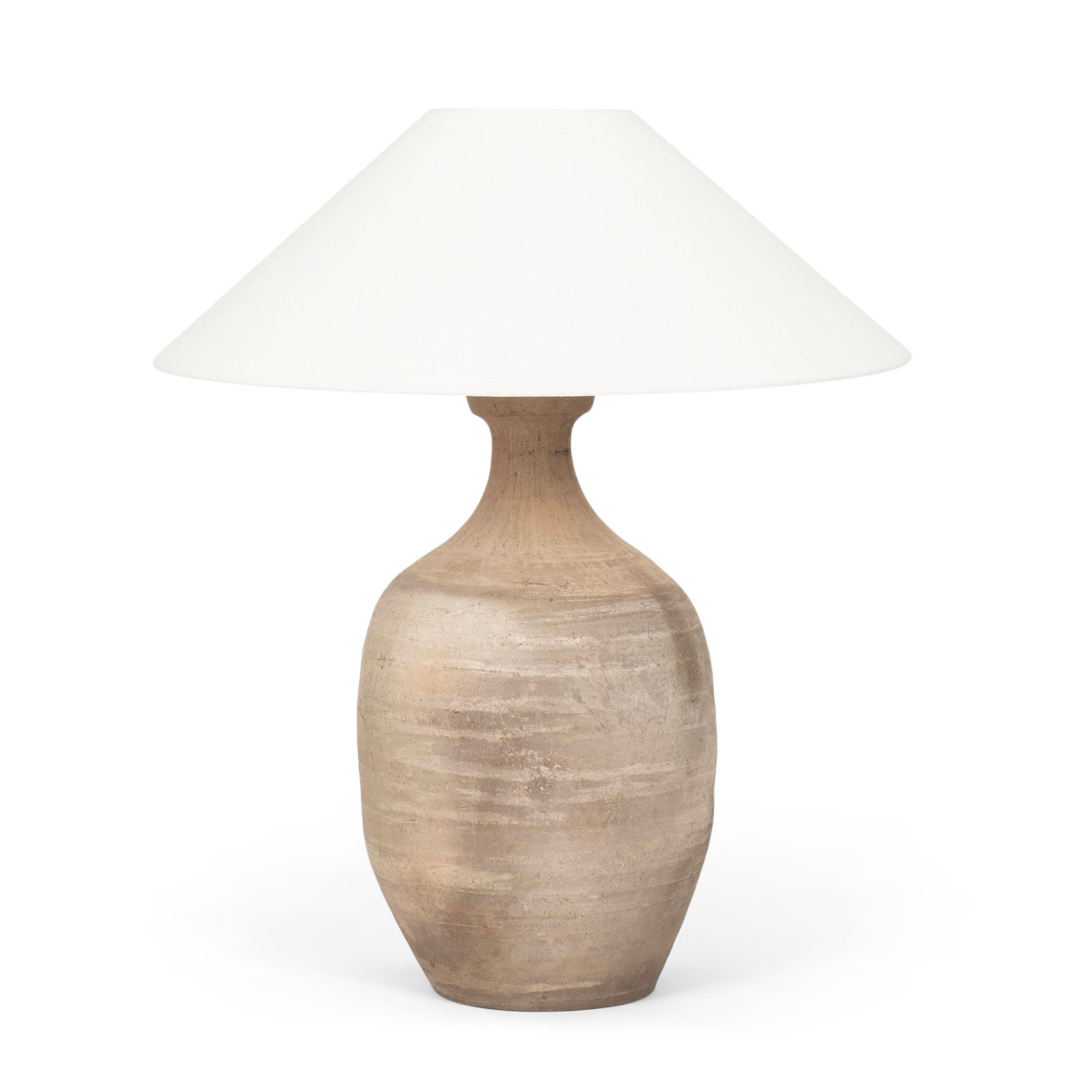 Pottery vessel lamp with off-white linen coolie shade. Newly wired for use within the USA with a line switch.