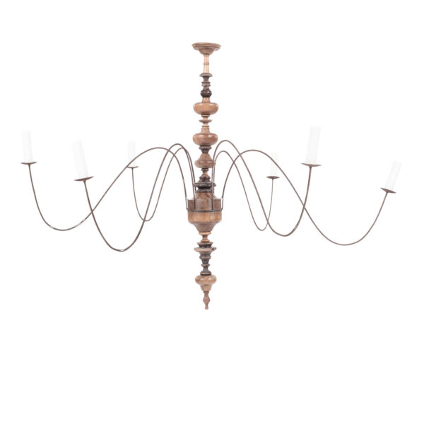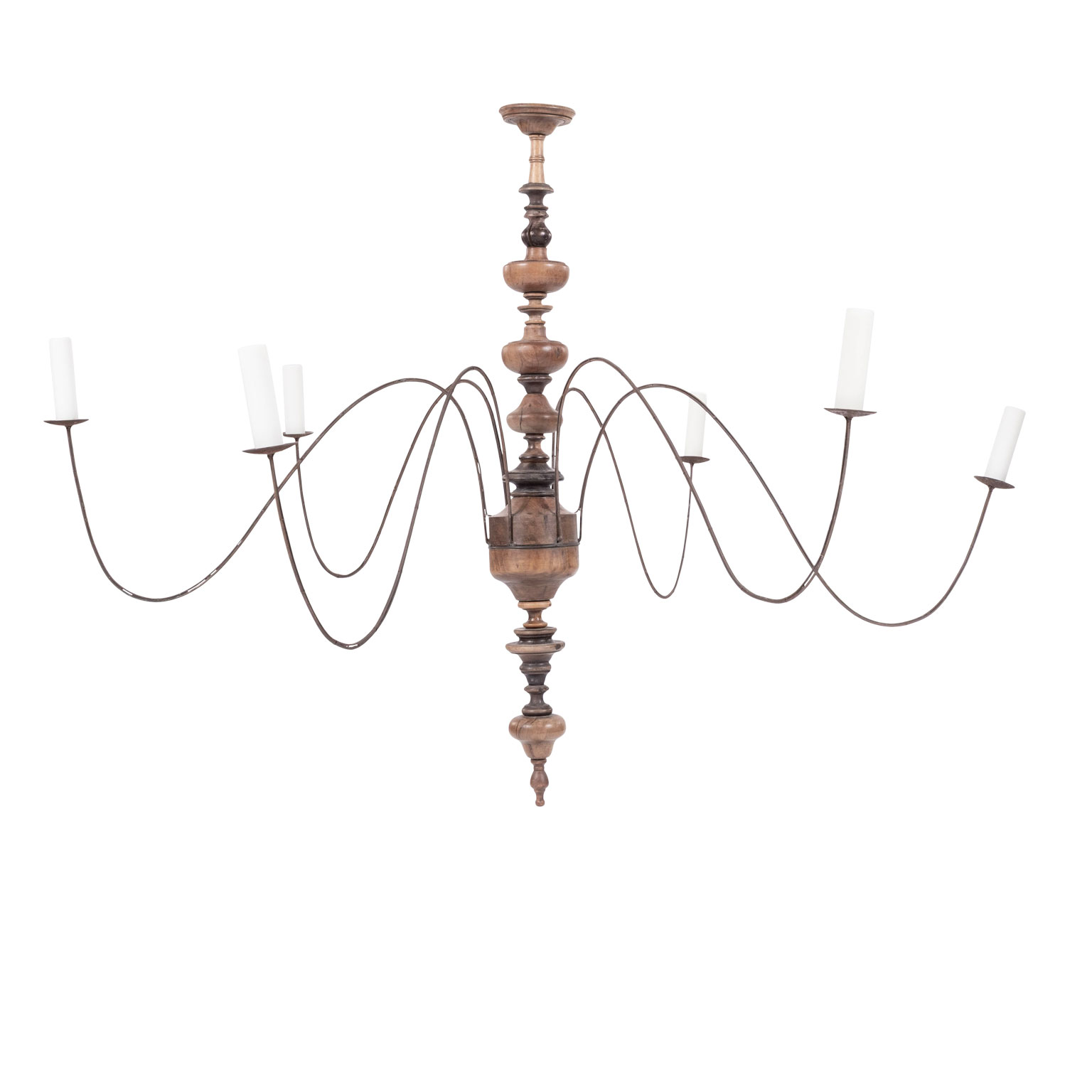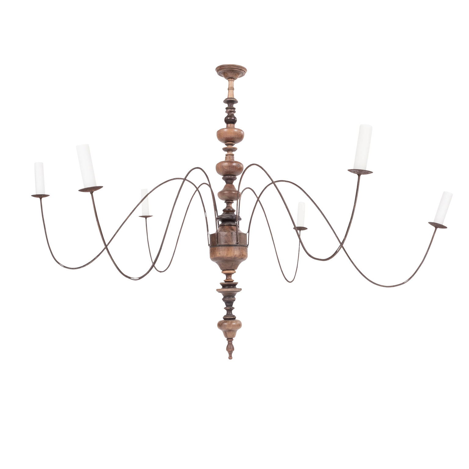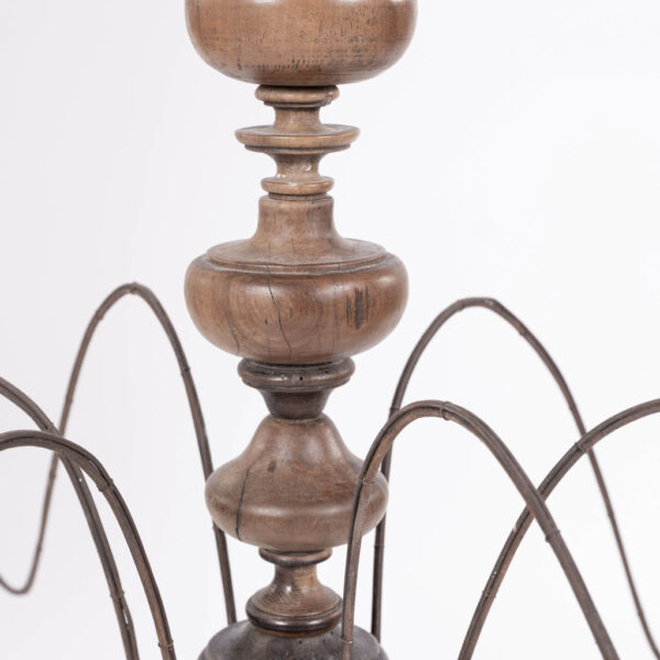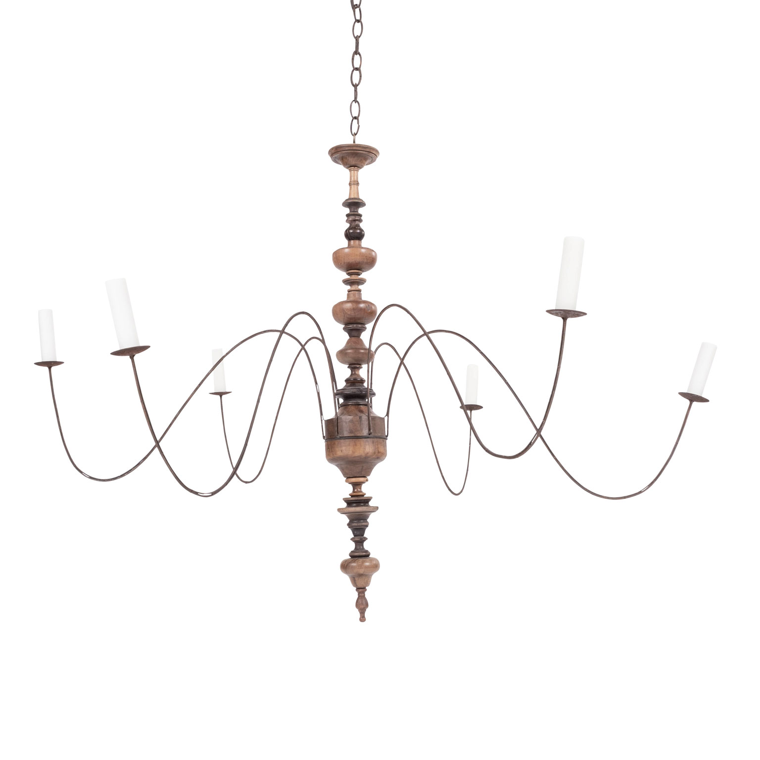 Six-arm fruitwood Italian chandelier, hand-carved and turned from fruitwood, Graceful wirey iron arms. Newly-wired for use within the USA. Each arm supports a candelabra-size socket for bulb. Includes four feet of chain and a canopy (listed measurements do not include chain). Newly made from antique fruitwood body and later elements.