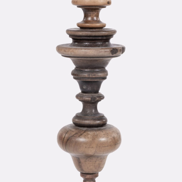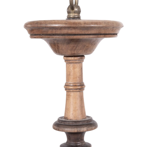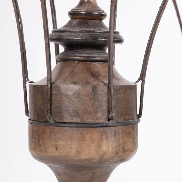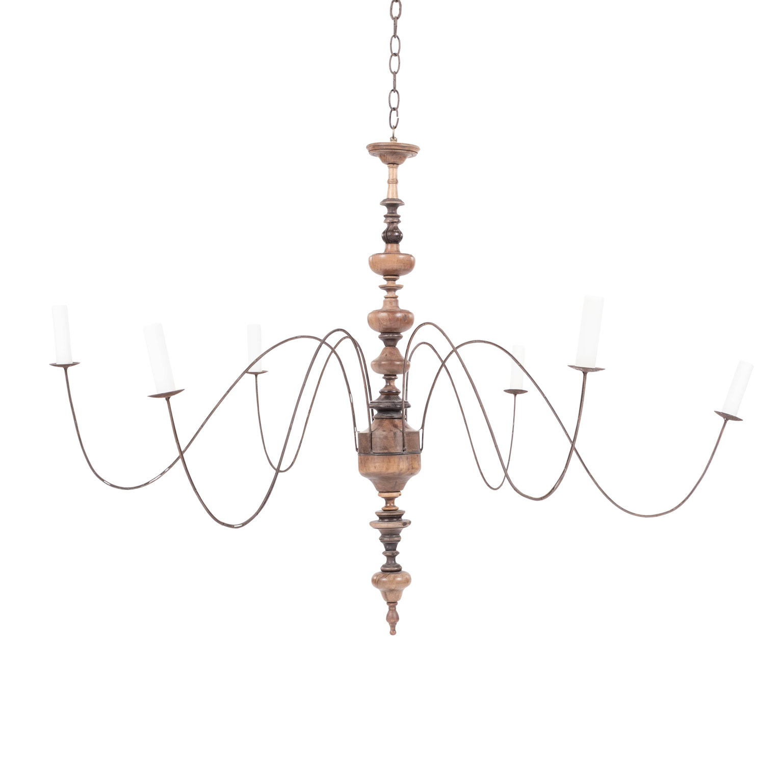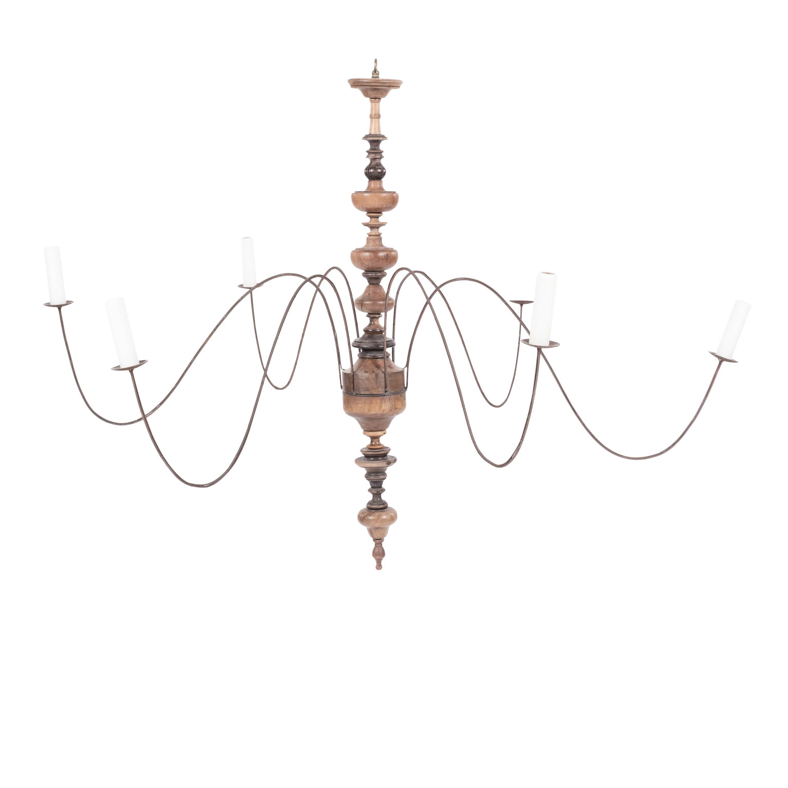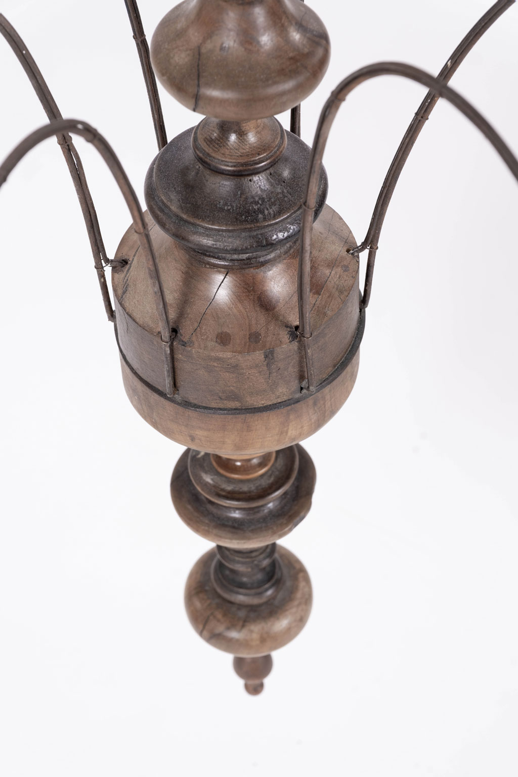 Six-arm fruitwood Italian chandelier, hand-carved and turned from fruitwood, Graceful wirey iron arms. Newly-wired for use within the USA. Each arm supports a candelabra-size socket for bulb. Includes four feet of chain and a canopy (listed measurements do not include chain). Newly made from antique fruitwood body and later elements.