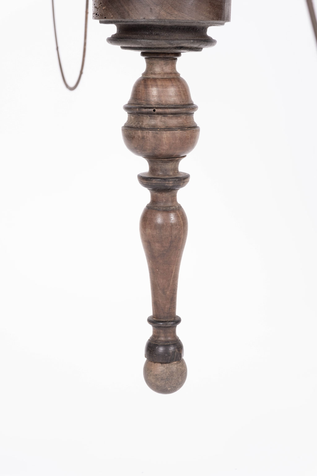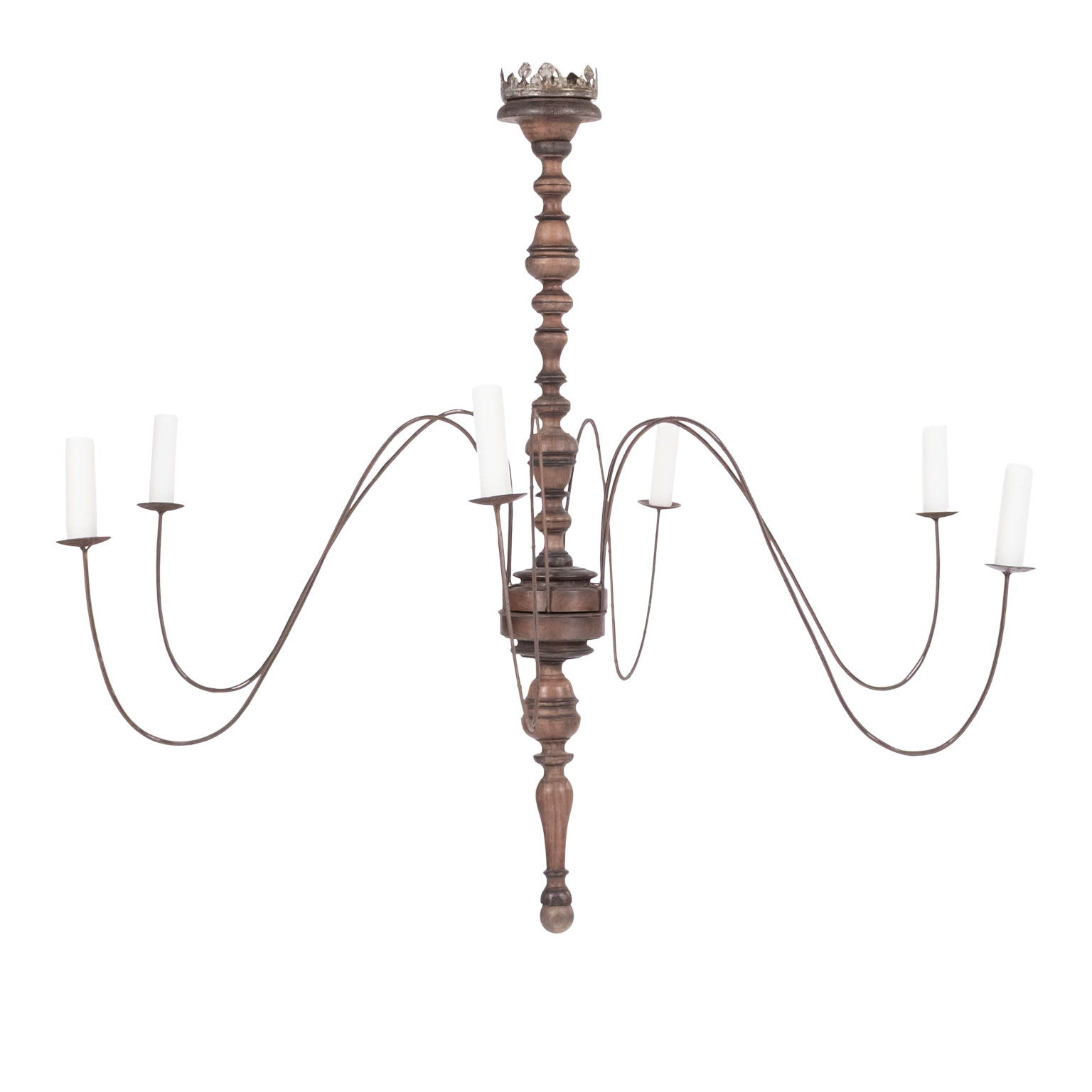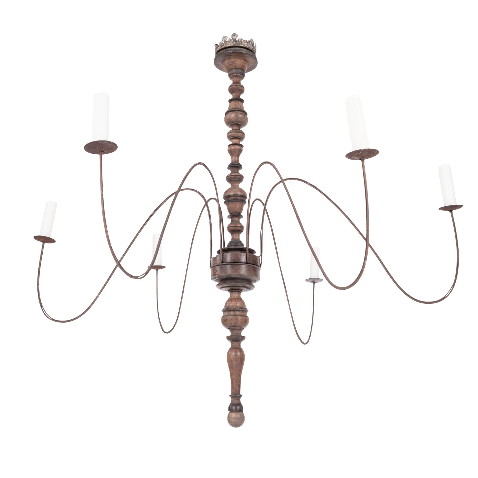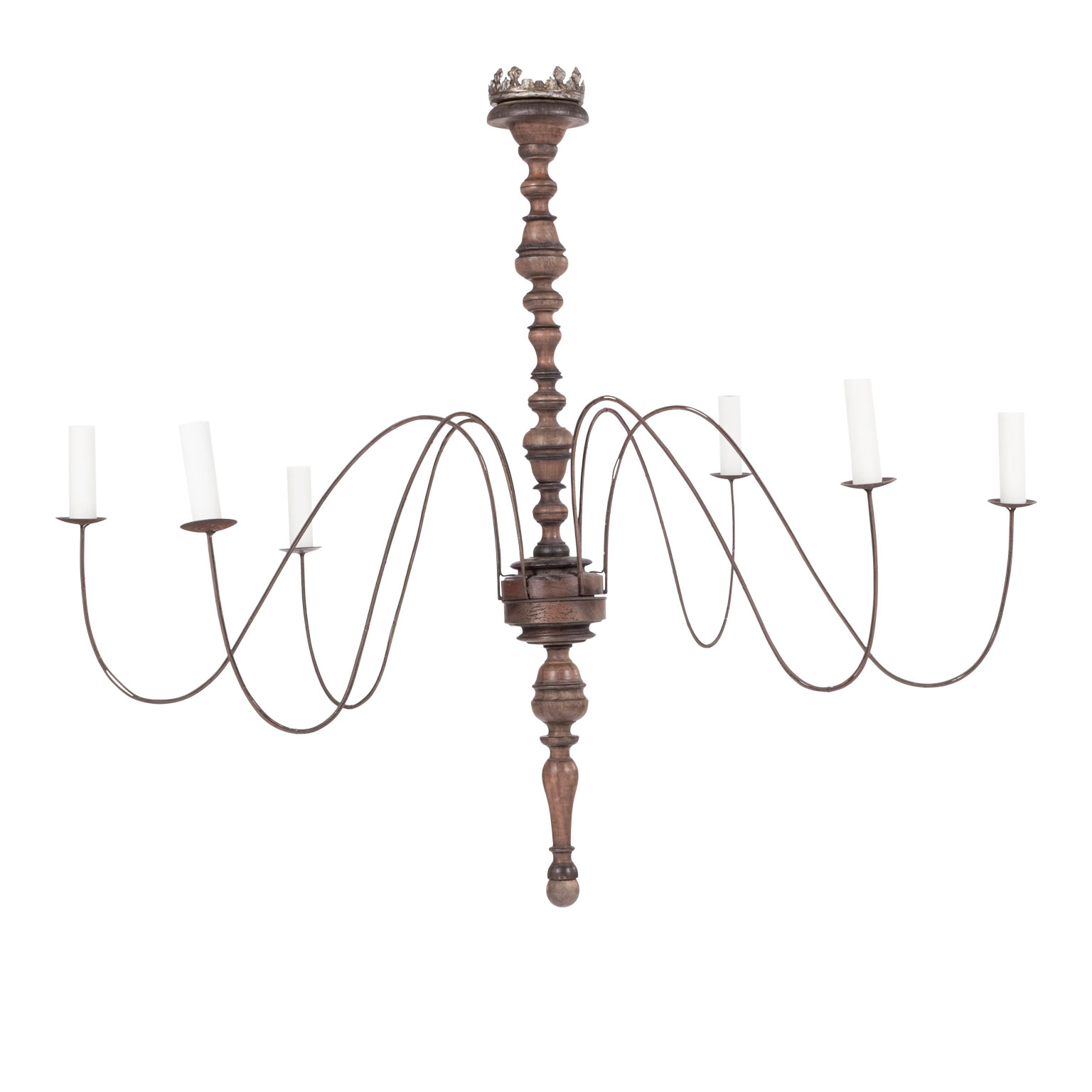 Six-arm walnut Italian chandelier, hand-carved and turned from walnut, Graceful wirey iron arms. Topped by a reticulated gilt tole repousse crown. Newly-wired for use within the USA. Each arm supports a candelabra-size socket for bulb. Includes four feet of chain and a canopy (listed measurements do not include chain). Newly made from antique fruitwood body and later elements.