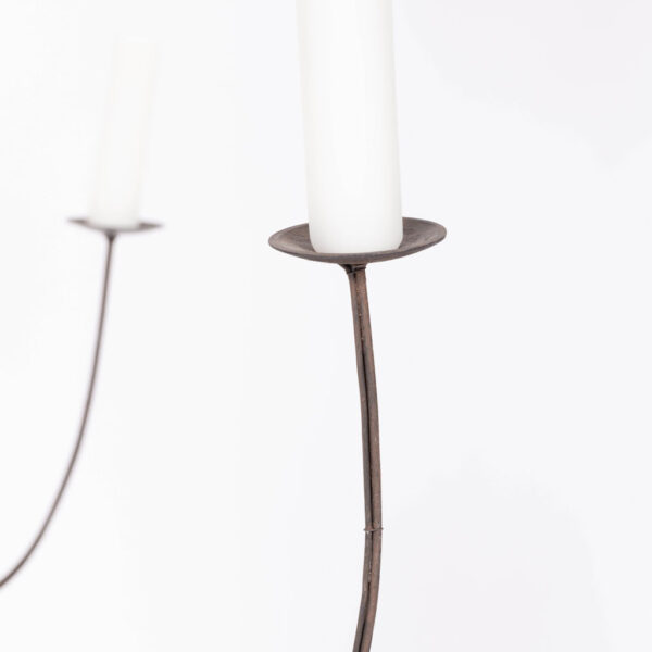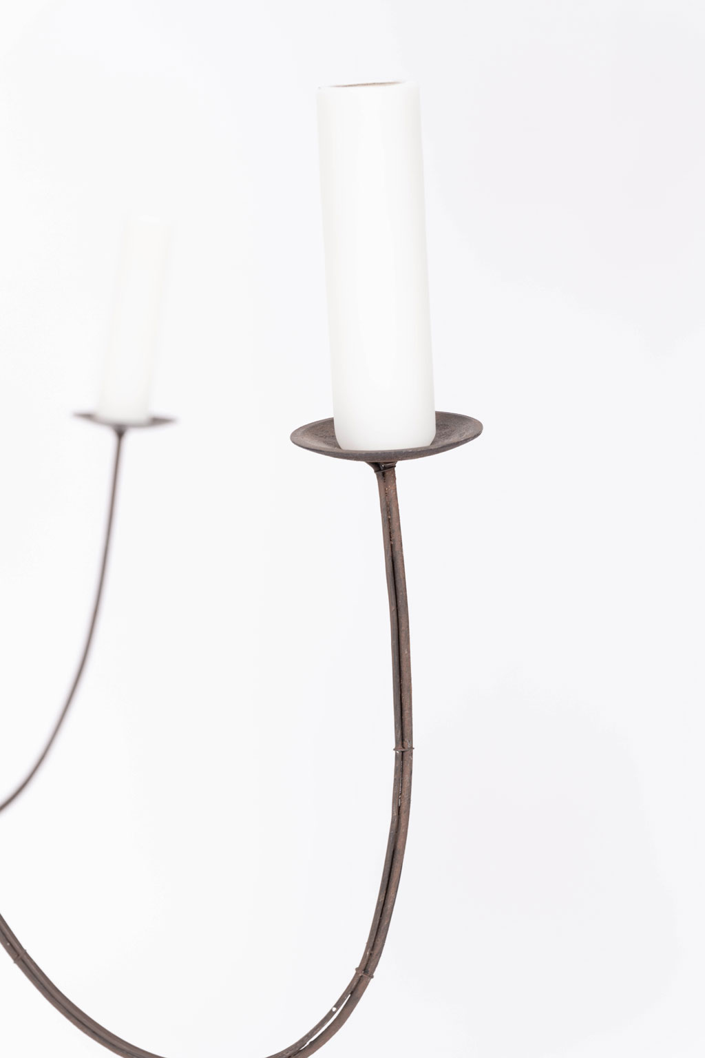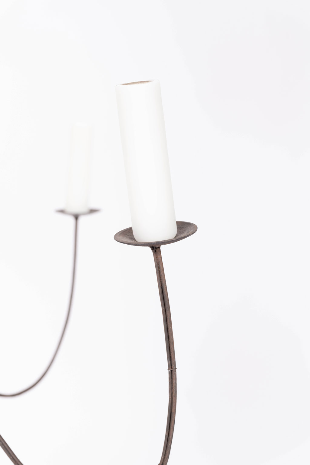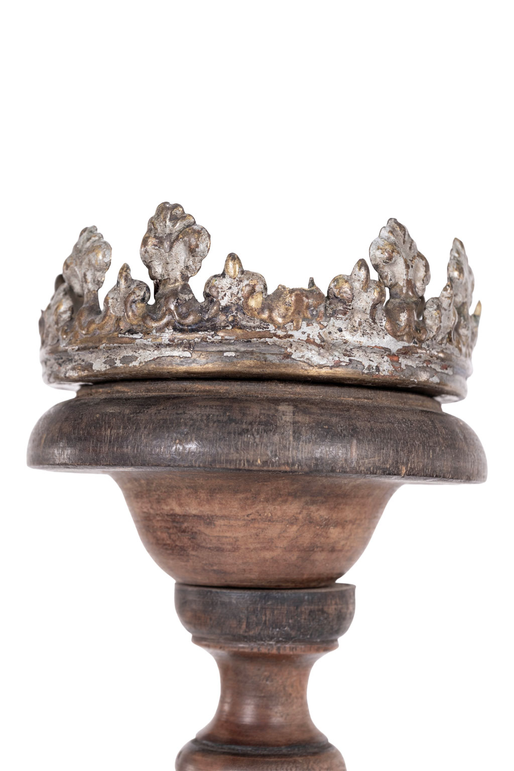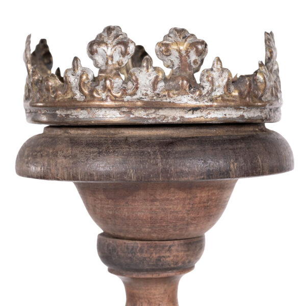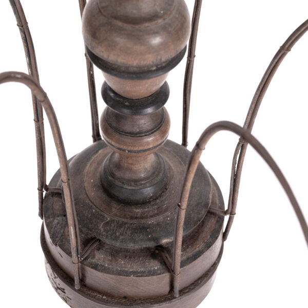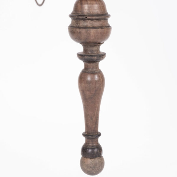 Six-arm walnut Italian chandelier, hand-carved and turned from walnut, Graceful wirey iron arms. Topped by a reticulated gilt tole repousse crown. Newly-wired for use within the USA. Each arm supports a candelabra-size socket for bulb. Includes four feet of chain and a canopy (listed measurements do not include chain). Newly made from antique fruitwood body and later elements.